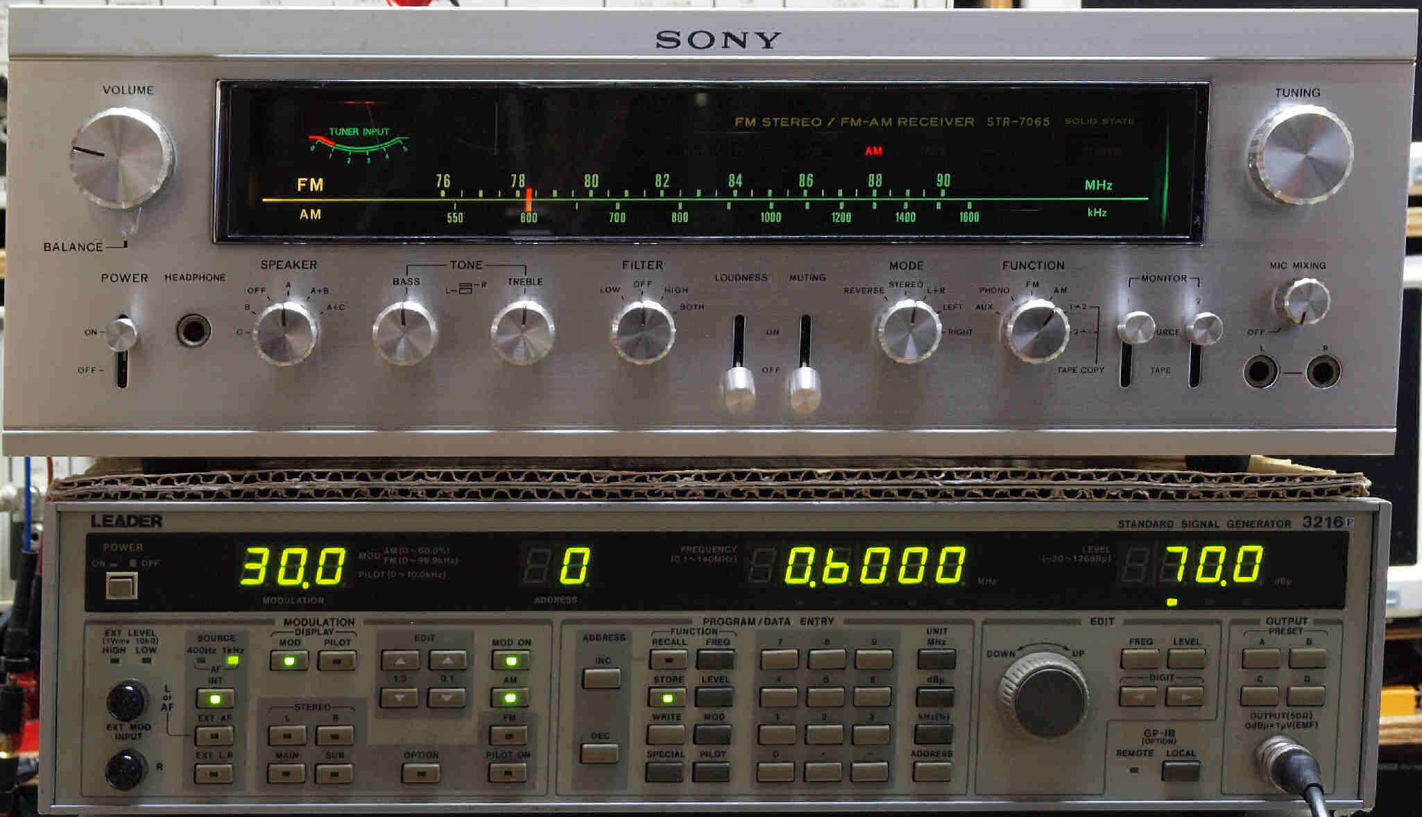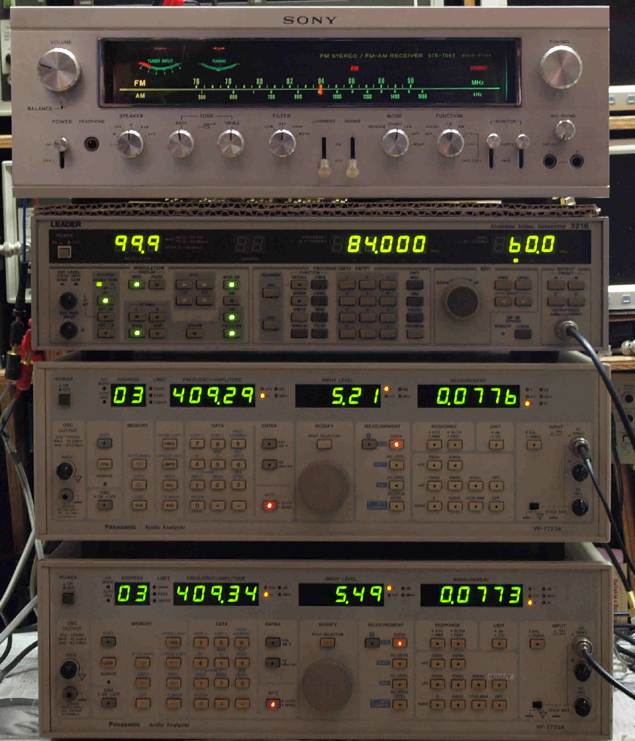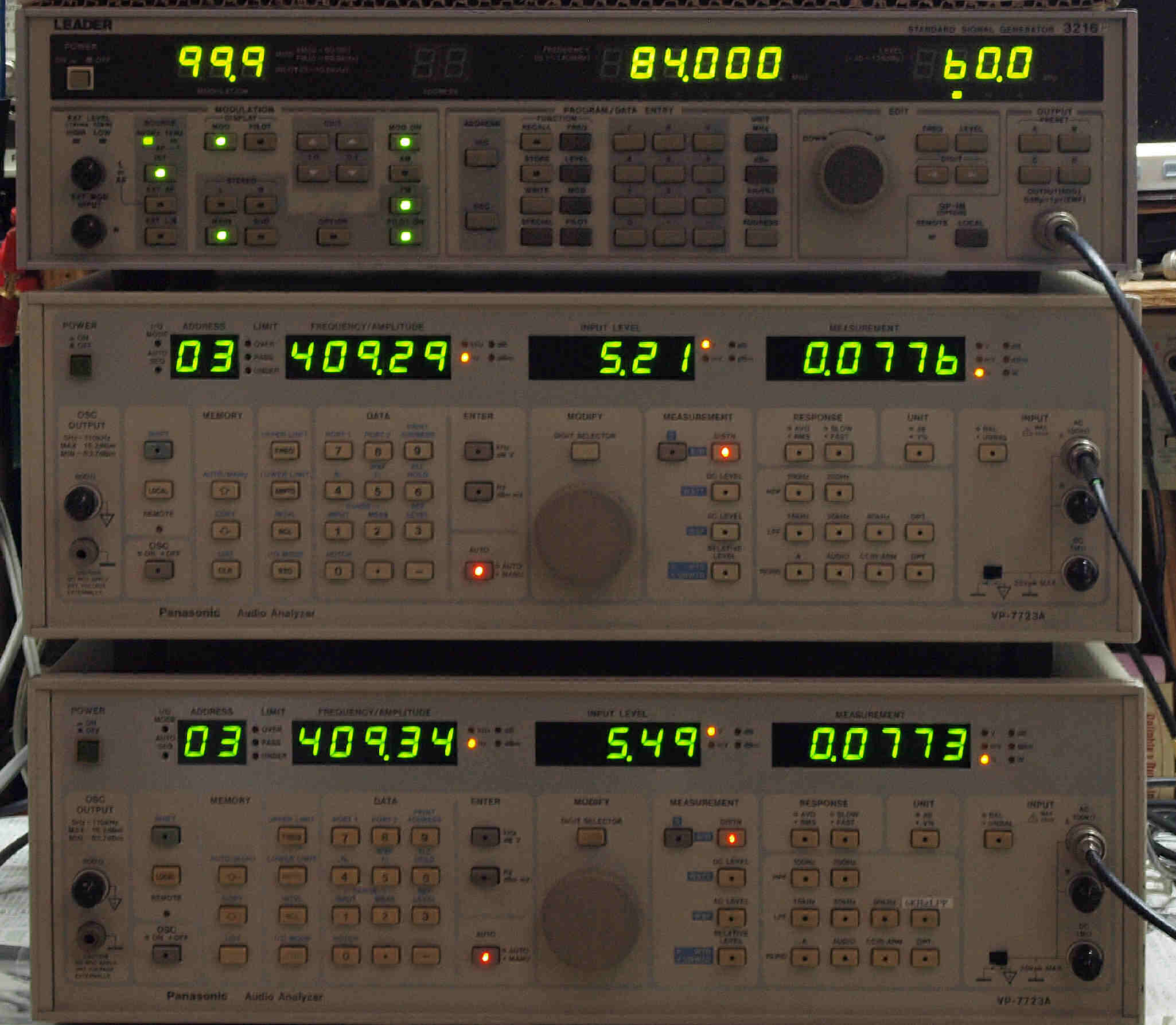 | G. 調整・測定 FM受信感度、RL分離測定調整 <見方> 上=「LEADER 3216P FMステレオ信号発信器」より信号を出す。これを受信し出力を測定する。 表示LED、 左端=変調度、 中左=メモリNo、 中右=出力周波数、 右端=出力レベル。 中=R側出力測定。 「Audio Analyzer Panasonic VP−7723A」より測定。 表示LED、 左端=メモリーNo、中左=周波数測定、中右=出力電圧測定、右端=歪み率測定。 下=L側出力測定。 「Audio Analyzer Panasonic VP−7723A」より測定。 表示LED、 左端=メモリーNo、中左=周波数測定、中右=出力電圧測定、右端=歪み率測定。 |