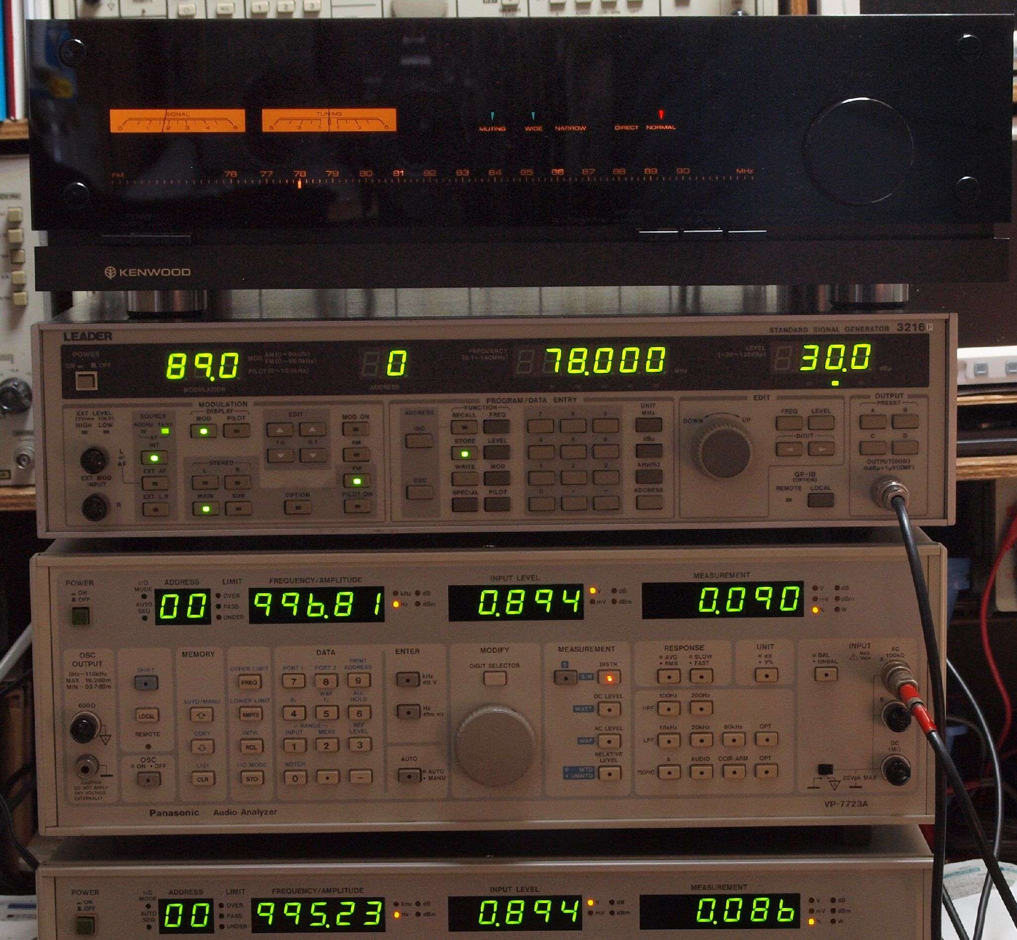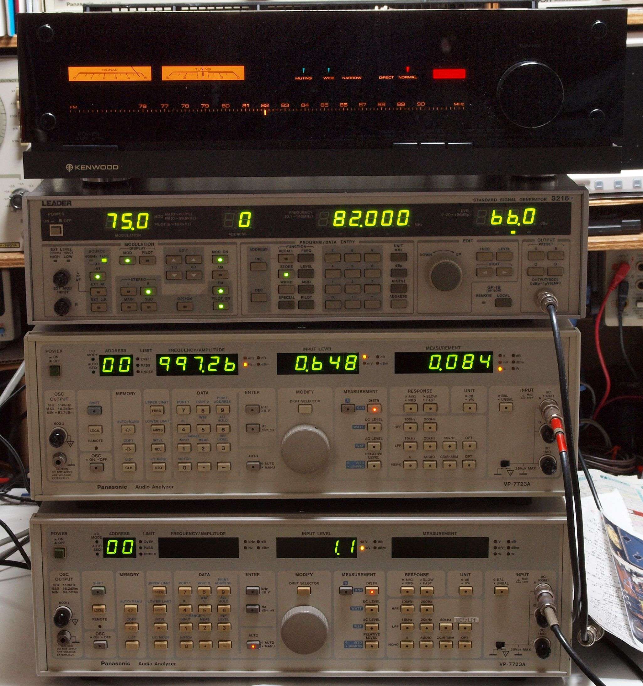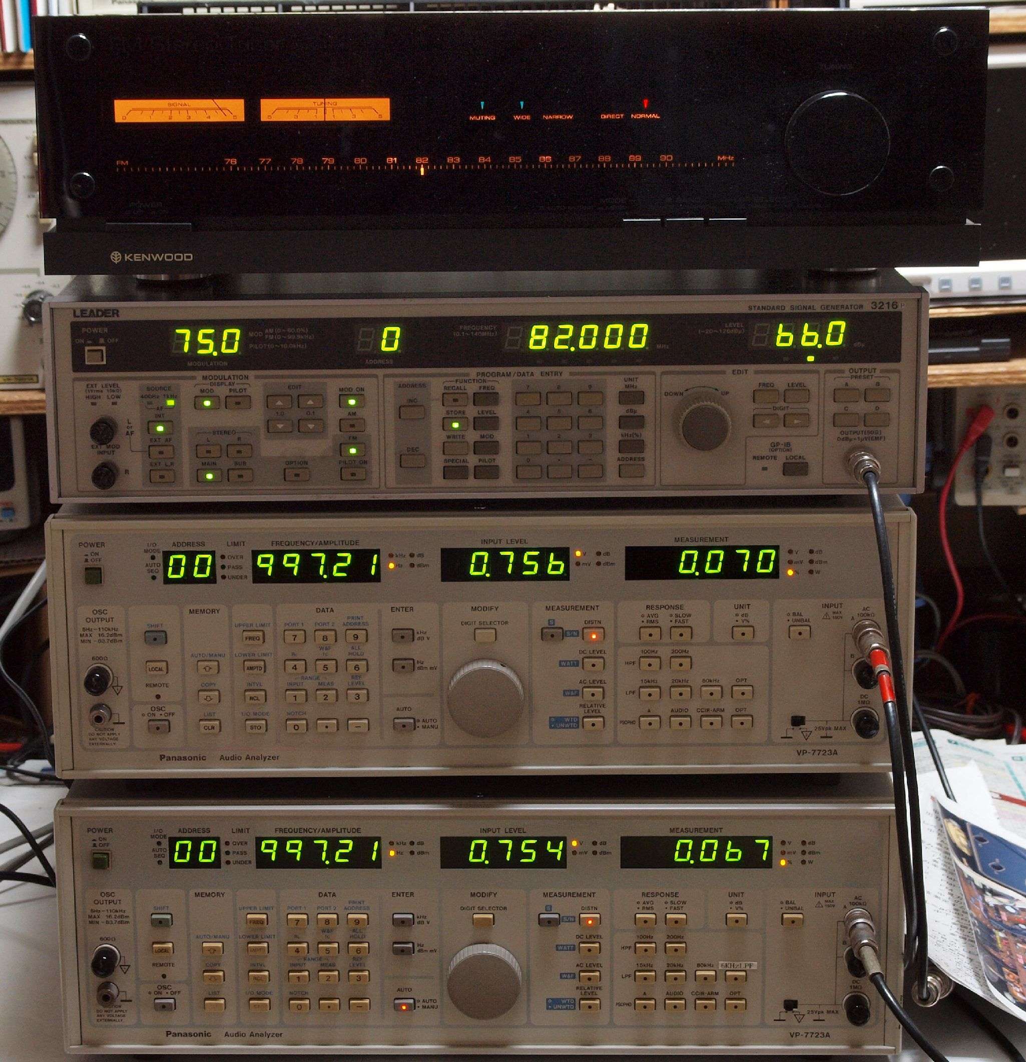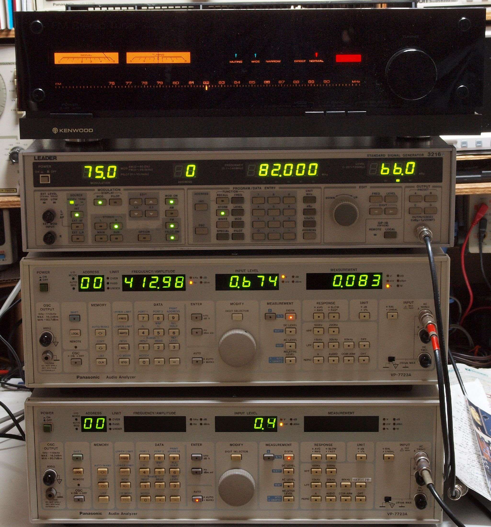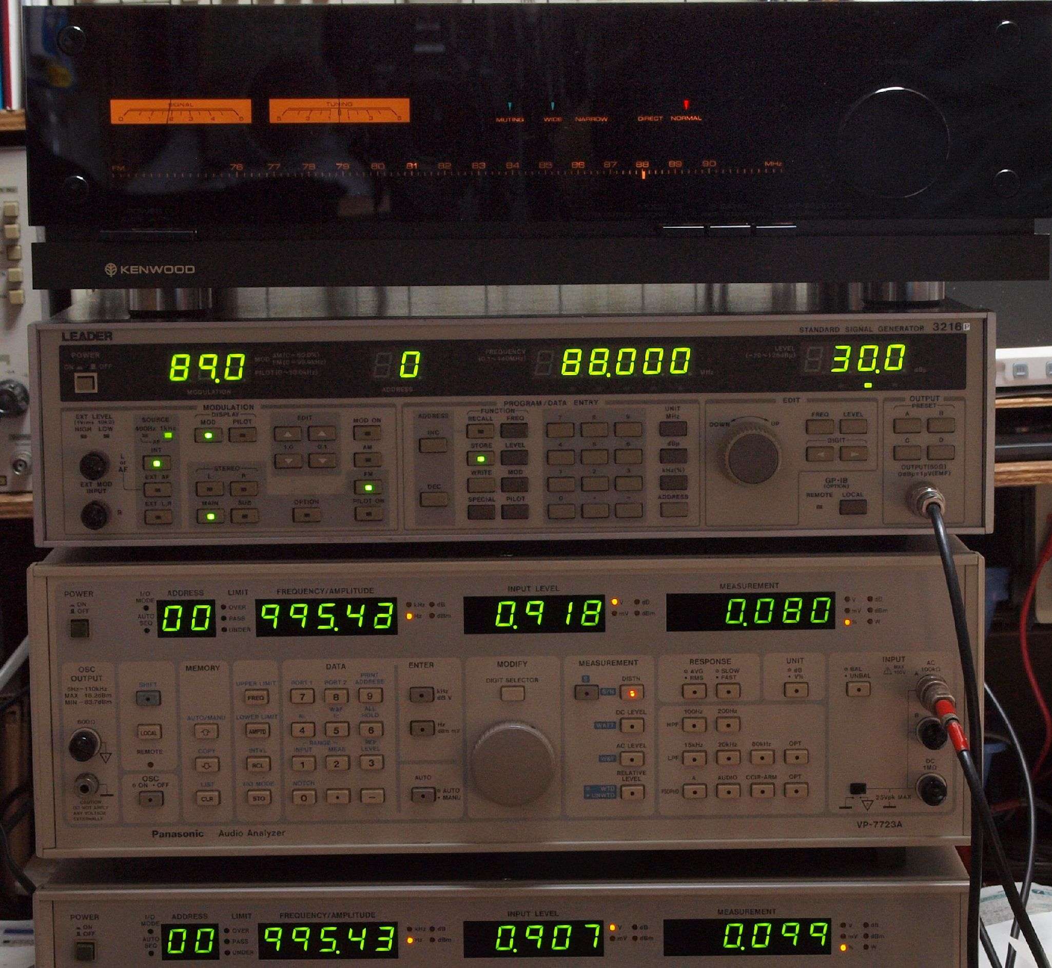 | E. 調整・測定、 FM受信感度、RL分離測定調整。 画像をクリックすると、大きく(横幅2050ドット)表示されます。 <見方> 中上の「LEADER 3216P FMステレオ信号発信器」より信号を出す。これを受信し出力を測定する。 表示LED、 左端=変調度、 中左=メモリNo、 中右=出力周波数、 右端=出力レベル。 中下=R出力測定。 「Audio Analyzer Panasonic VP−7723B」より測定。 表示LED、 左端=メモリーNo、中左=周波数測定、中右=出力電圧測定、右端=歪み率測定。 下=L出力測定。 「Audio Analyzer Panasonic VP−7723B」より測定。 表示LED、 左端=メモリーNo、中左=周波数測定、中右=出力電圧測定、右端=歪み率測定。 チューナの出力電圧は固定を使用。 |