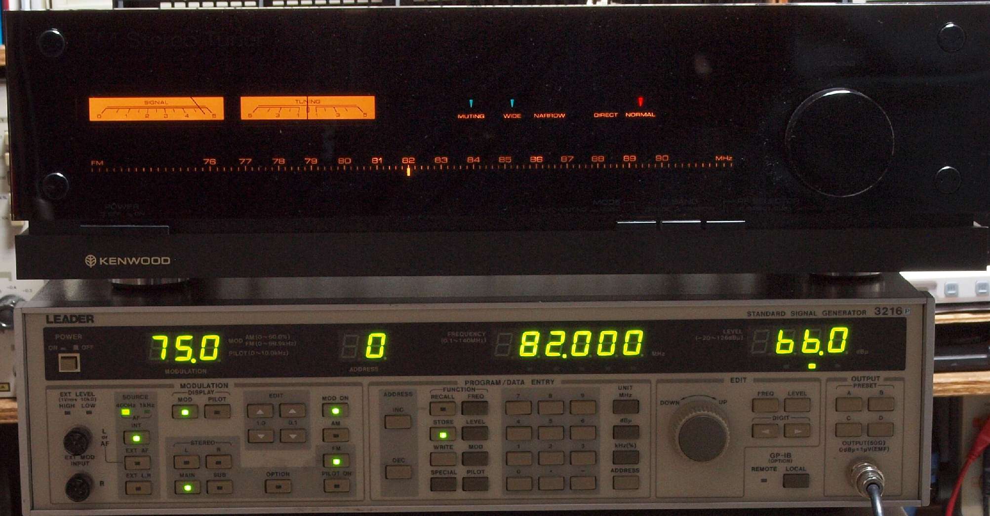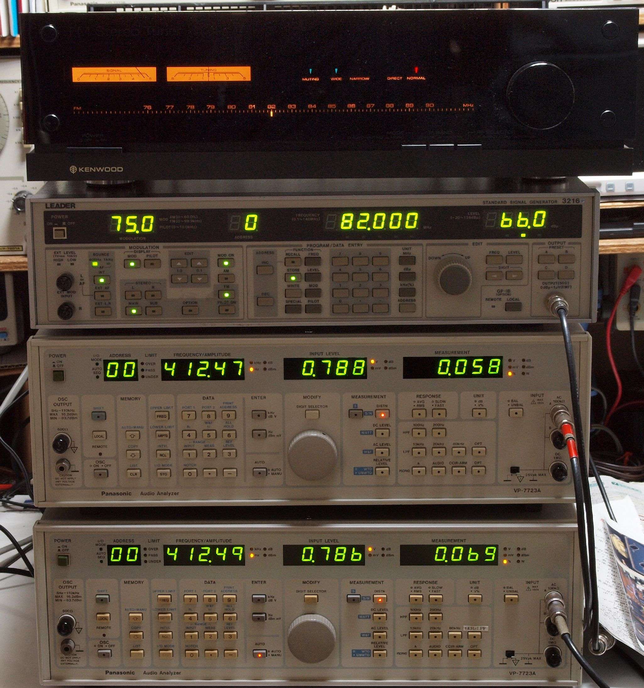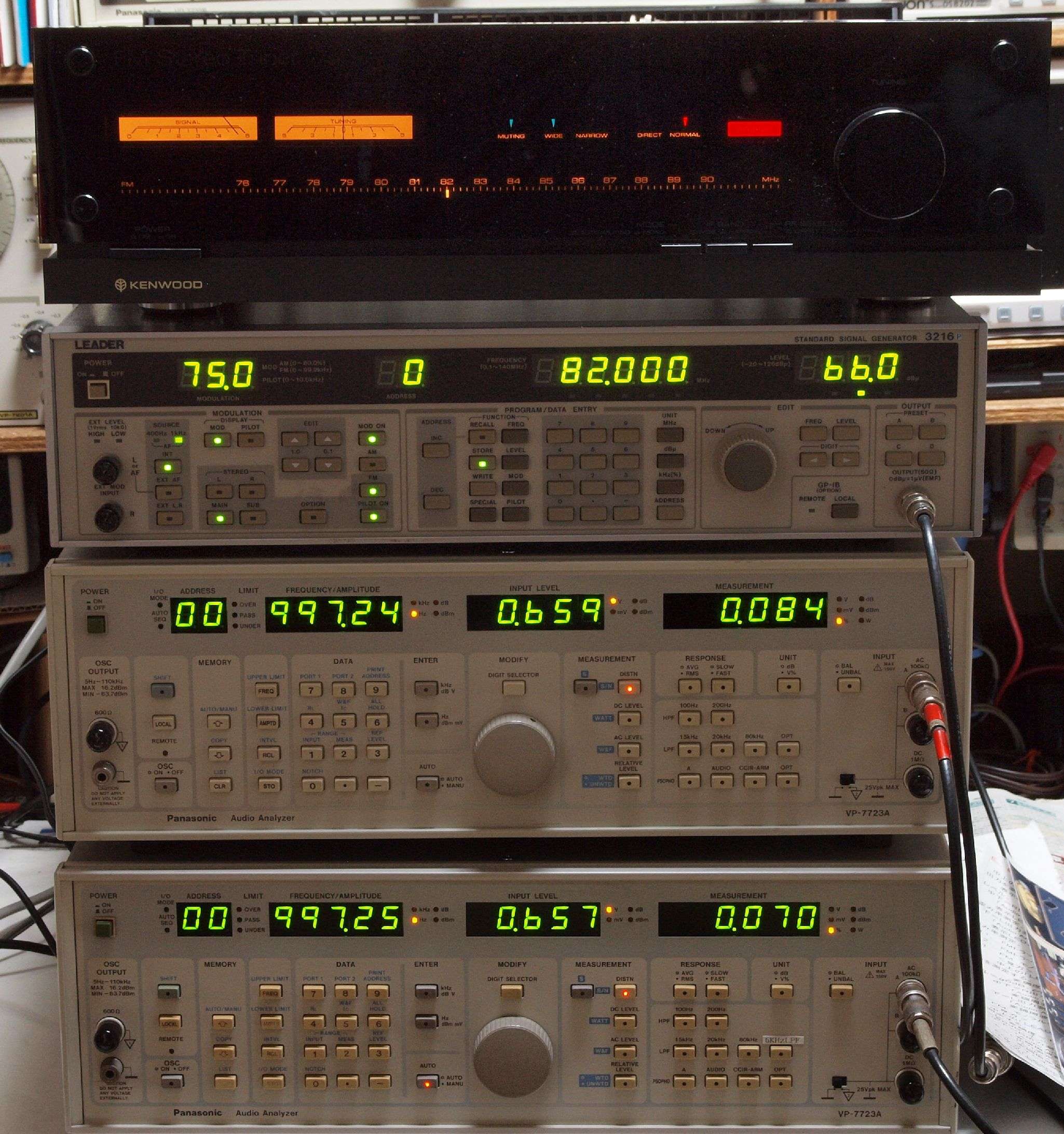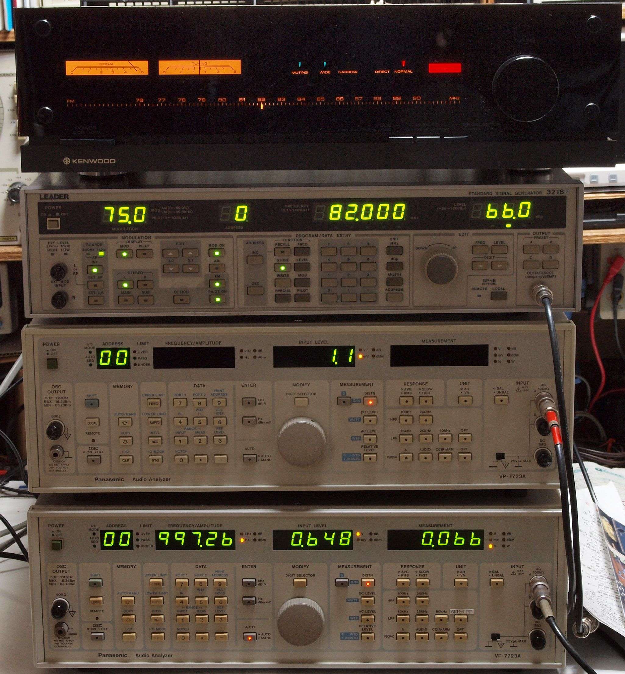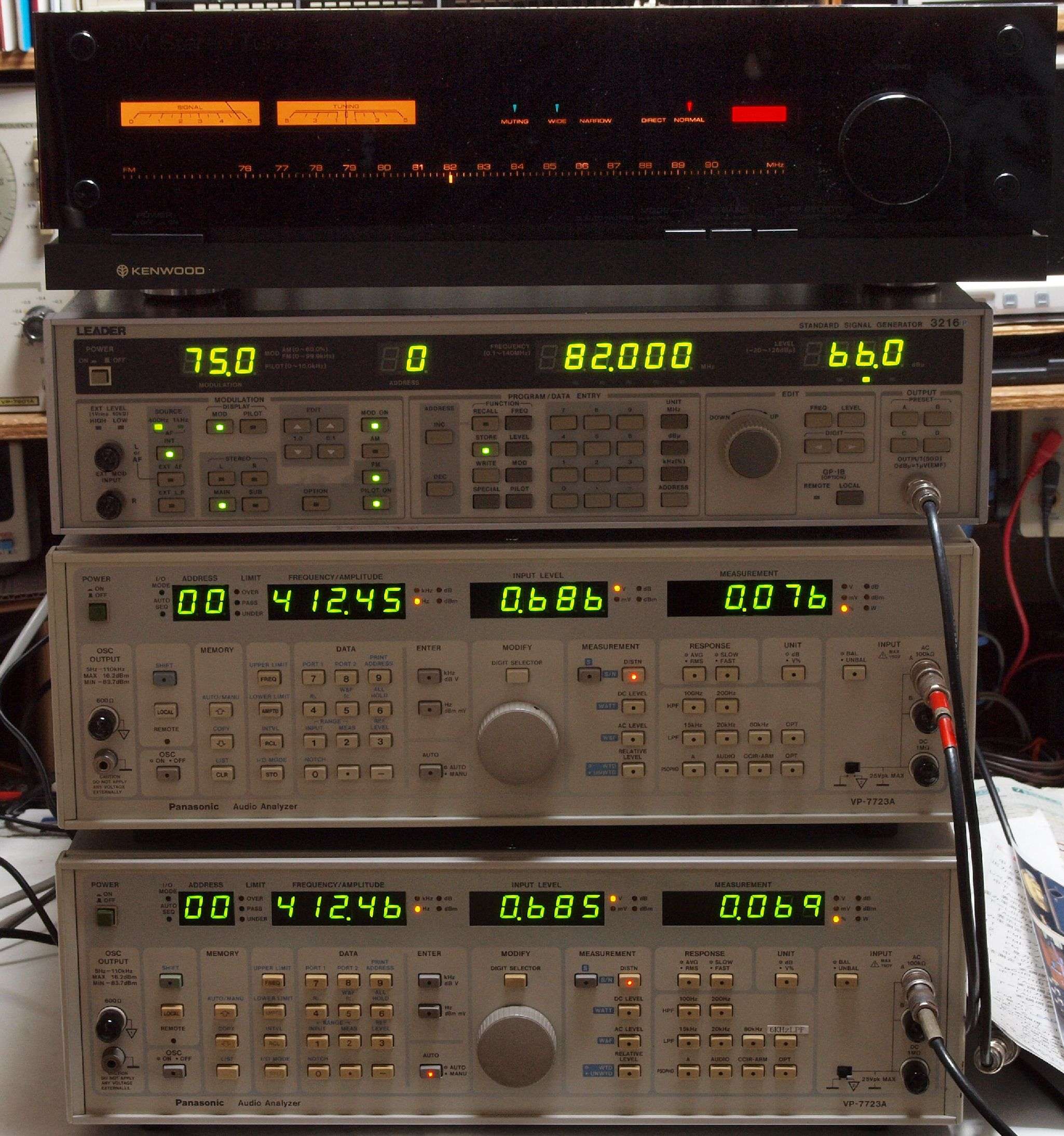 | E. 調整・測定、 FM受信感度、RL分離測定調整。 画像をクリックすると、大きく(横幅2050ドット)表示されます。 <見方> 中上の「LEADER 3216P FMステレオ信号発信器」より信号を出す。これを受信し出力を測定する。 表示LED、 左端=変調度、 中左=メモリNo、 中右=出力周波数、 右端=出力レベル。 中下=R出力測定。 「Audio Analyzer Panasonic VP−7723B」より測定。 表示LED、 左端=メモリーNo、中左=周波数測定、中右=出力電圧測定、右端=歪み率測定。 下=L出力測定。 「Audio Analyzer Panasonic VP−7723B」より測定。 表示LED、 左端=メモリーNo、中左=周波数測定、中右=出力電圧測定、右端=歪み率測定。 チューナの出力電圧は固定を使用。 |