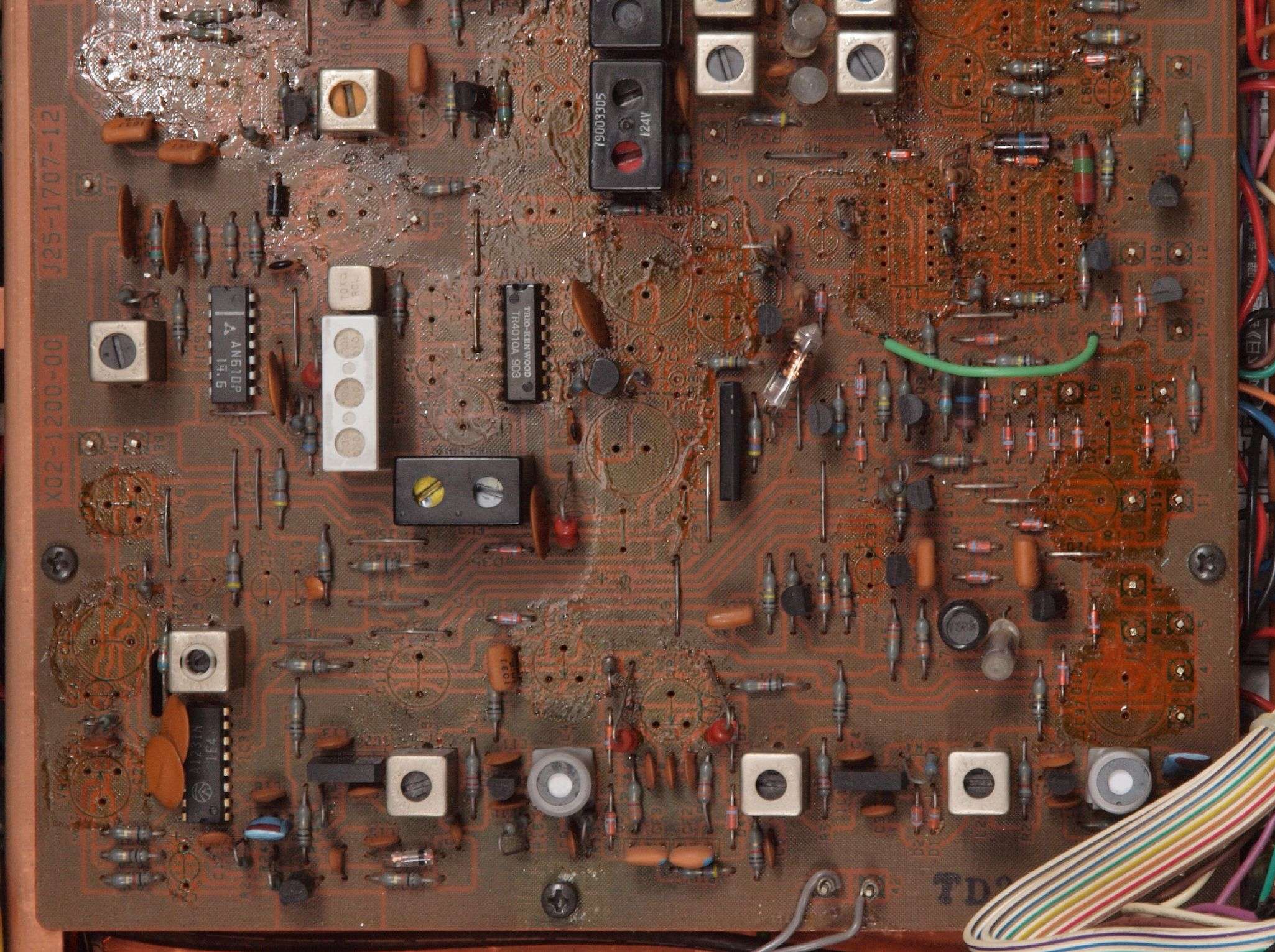 | C112. 修理中 電源基板、電解コンデンサーを固定した接着材、トルエンを使用したのでしょう、金属を腐食します。 | ||||||||||||||||||||||||||||||||||||||||||||
