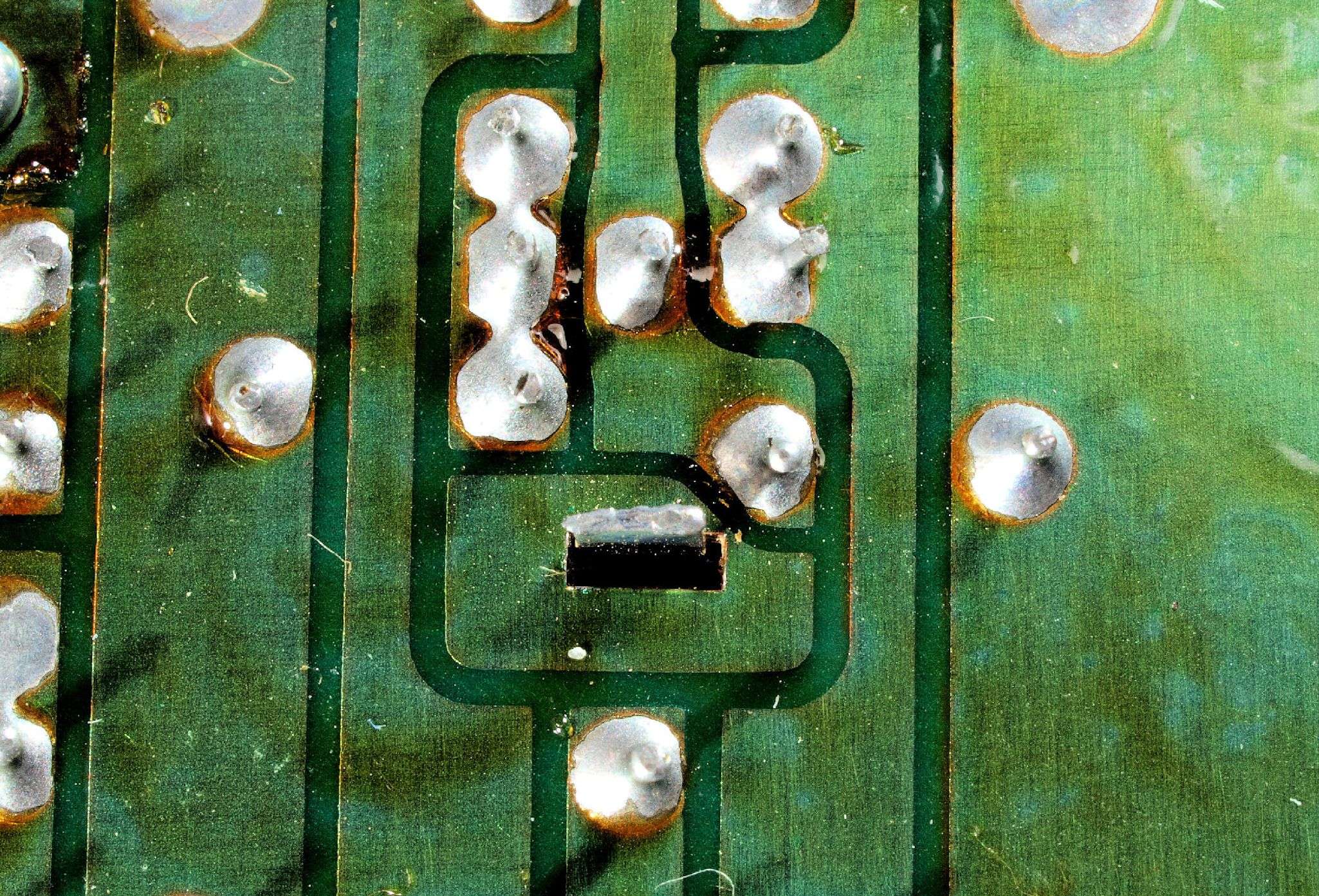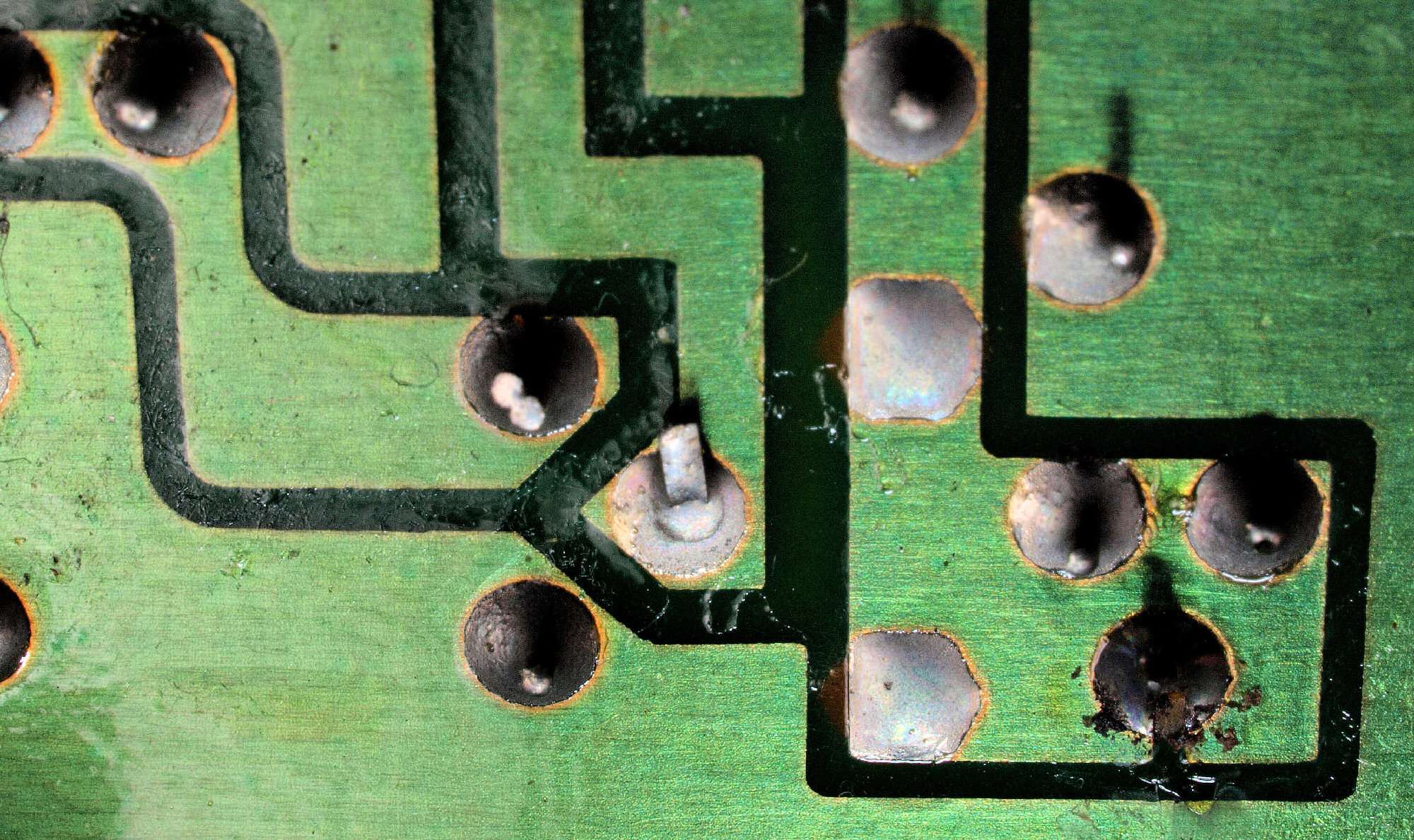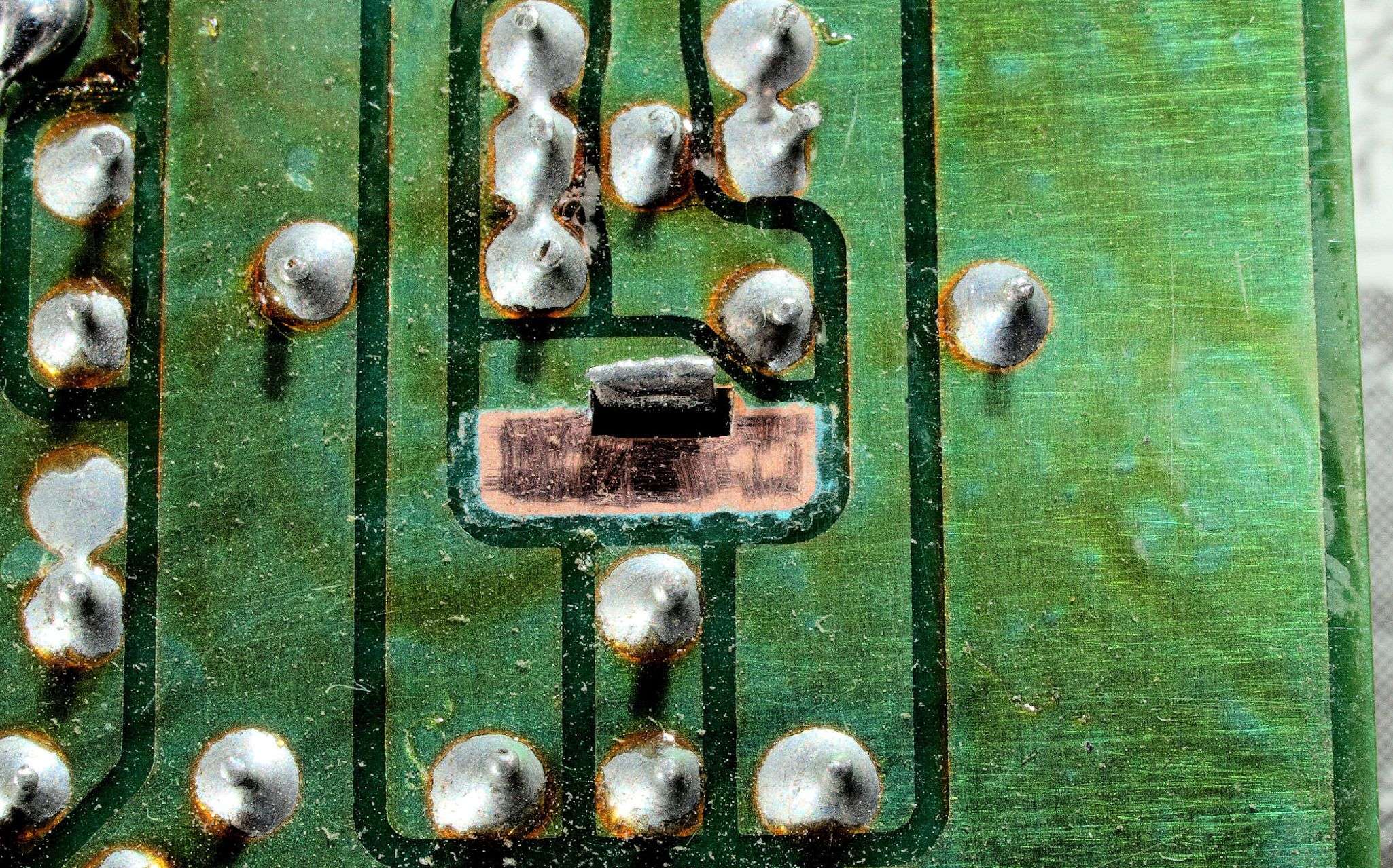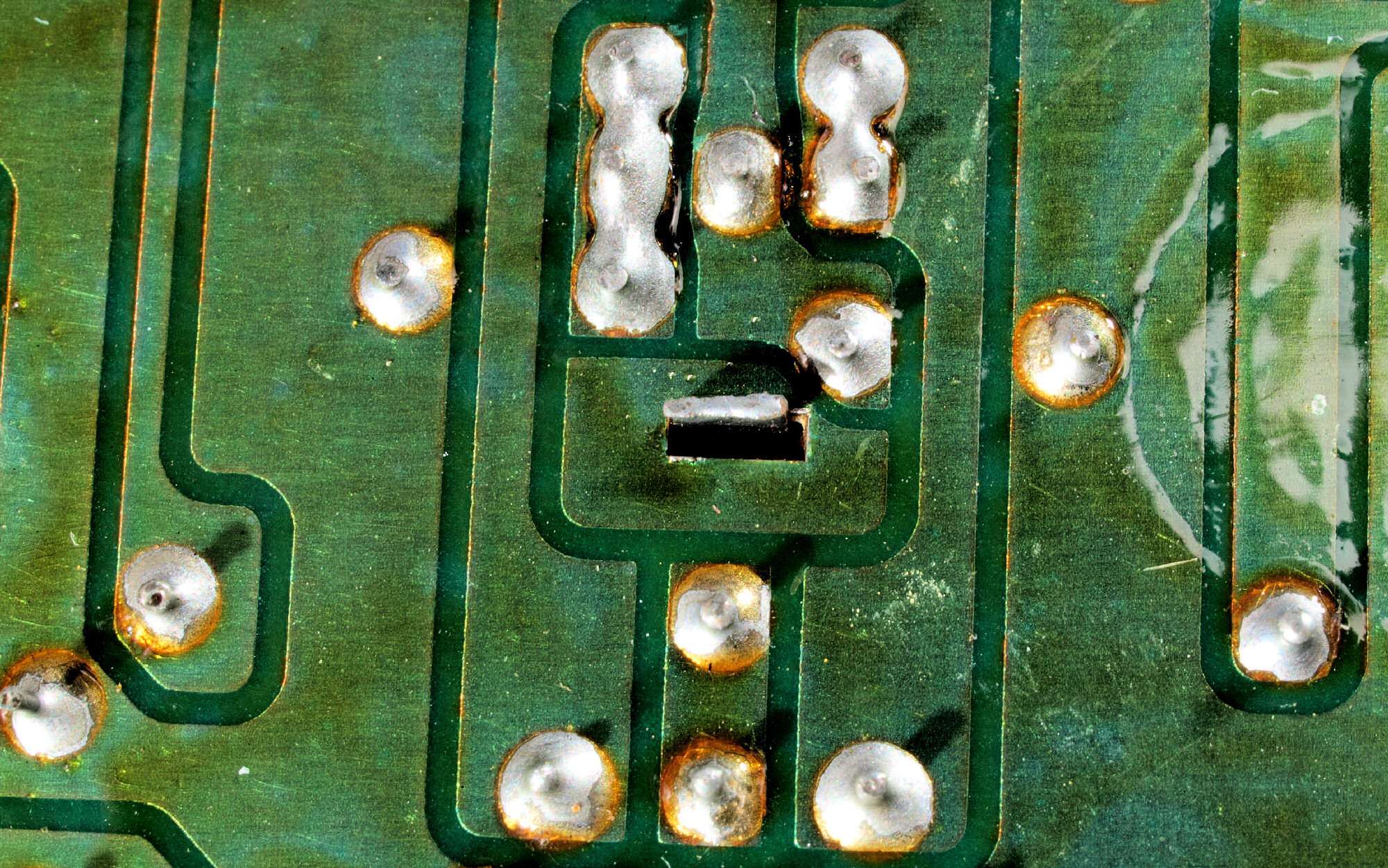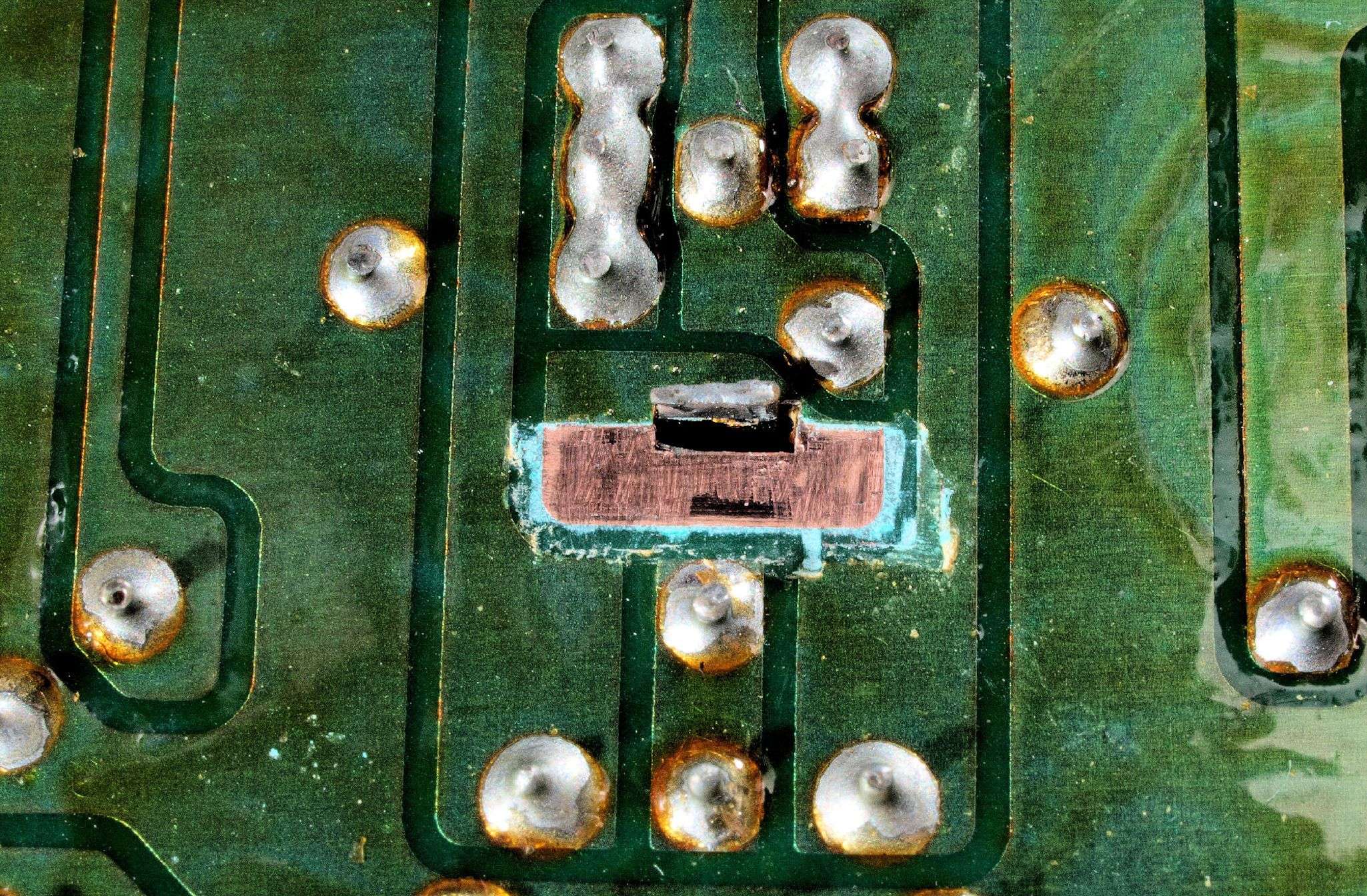 C425. 修理中 IF基板裏、未半田場所2、レジストを取り、半田糊代を作る。