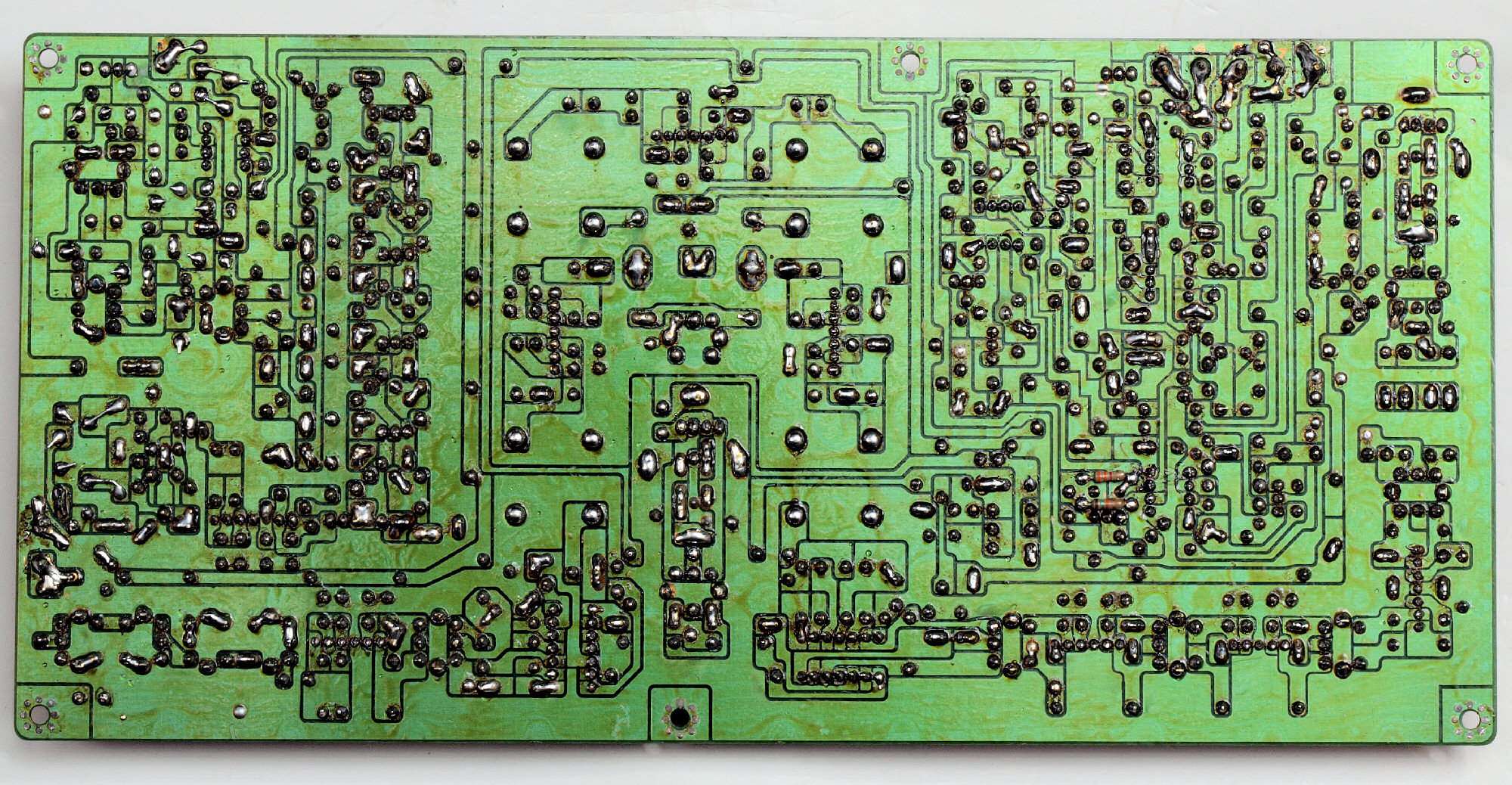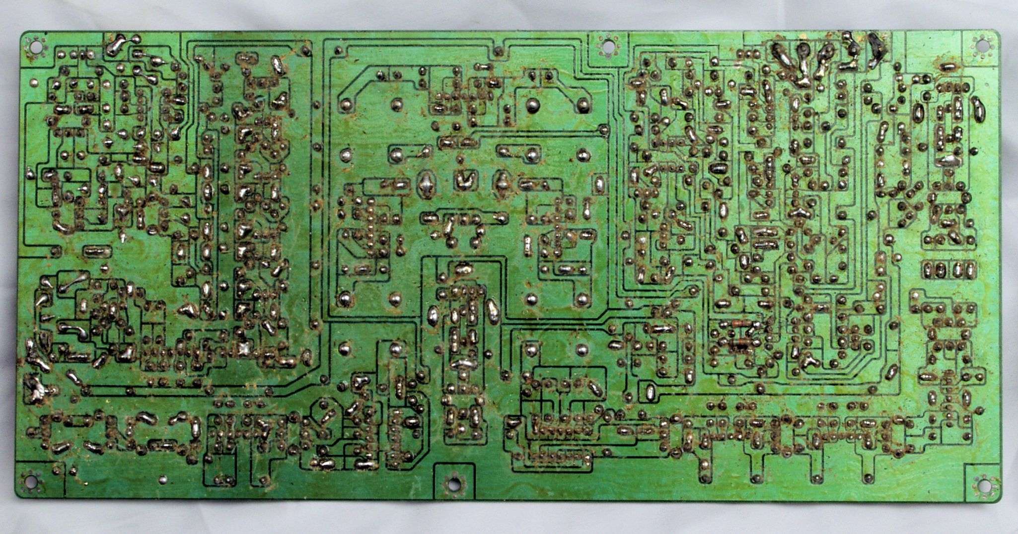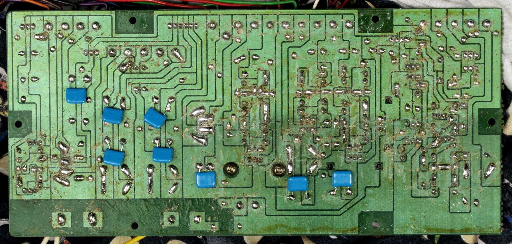 C113. 修理中 電源基板、電解コンデンサーを固定した接着材、トルエンを使用したのでしょう、金属を腐食します。