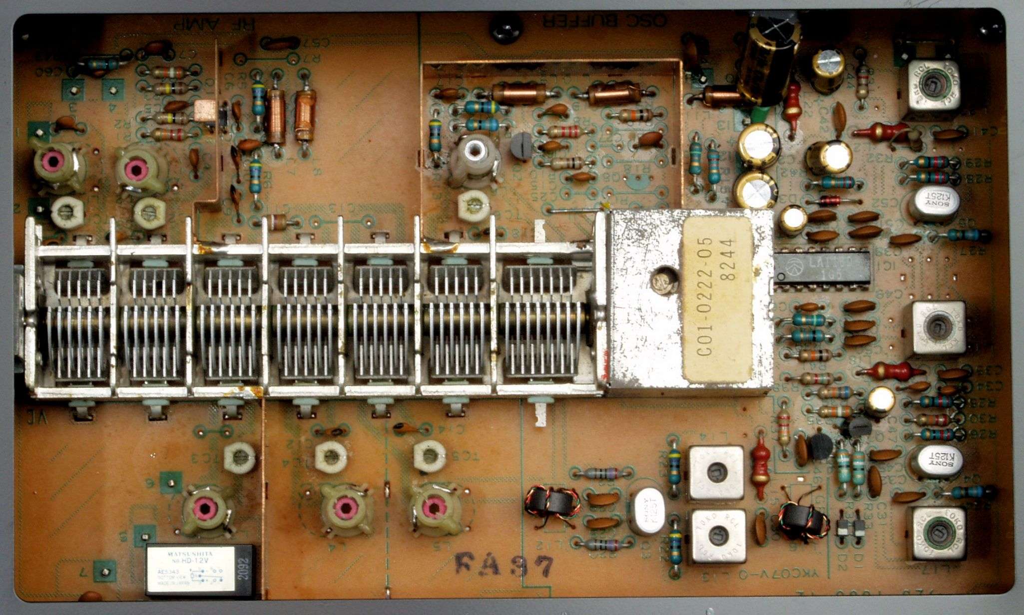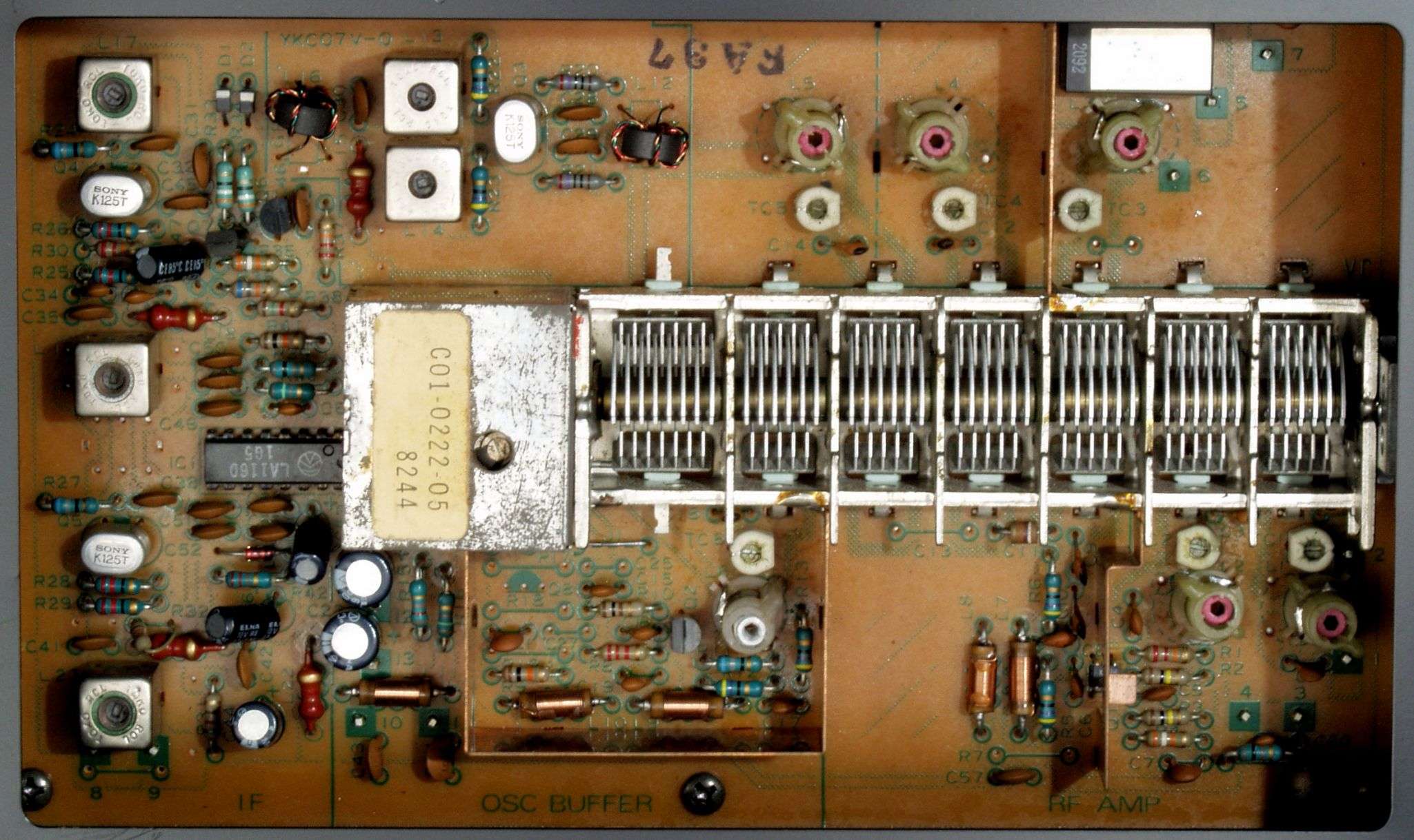C31. 修理前 RF−MIX基板、「周波数直線高精度7連バリコン」を採用。 左2番目が局発に1段同調バッファー。