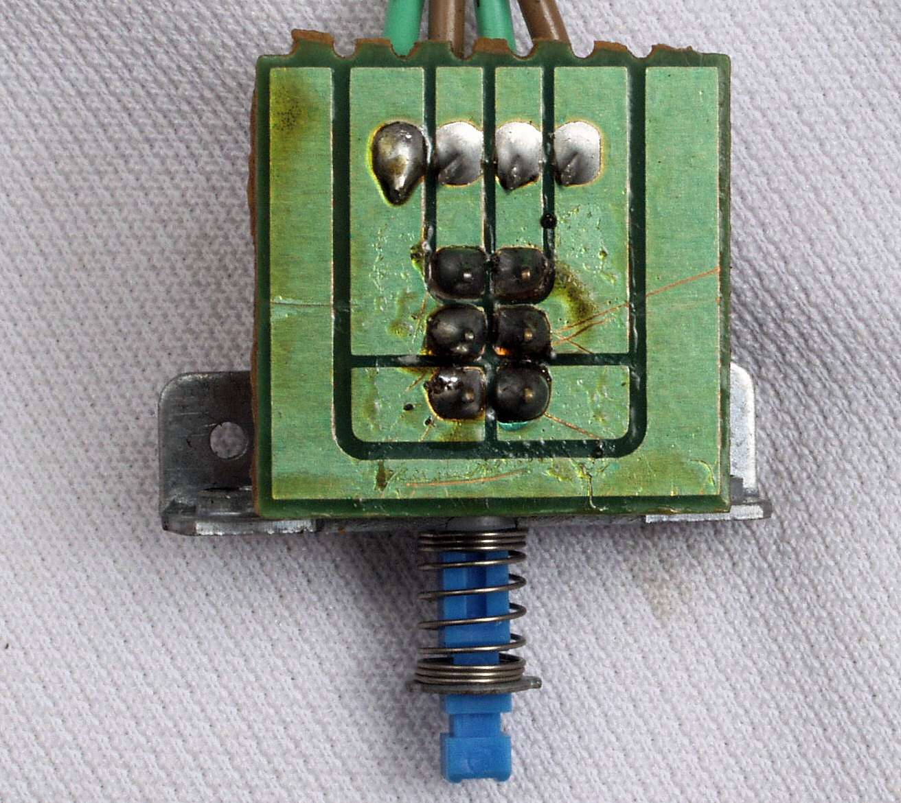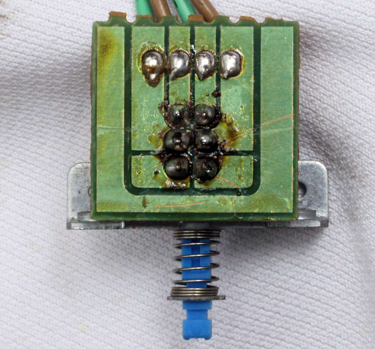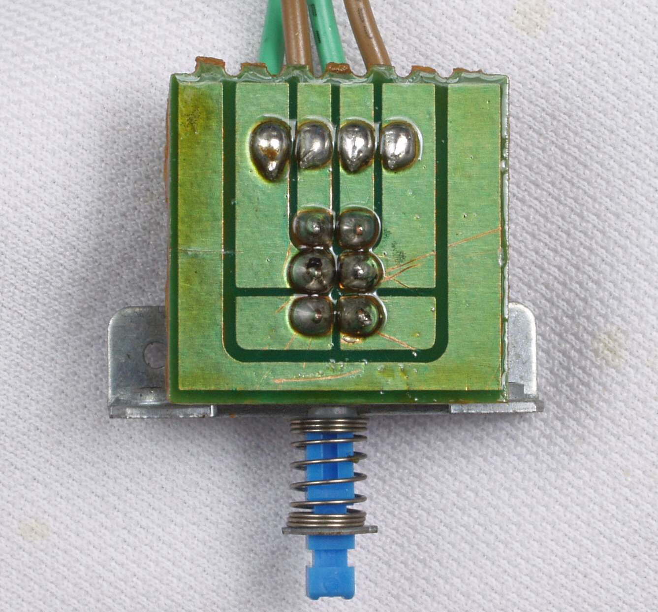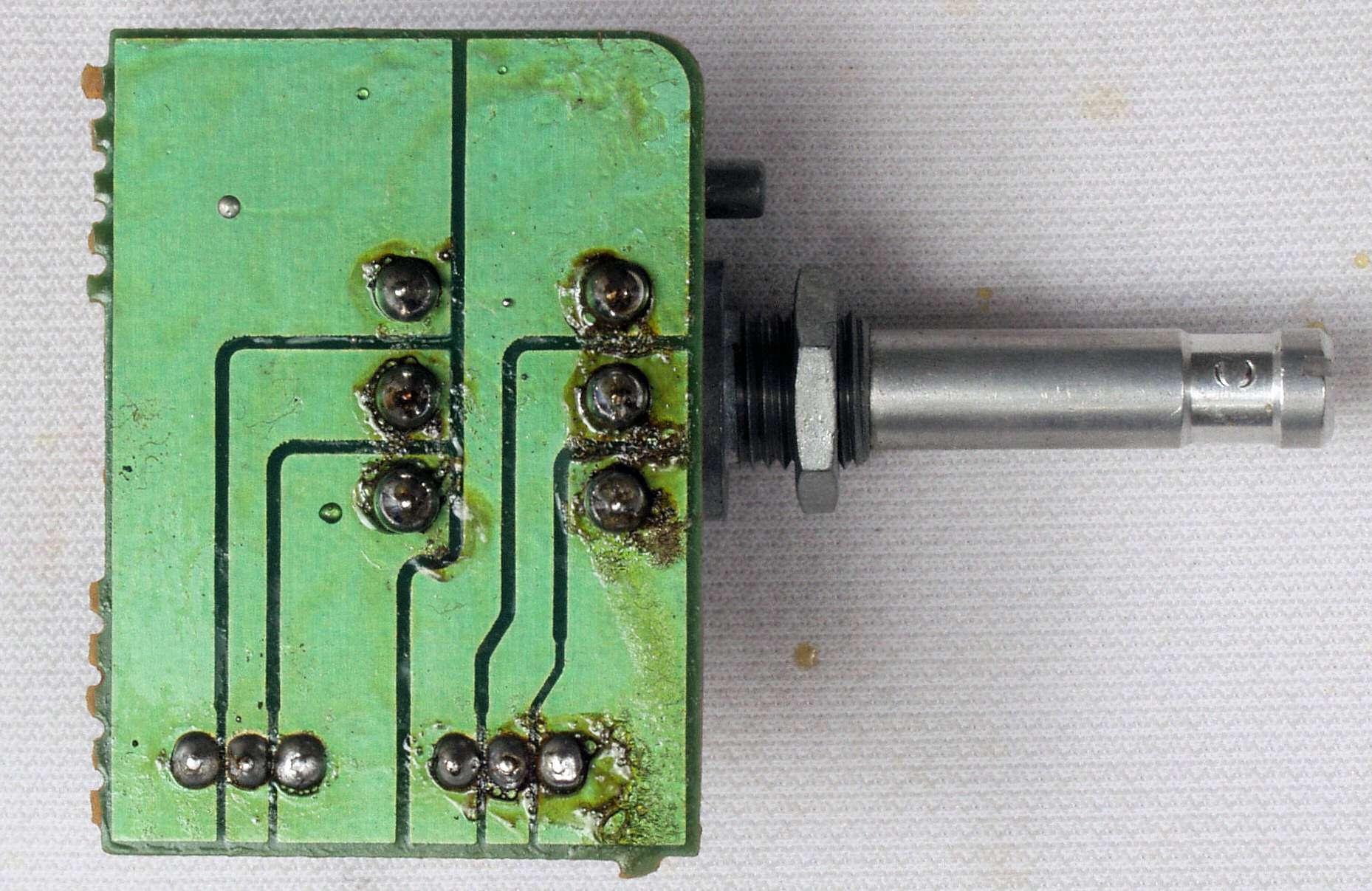 C552. 修理中 MPX基板裏、ラッピング端子を補強する、屑錫メッキ線で絡げ、補強する。