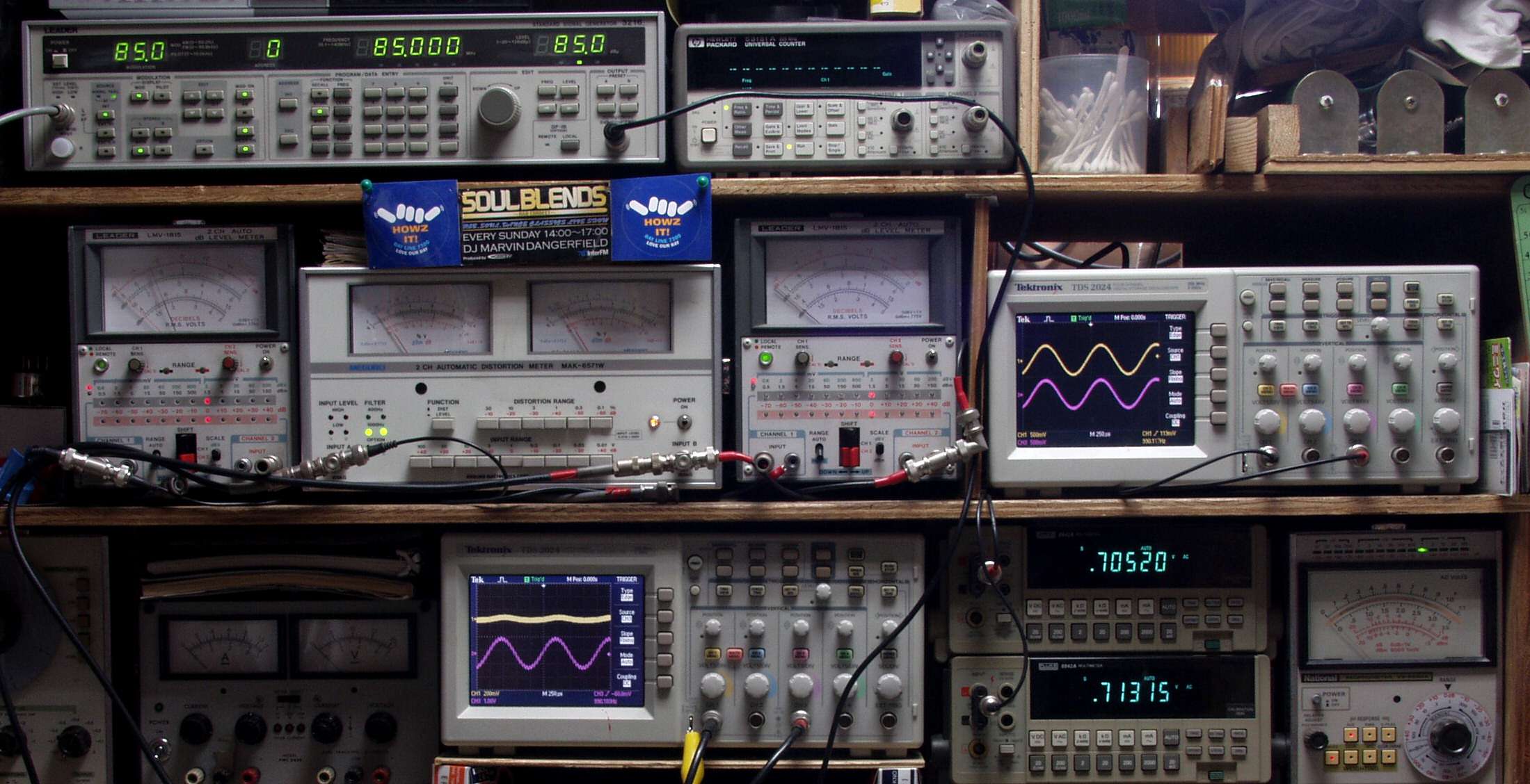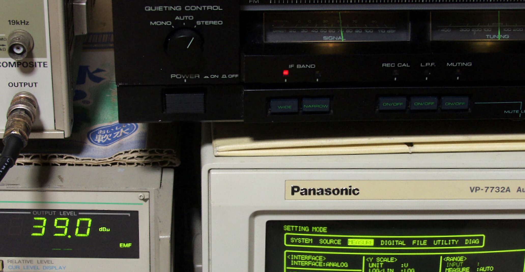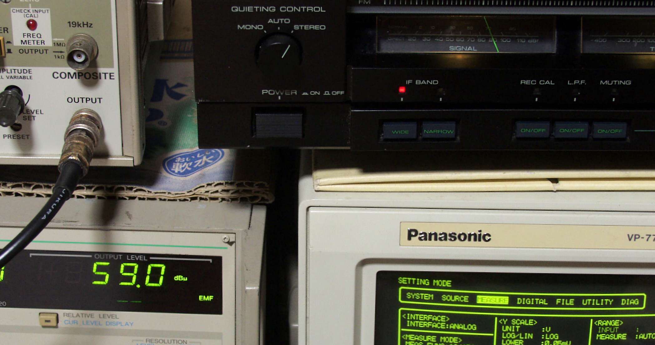 中中左歪み率計=出力の歪み率測定 左メータ=L出力、右メータ=R出力。
