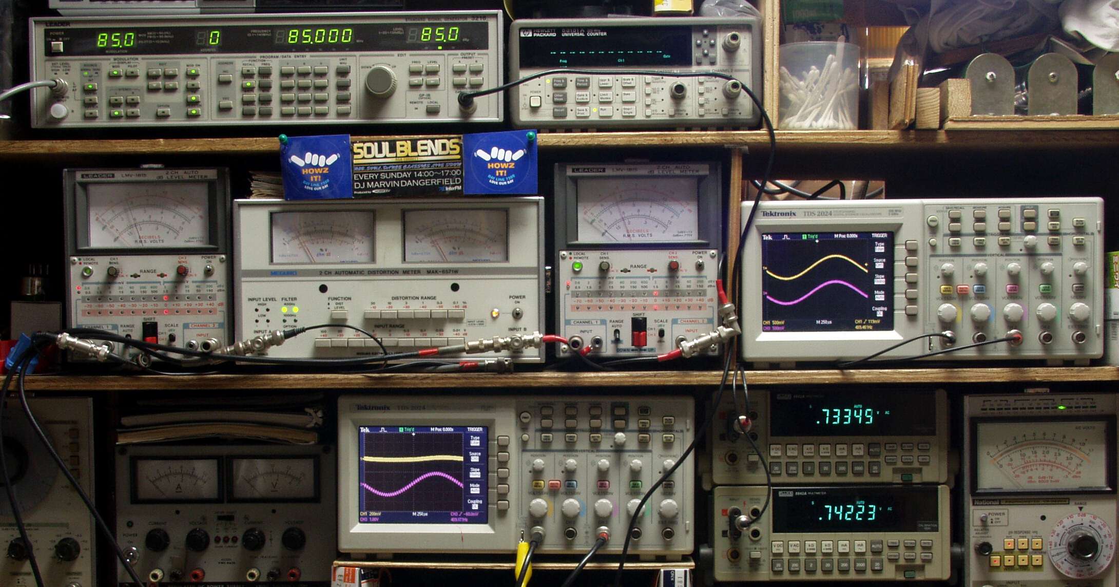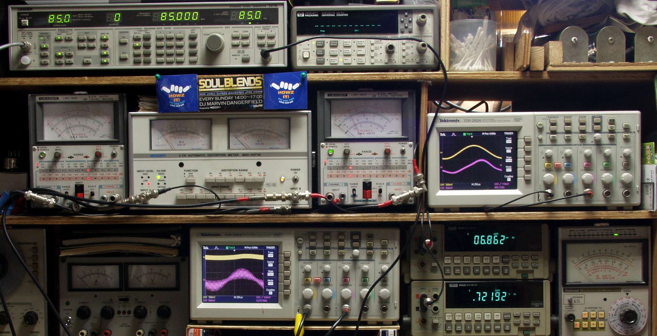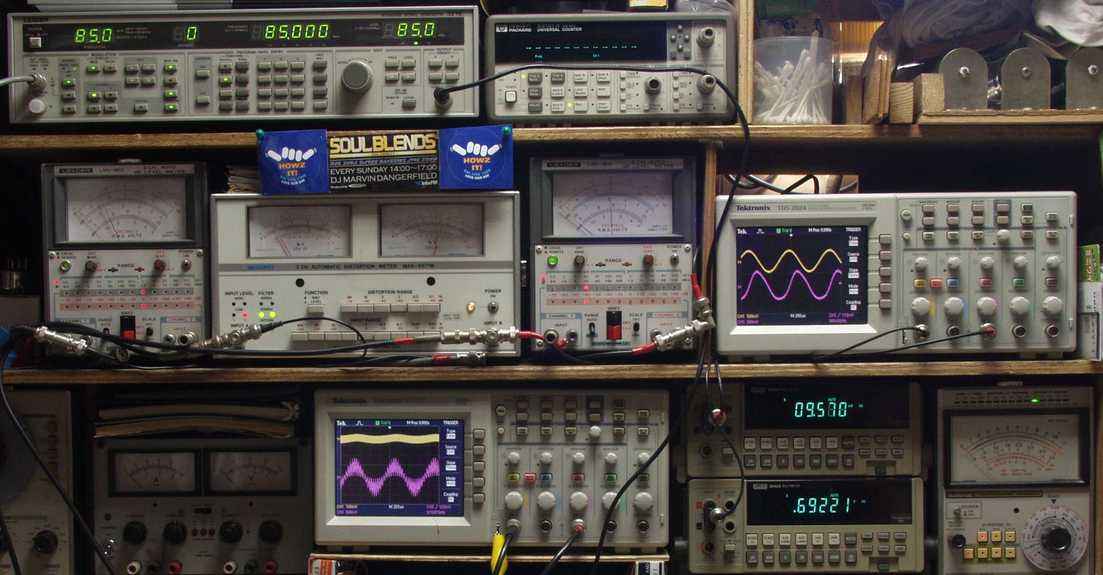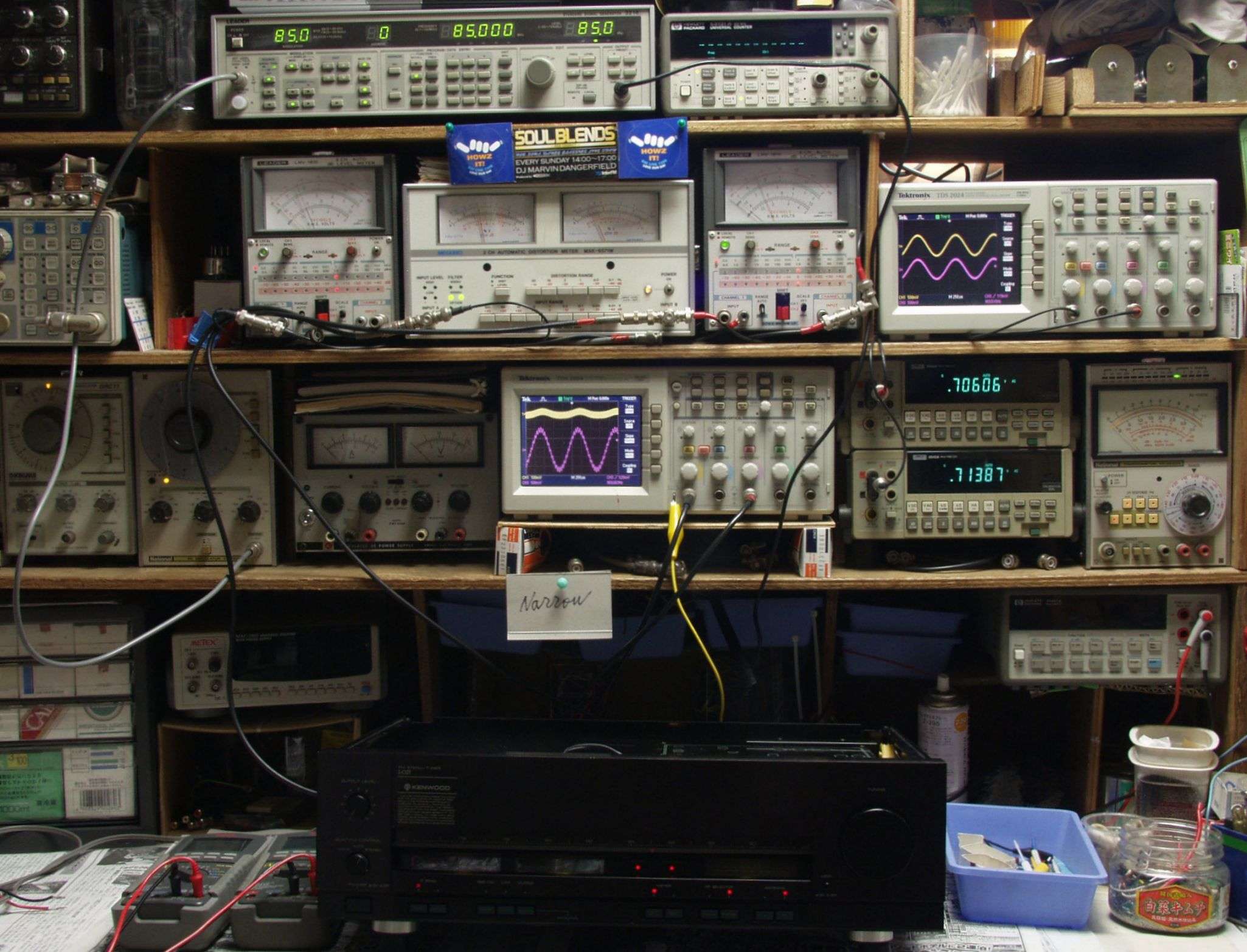 中中左歪み率計=出力の歪み率測定 左メータ=L出力、右メータ=R出力。