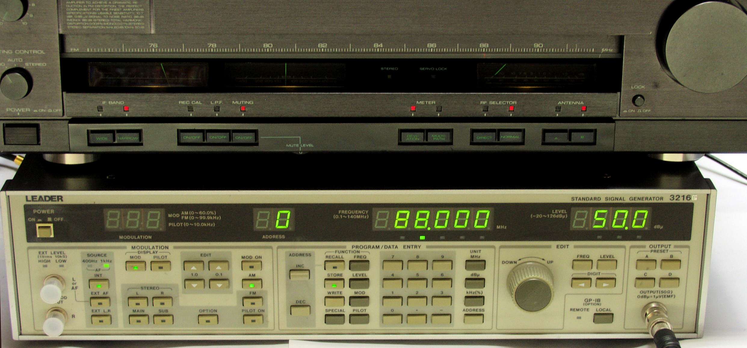 上のFMステレオ信号発信器より 85MHZで 400HZ & 1KHZの 変調信号を 85dBで出す これを受信し出力を測定する。