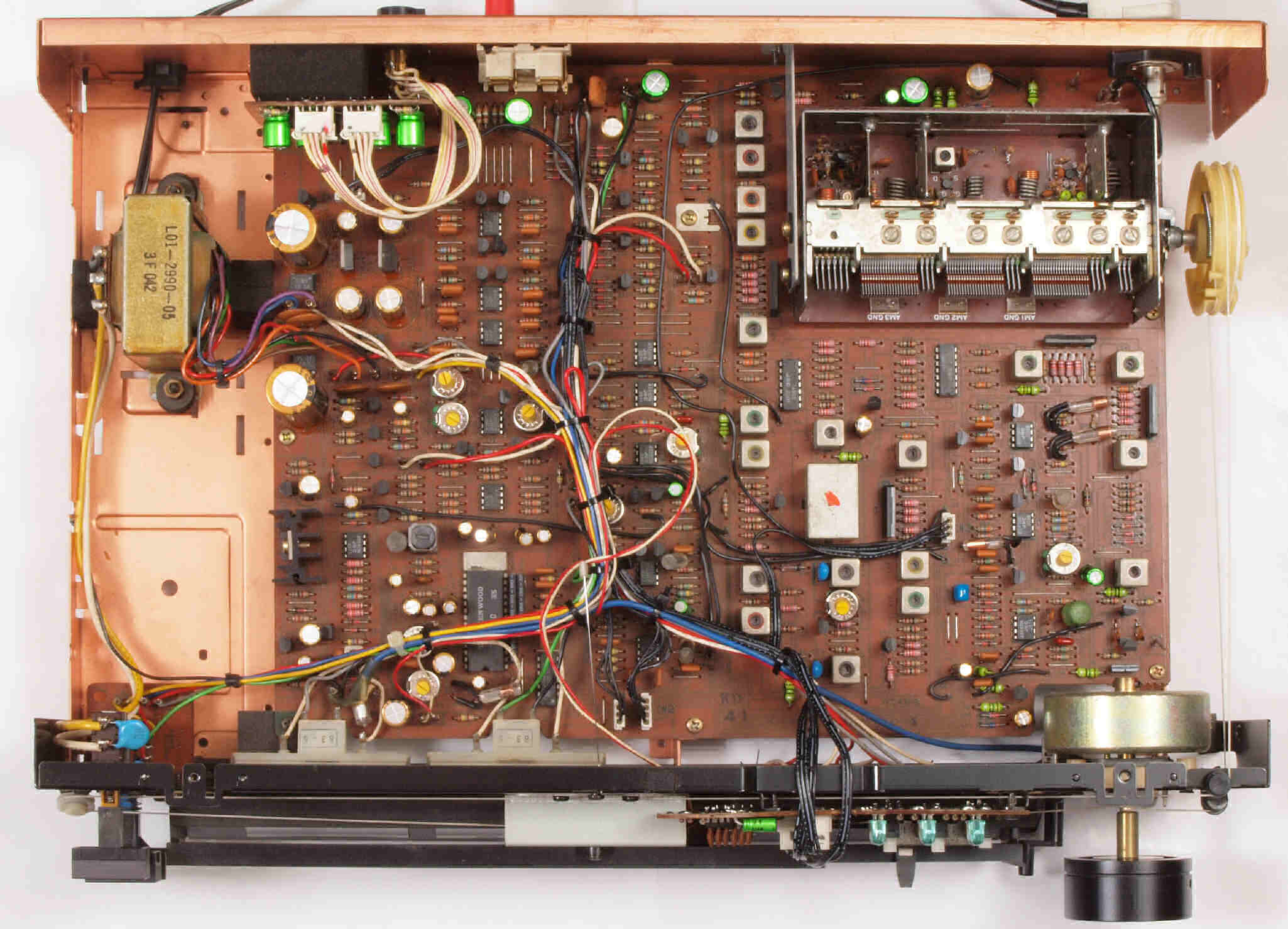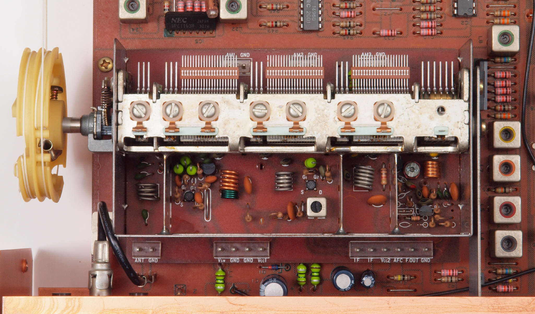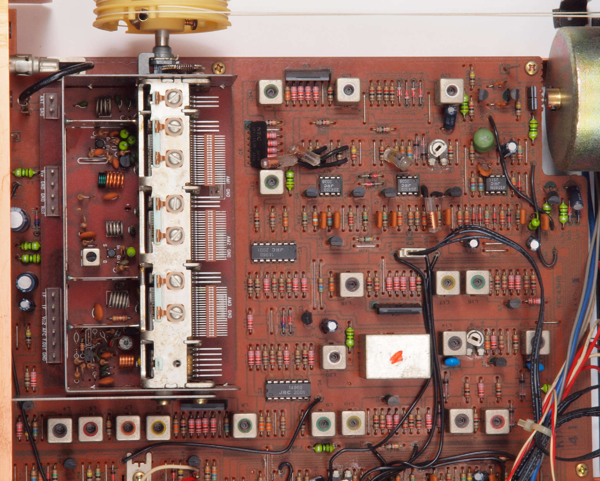 | C32. 修理後 PLL−マルチプレックス−AF−電源基板。 半固定VR7個、OP-AMP4個、電解コンデンサー25個交換。 | ||||||||||||||||||||||||||||||||||||||||||||||||||