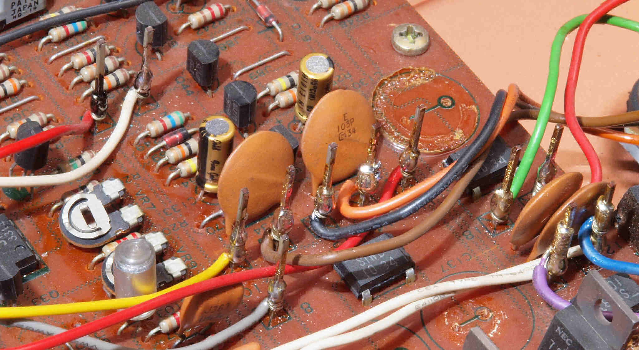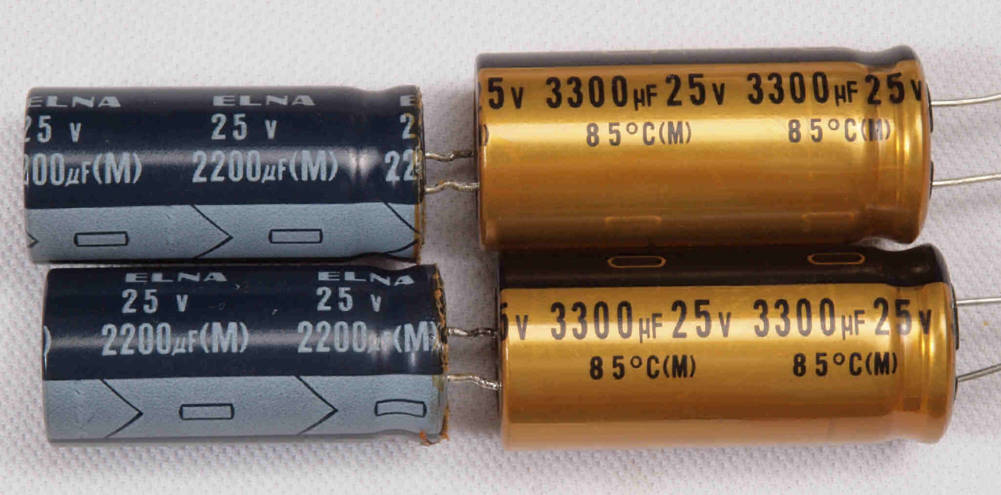 | A41. 点検中 交換する電源電解コンデンサー。 左=付いていた2200μ/25V、右=交換する3300μ/25V。 | ||||||||||||||||||||||||||||||||||||||||||||||||||