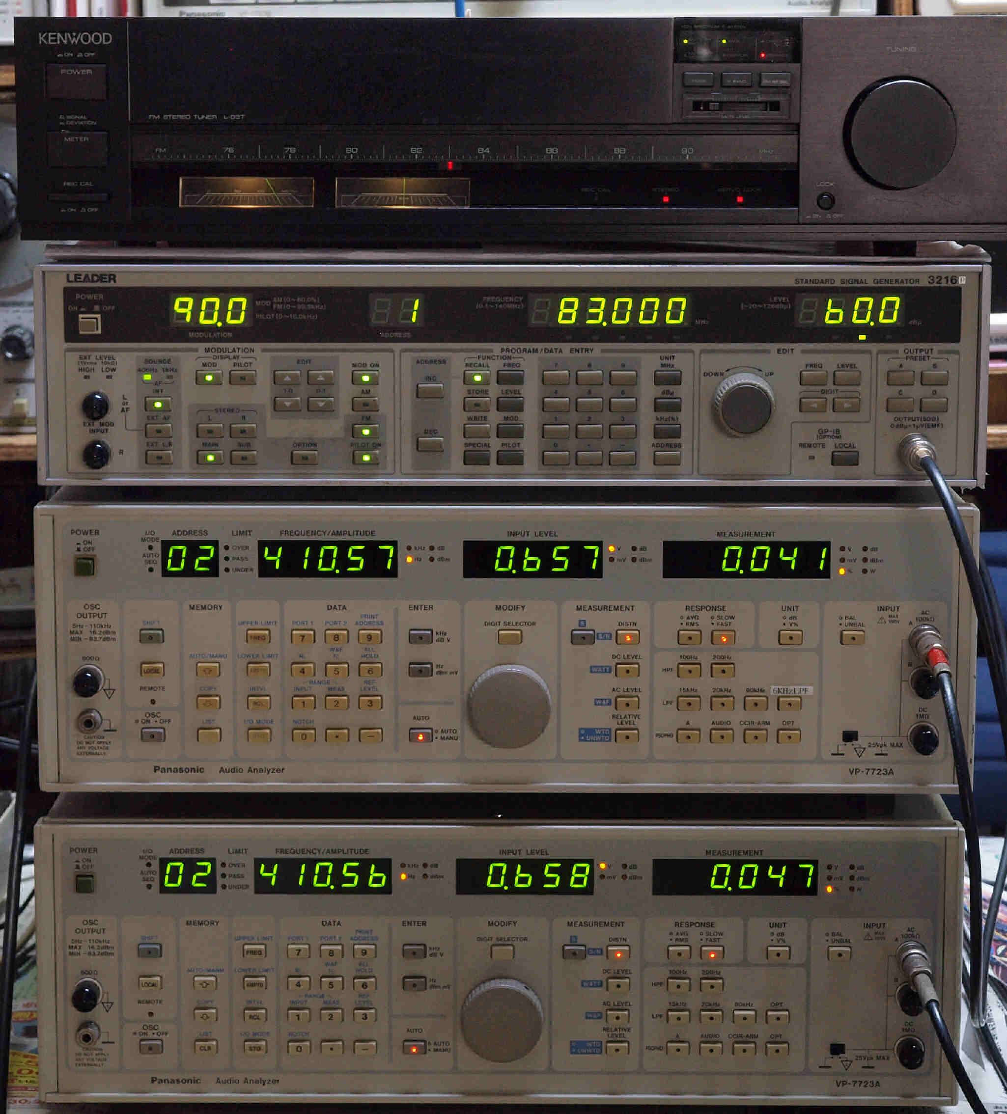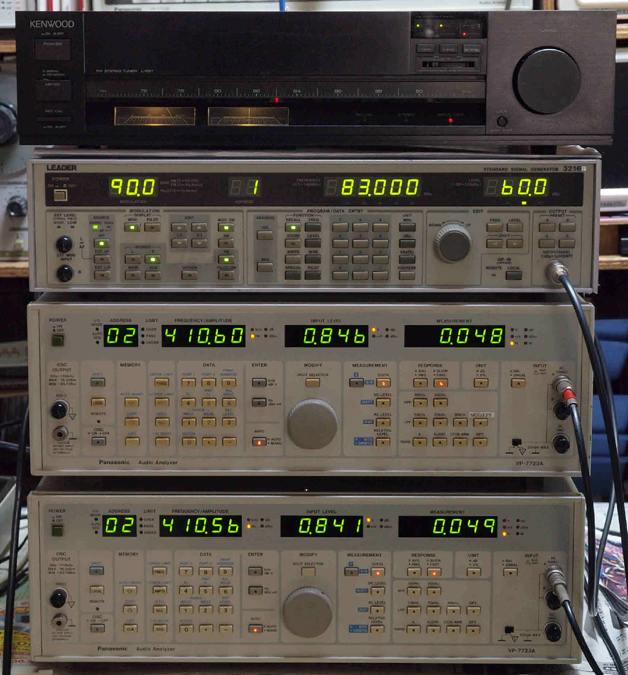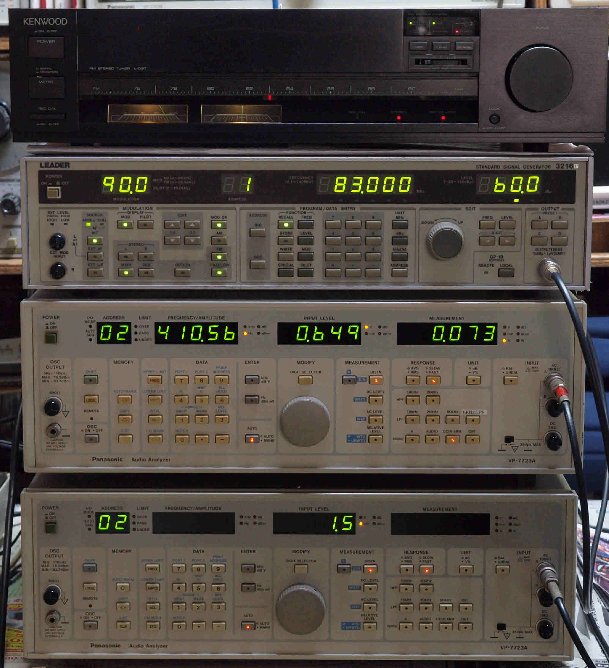 | E. 調整・測定、 FM受信感度、RL分離測定調整。 画像をクリックすると、大きく(横幅2050ドット)表示されます。 <見方> 中上の「LEADER 3216P FMステレオ信号発信器」より信号を出す。これを受信し出力を測定する。 表示LED、 左端=変調度、 中左=メモリNo、 中右=出力周波数、 右端=出力レベル。 中下=R出力測定。 「Audio Analyzer Panasonic VP−7723A」より測定。 表示LED、 左端=メモリーNo、中左=周波数測定、中右=出力電圧測定、右端=歪み率測定。 下=L出力測定。 「Audio Analyzer Panasonic VP−7723A」より測定。 表示LED、 左端=メモリーNo、中左=周波数測定、中右=出力電圧測定、右端=歪み率測定。 チューナの出力電圧は固定を使用。 |