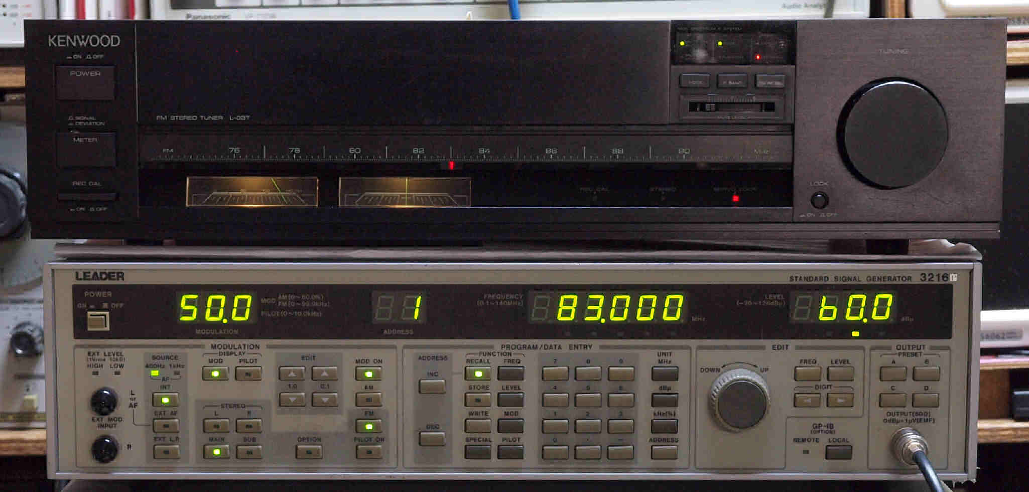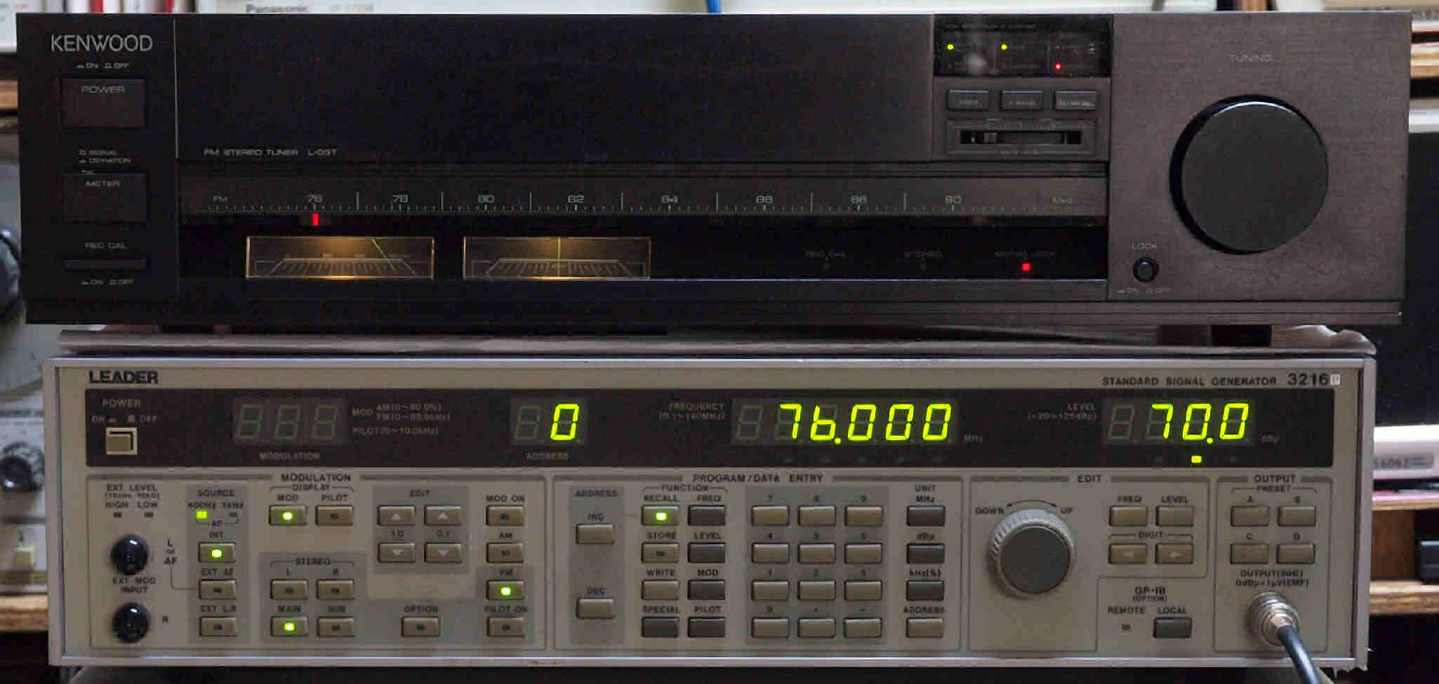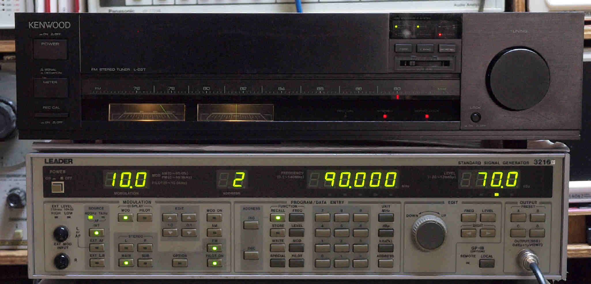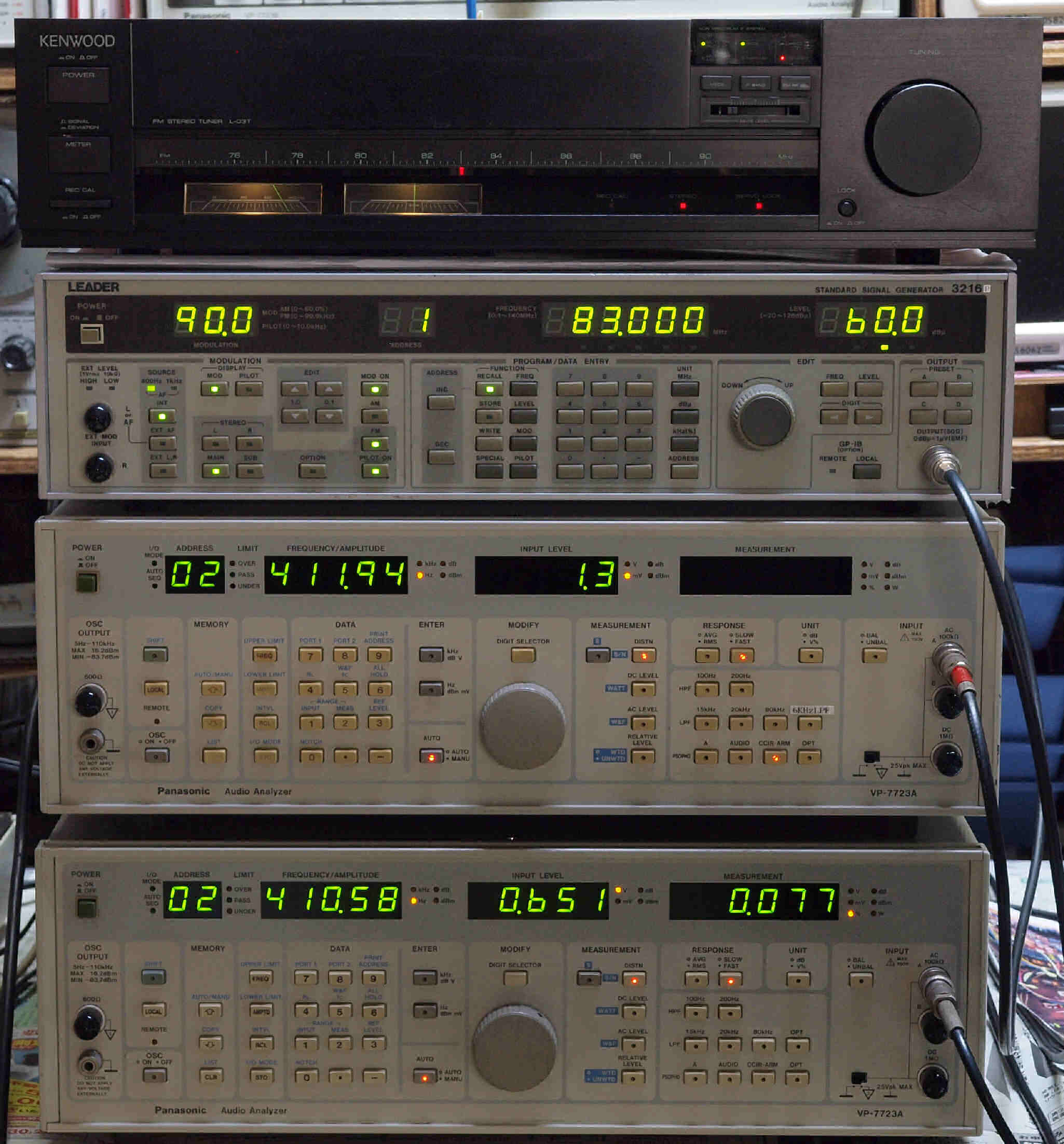 | E. 調整・測定、 FM受信感度、RL分離測定調整。 画像をクリックすると、大きく(横幅2050ドット)表示されます。 <見方> 中上の「LEADER 3216P FMステレオ信号発信器」より信号を出す。これを受信し出力を測定する。 表示LED、 左端=変調度、 中左=メモリNo、 中右=出力周波数、 右端=出力レベル。 中下=R出力測定。 「Audio Analyzer Panasonic VP−7723A」より測定。 表示LED、 左端=メモリーNo、中左=周波数測定、中右=出力電圧測定、右端=歪み率測定。 下=L出力測定。 「Audio Analyzer Panasonic VP−7723A」より測定。 表示LED、 左端=メモリーNo、中左=周波数測定、中右=出力電圧測定、右端=歪み率測定。 チューナの出力電圧は固定を使用。 |
