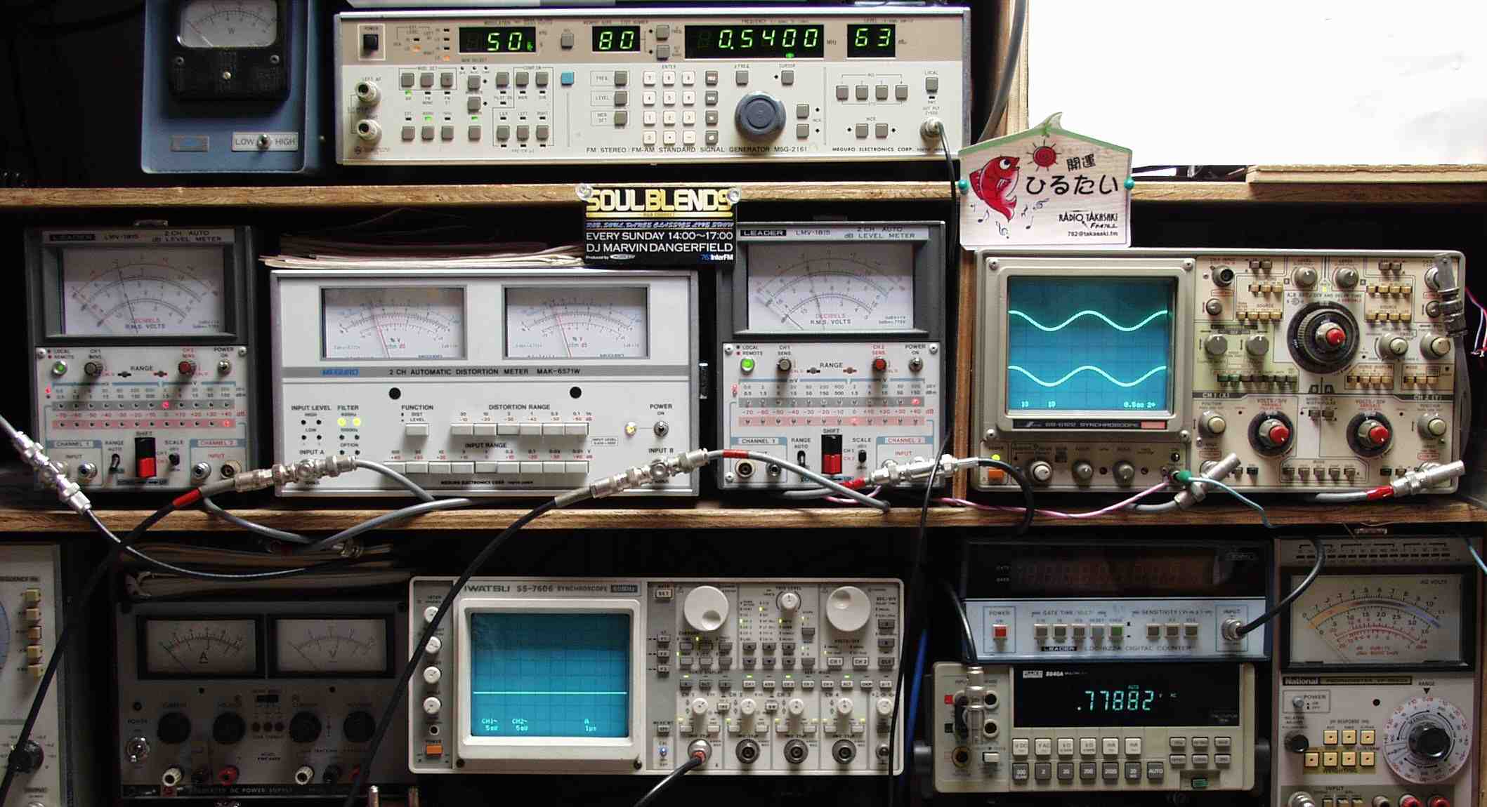 | E. 測定・調整。 画像をクリックすると、大きく(横幅2050ドット)表示されます。 E0. FM受信感度、歪み、分離度測定調整 <見方> 上段右=AM・FMステレオ信号発信器 中段左端 電圧計=L側出力電圧測定、黒針のみ使用 中段中左 歪み率計=出力の歪み率測定 左メータ=L出力、右メータ=R出力 中段中右 電圧計=R側出力電圧測定、赤針のみ使用 中段右端 オシロ=出力波形 上=R出力、下=L出力 RL電圧計の出力を測定しているのでレンジが異なる場合比較注意 下段中右上 デジタル電圧計=出力電圧測定RLは切り替えて測定 |