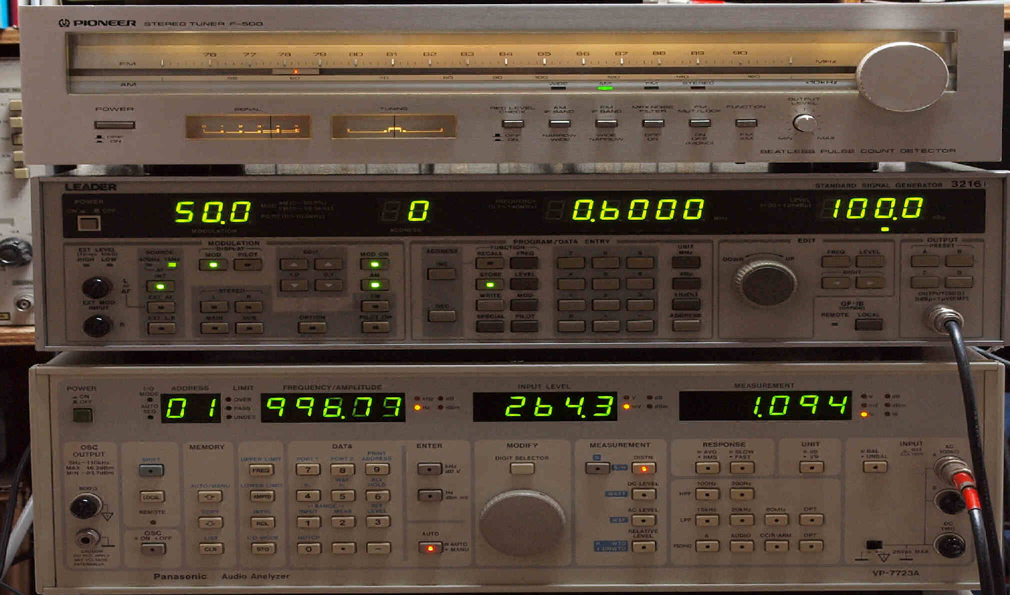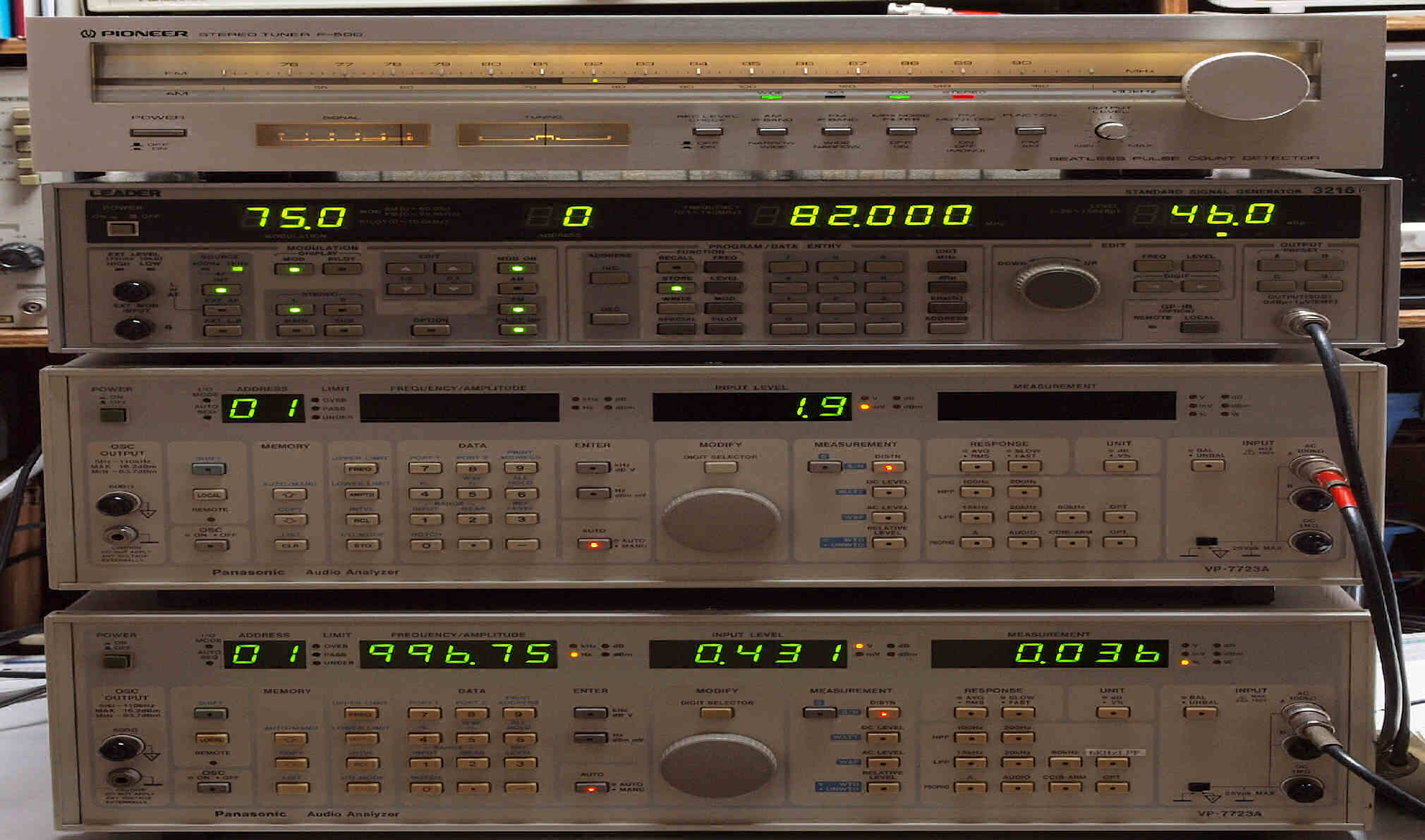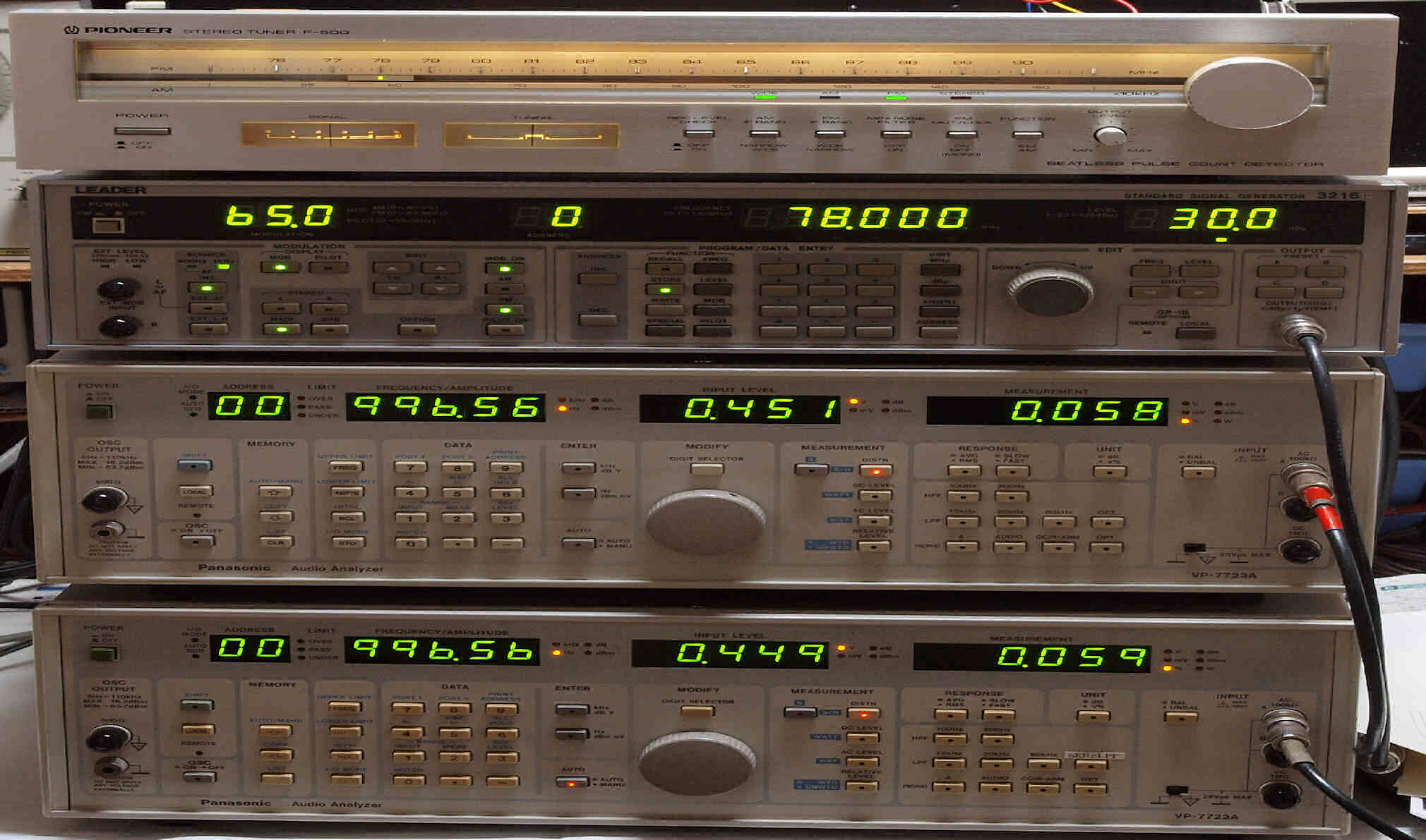 | E. 調整・測定、 受信感度、FM−RL分離測定調整. <見方> 中上の「LEADER 3216P AM・FMステレオ信号発信器」より信号を出す。これを受信し出力を測定する。 表示LED、 左端=変調度、 中左=メモリNo、 中右=出力周波数、 右端=出力レベル。 中下=R出力測定。 「Audio Analyzer Panasonic VP−7723B」より測定。 表示LED、 左端=メモリーNo、中左=周波数測定、中右=出力電圧測定、右端=歪み率測定。 下=L出力測定。 「Audio Analyzer Panasonic VP−7723B」より測定。 表示LED、 左端=メモリーNo、中左=周波数測定、中右=出力電圧測定、右端=歪み率測定。 |
