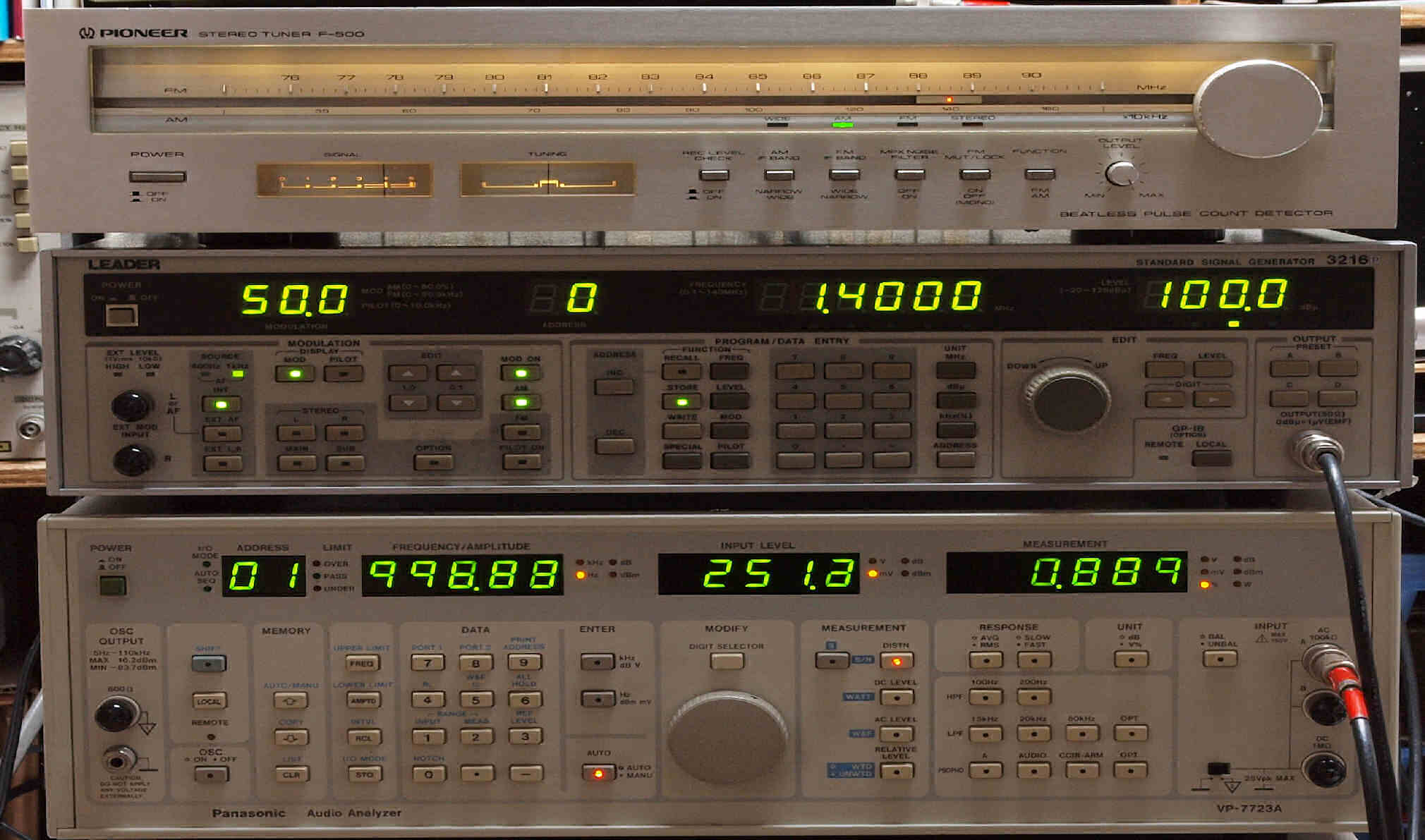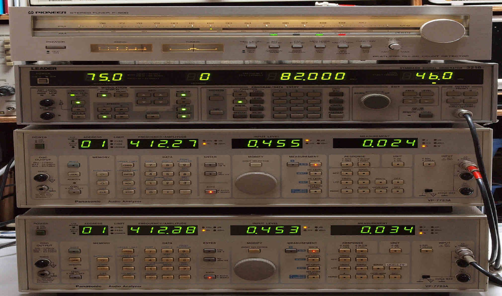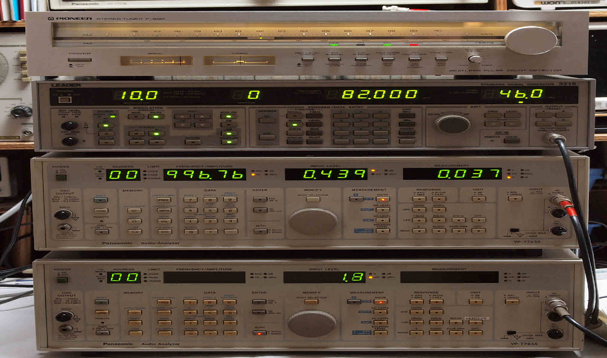 | E. 調整・測定、 受信感度、FM−RL分離測定調整. <見方> 中上の「LEADER 3216P AM・FMステレオ信号発信器」より信号を出す。これを受信し出力を測定する。 表示LED、 左端=変調度、 中左=メモリNo、 中右=出力周波数、 右端=出力レベル。 中下=R出力測定。 「Audio Analyzer Panasonic VP−7723B」より測定。 表示LED、 左端=メモリーNo、中左=周波数測定、中右=出力電圧測定、右端=歪み率測定。 下=L出力測定。 「Audio Analyzer Panasonic VP−7723B」より測定。 表示LED、 左端=メモリーNo、中左=周波数測定、中右=出力電圧測定、右端=歪み率測定。 |