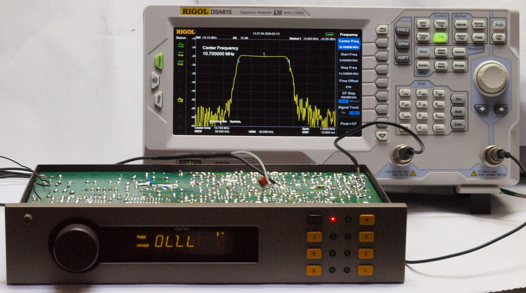 上の「LEADER 3216P FM ステレオ信号発信器」より信号を出す。 これを受信し出力を測定する。