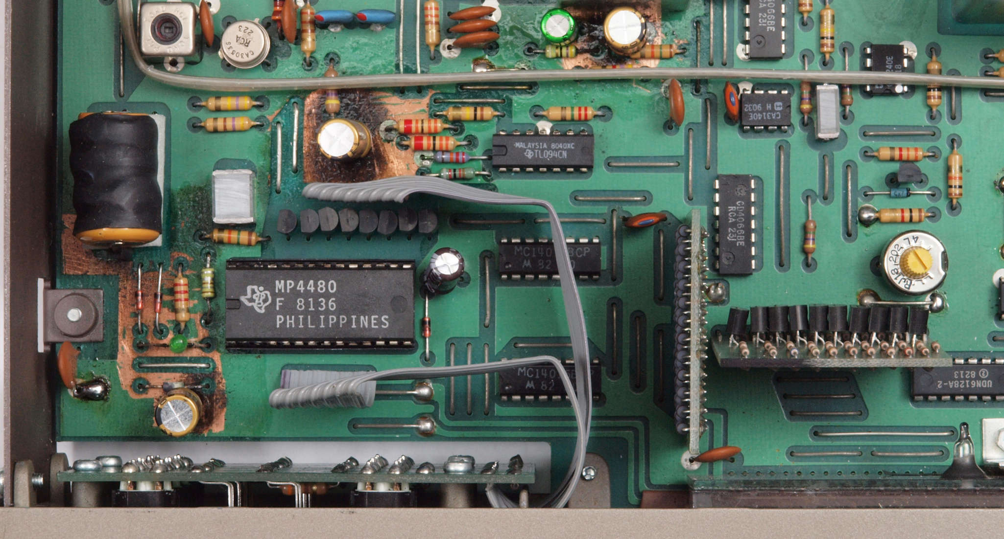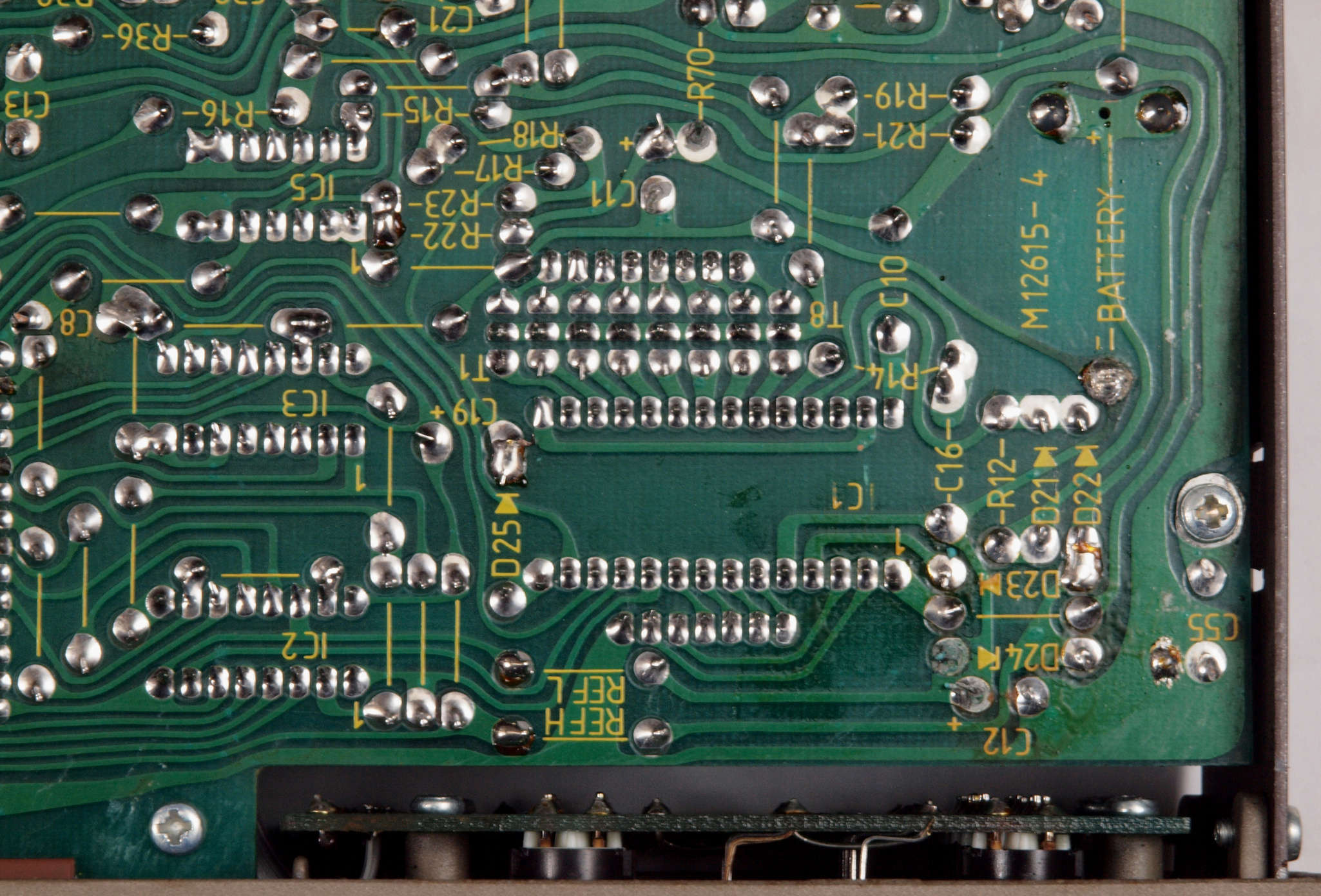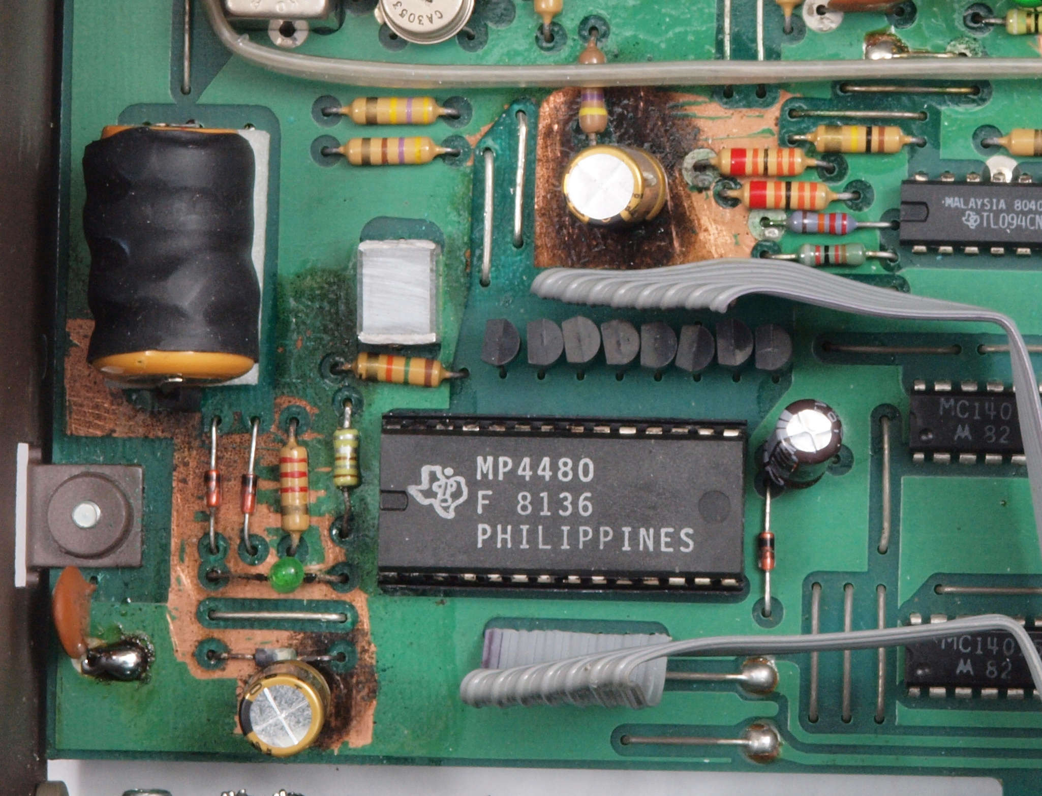 C4A. 修理後 CPU&LCD表示基板裏。電解コンデンサーとバッテリーの液漏れ。