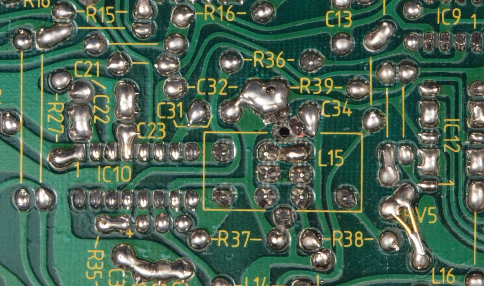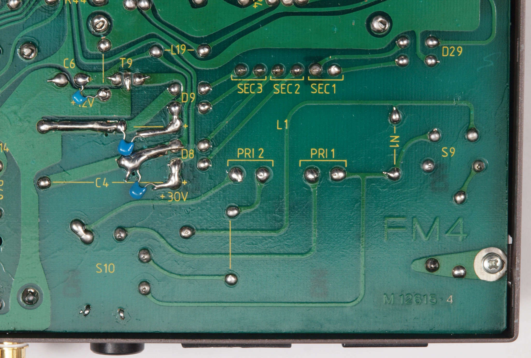 C14. 修理(半田補正)後 電源基板裏。 半田を全部やり直す。セラミックコンデンサー3個追加。