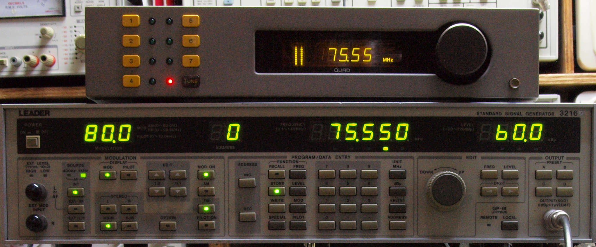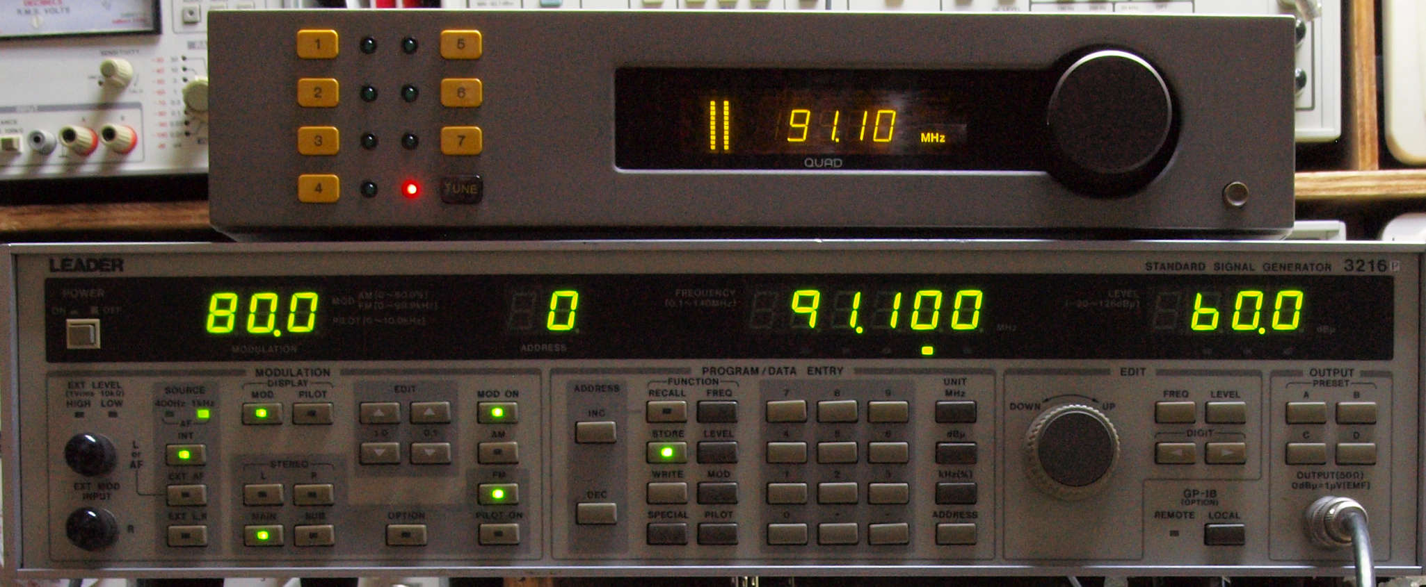 中上の「LEADER 3216P FM信号発信器」より信号を出す。 これを受信し出力を測定する。