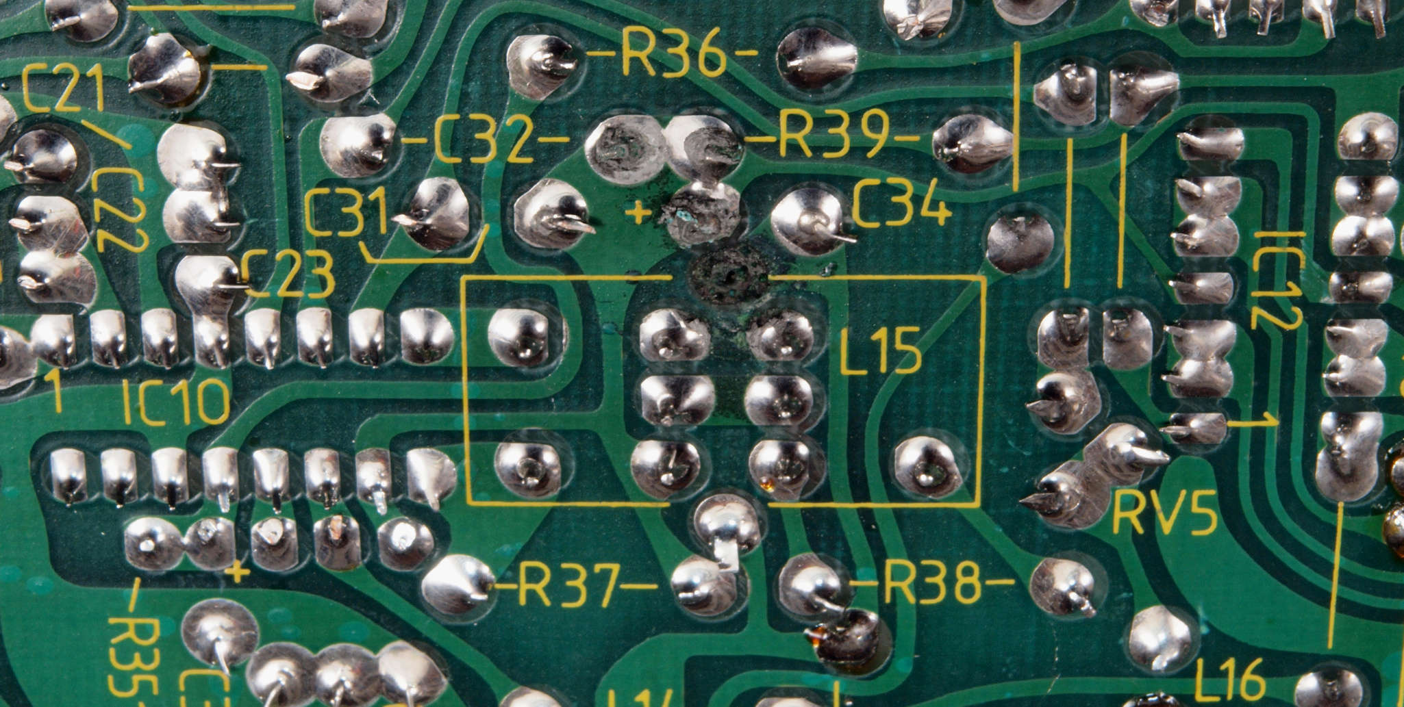 C29. 修理前 AMP基板裏の電解コンデンサーの液漏れ。