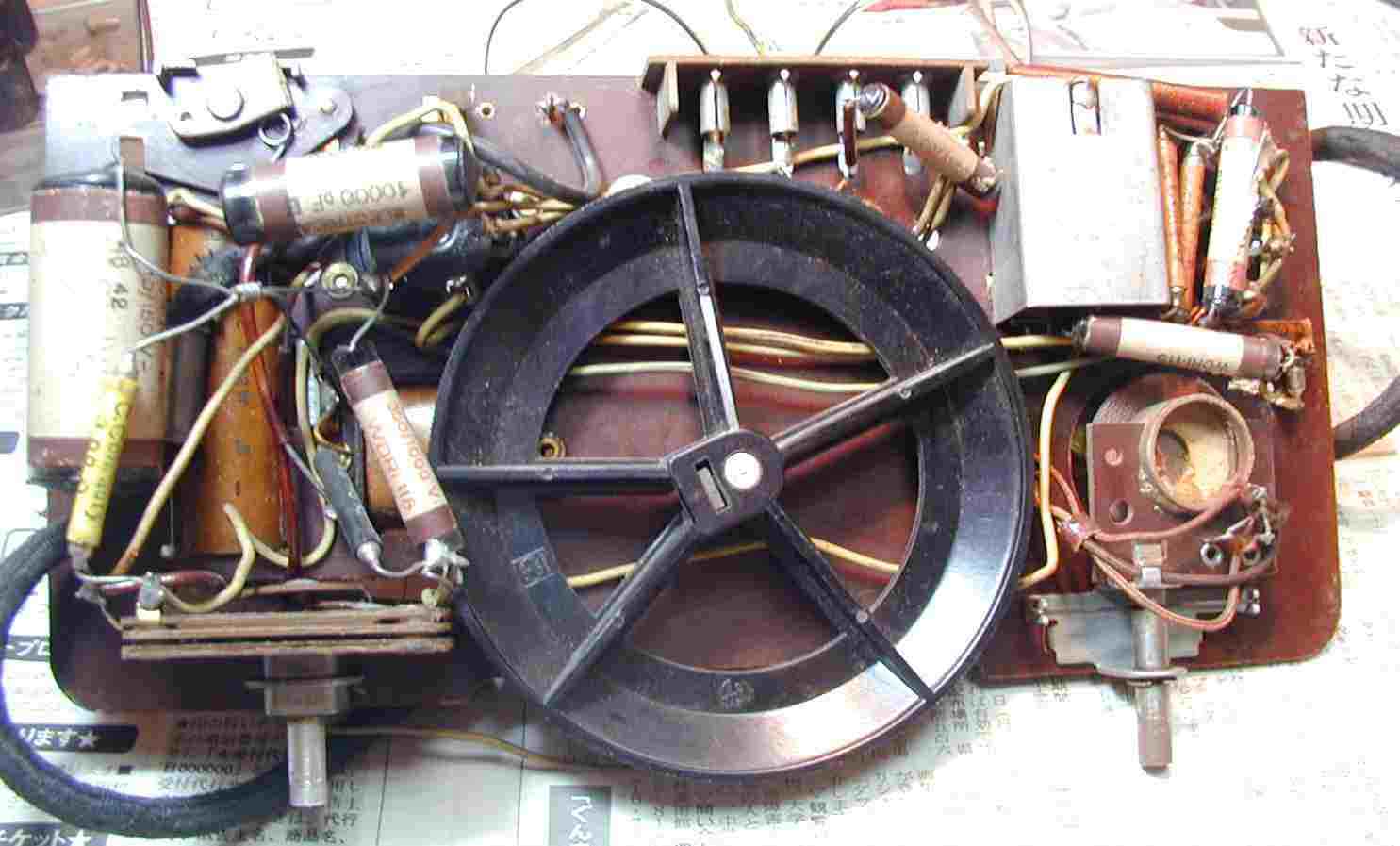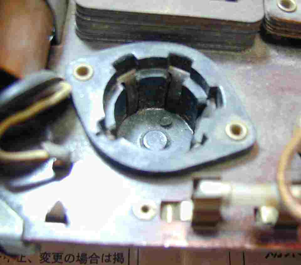 9.同調バリコン、半回転後は、上の円盤SWでコイルのタップをショウトしている=頭が良い。