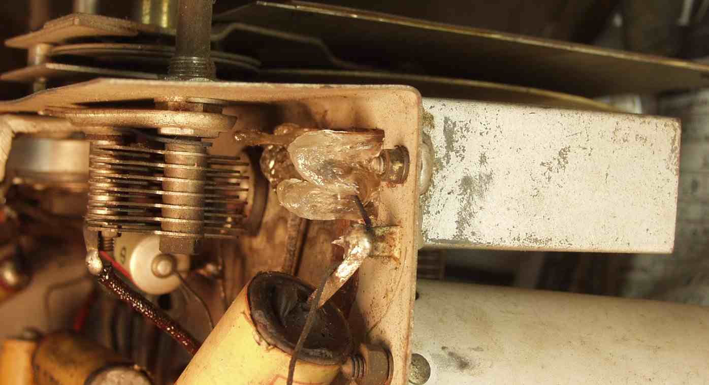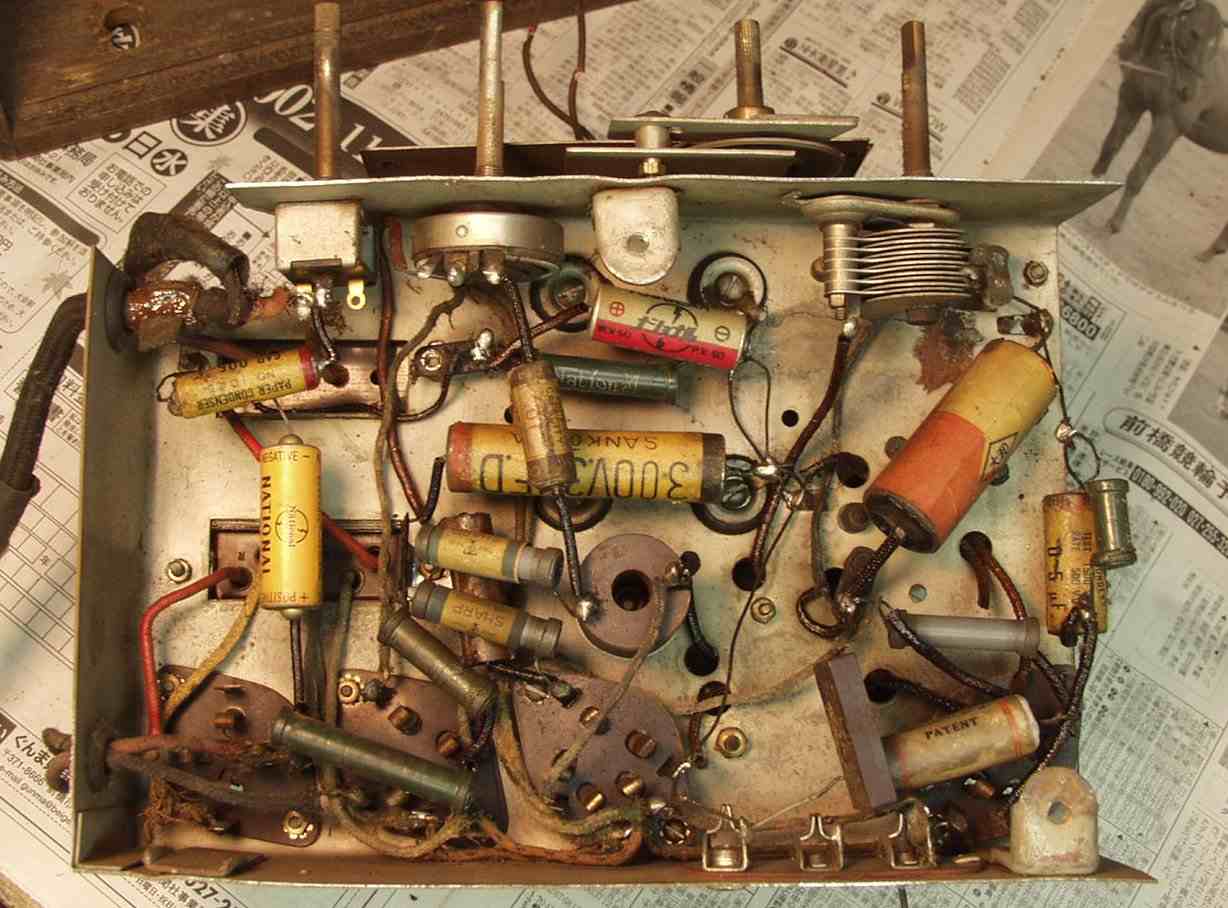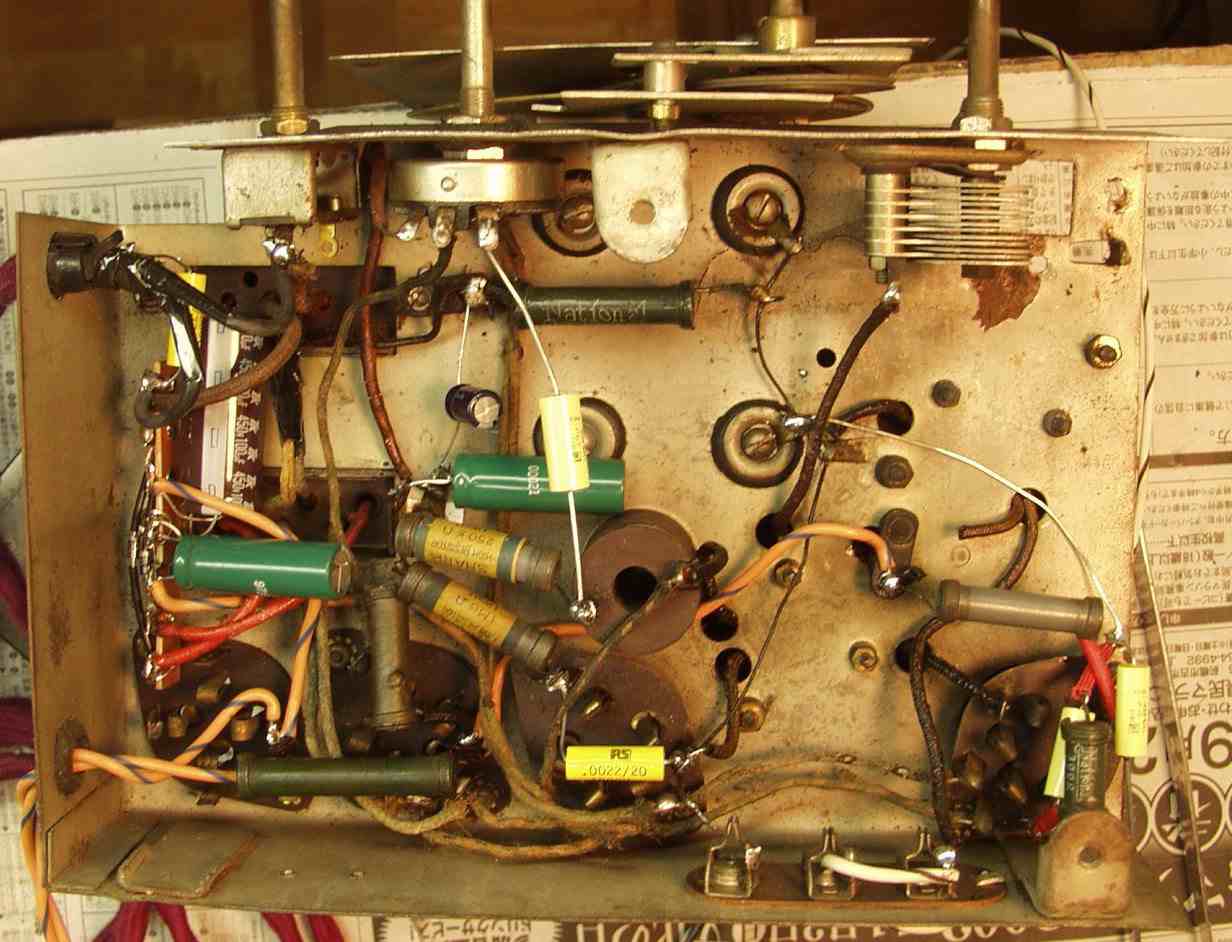 A−1.修理前 シャ−シ下から見る、コンデンサ−不良多し