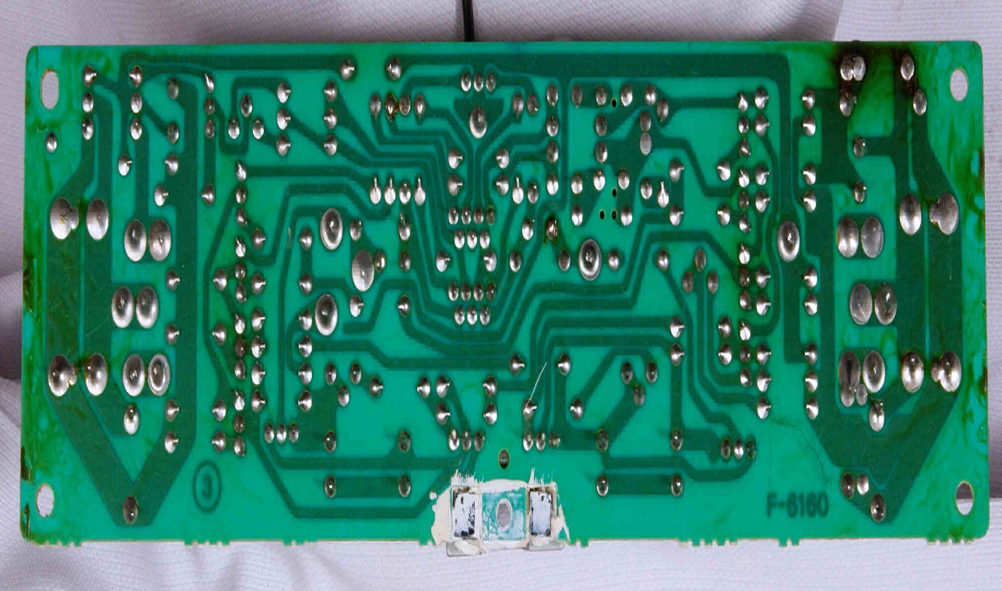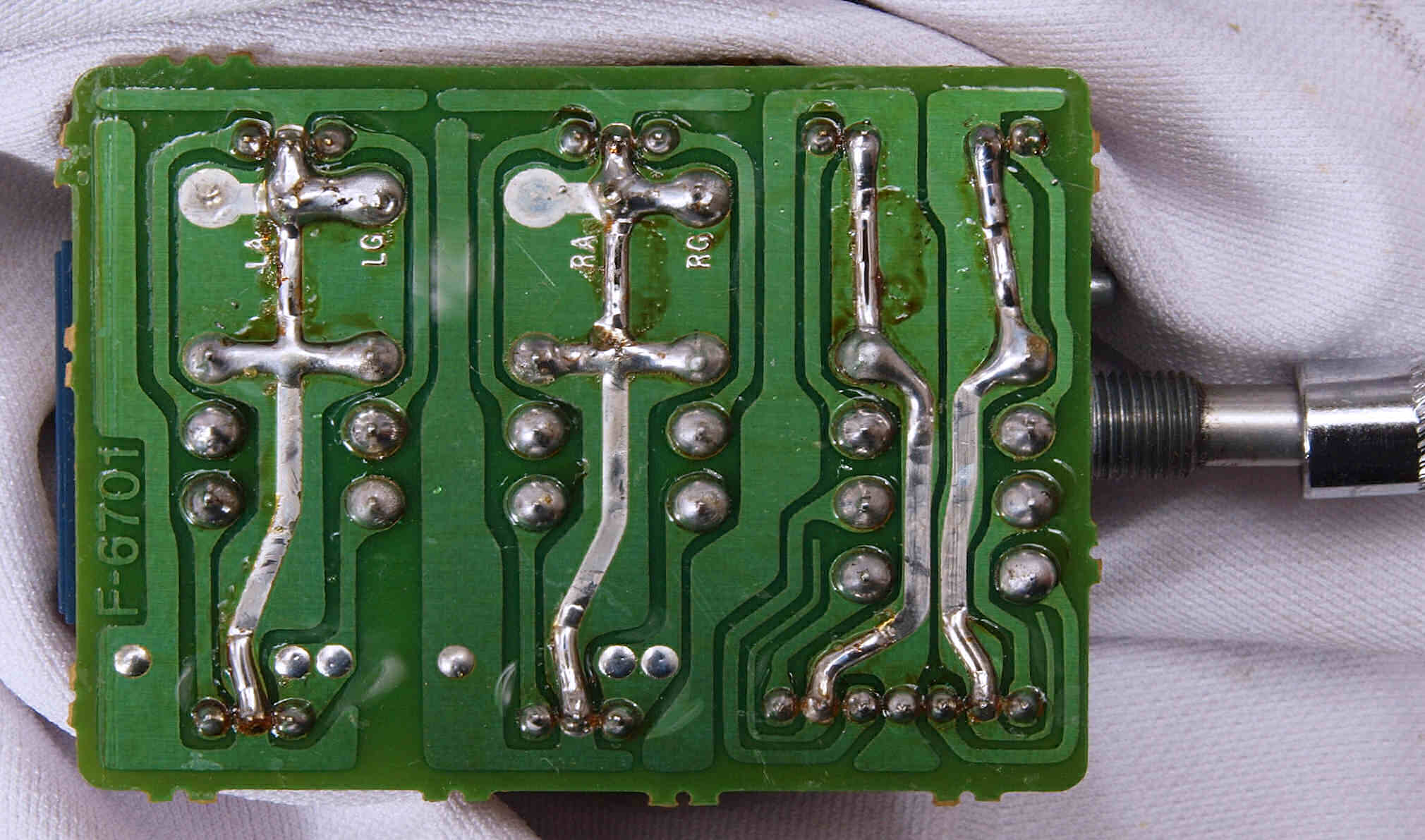 | C362. 修理前 L側・ドライブAMP基板、電解コンデンサー固定用の接着材、当時は溶媒にトルエンが使用されており、銅を腐食する。 | ||||||||||||||||||||||||||||||||||||||||||||||||