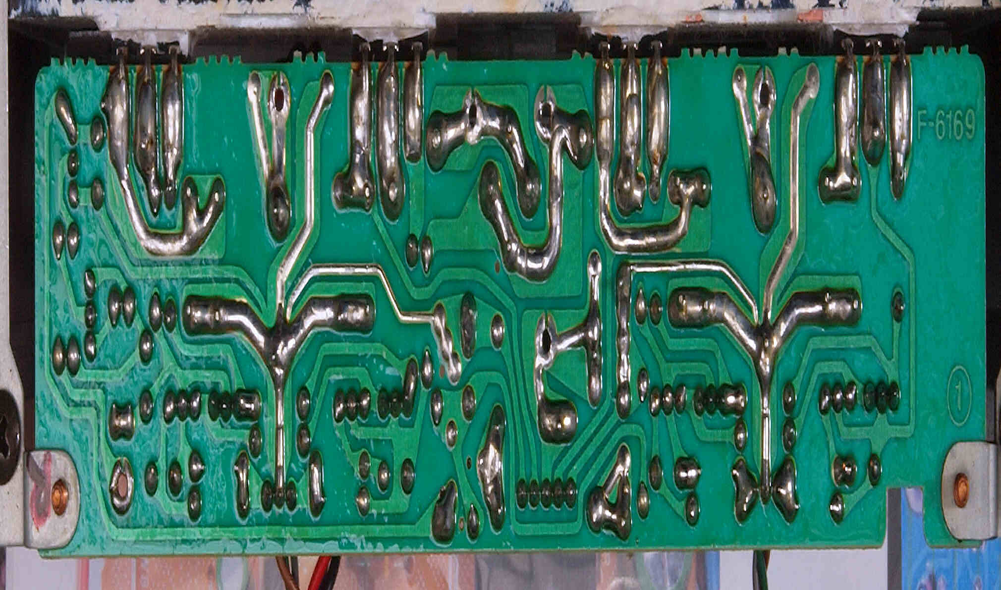 | C24. 修理(半田補正)後 R側・ドライブ終段TR(トランジスター)基板裏、 全半田やり直し。 | ||||||||||||||||||||||||||||||||||||||||||||||||