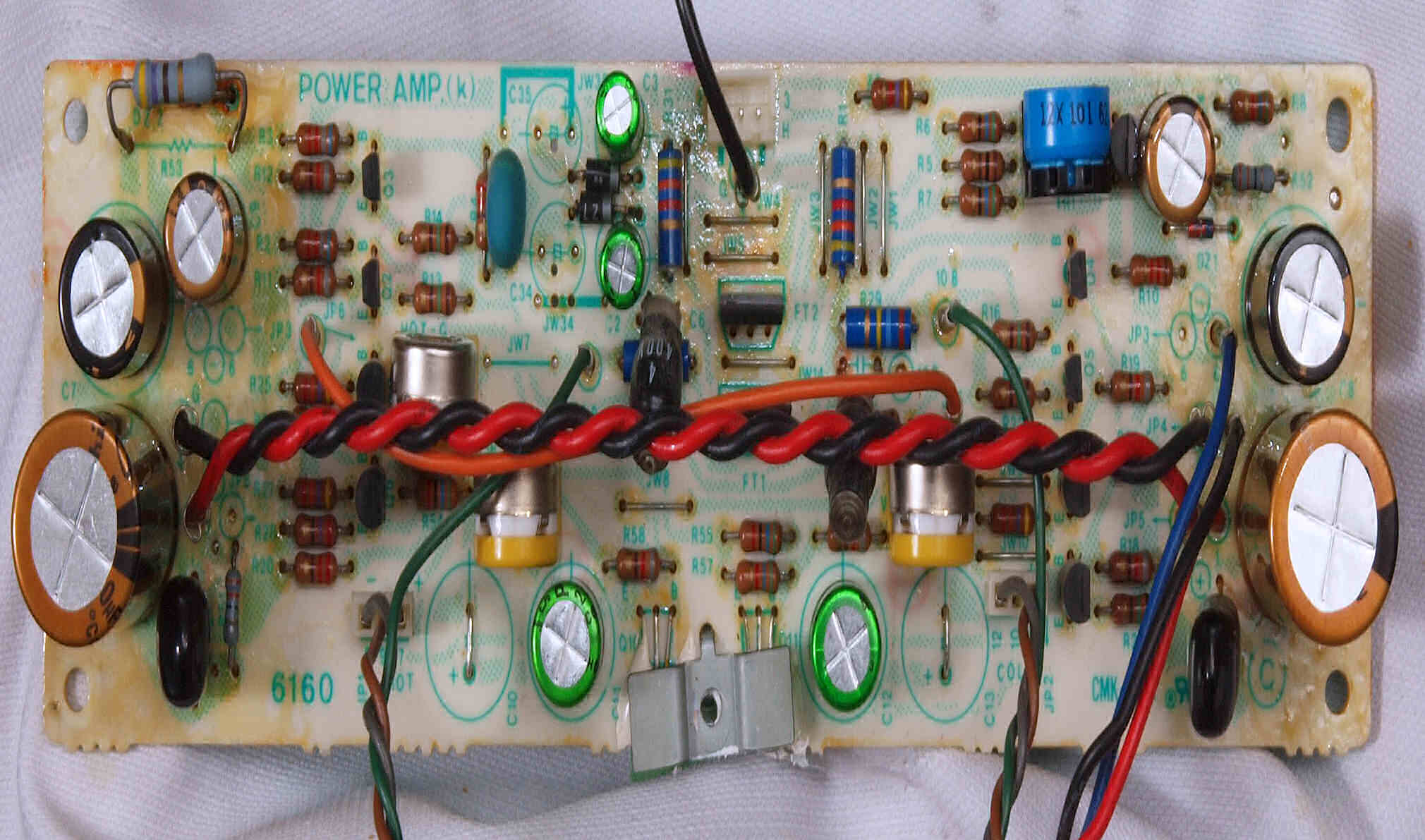 | C262. 修理前 R側・ドライブAMP基板、電解コンデンサー固定用の接着材、当時は溶媒にトルエンが使用されており、銅を腐食する。 | ||||||||||||||||||||||||||||||||||||||||||||||||