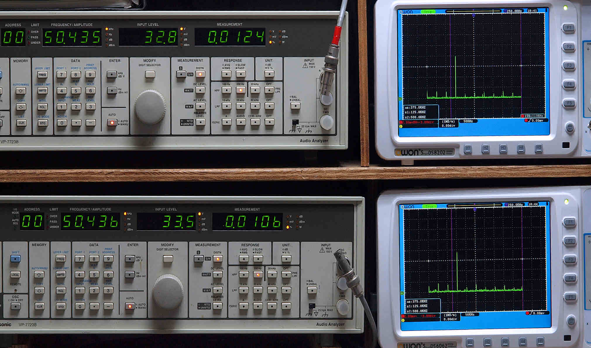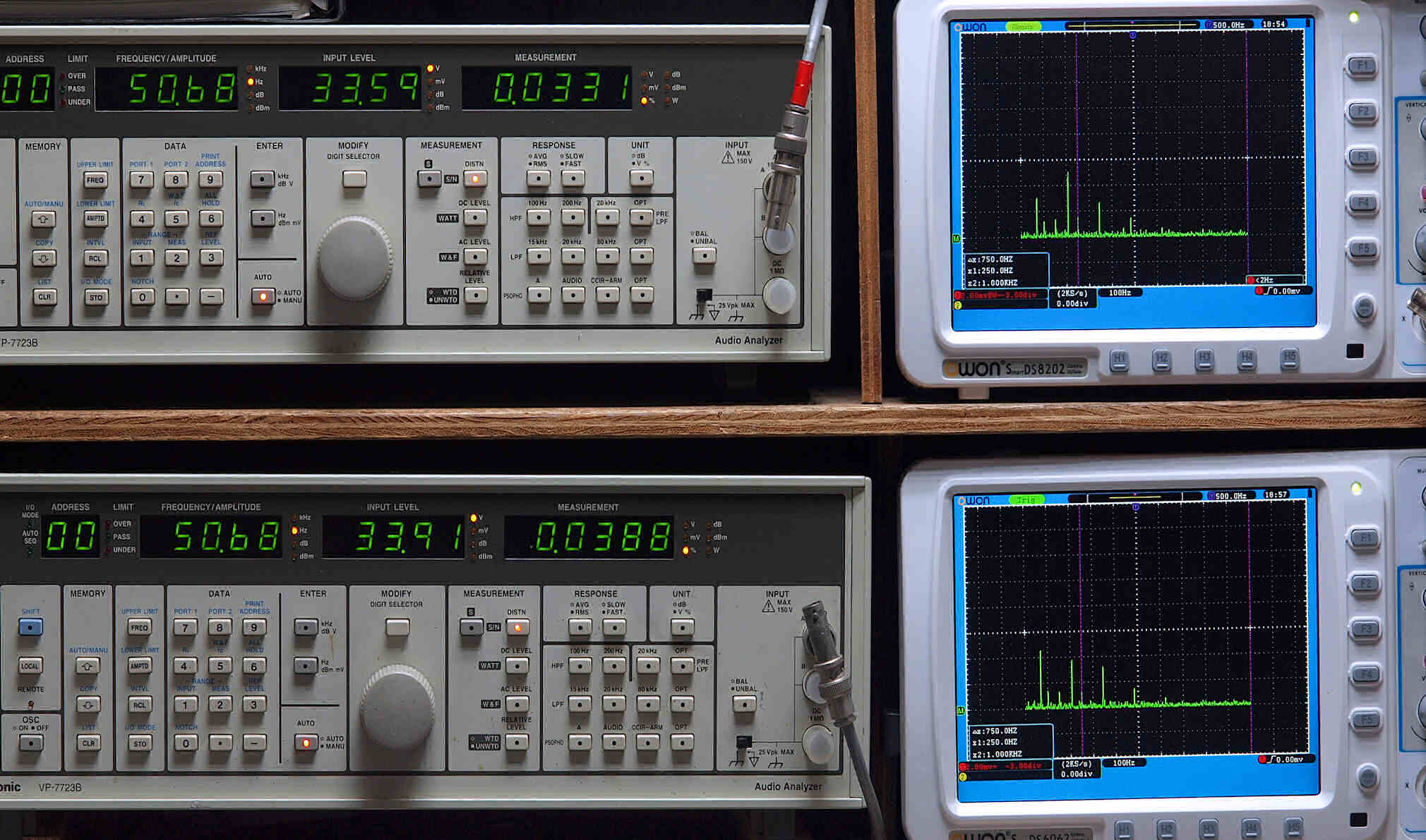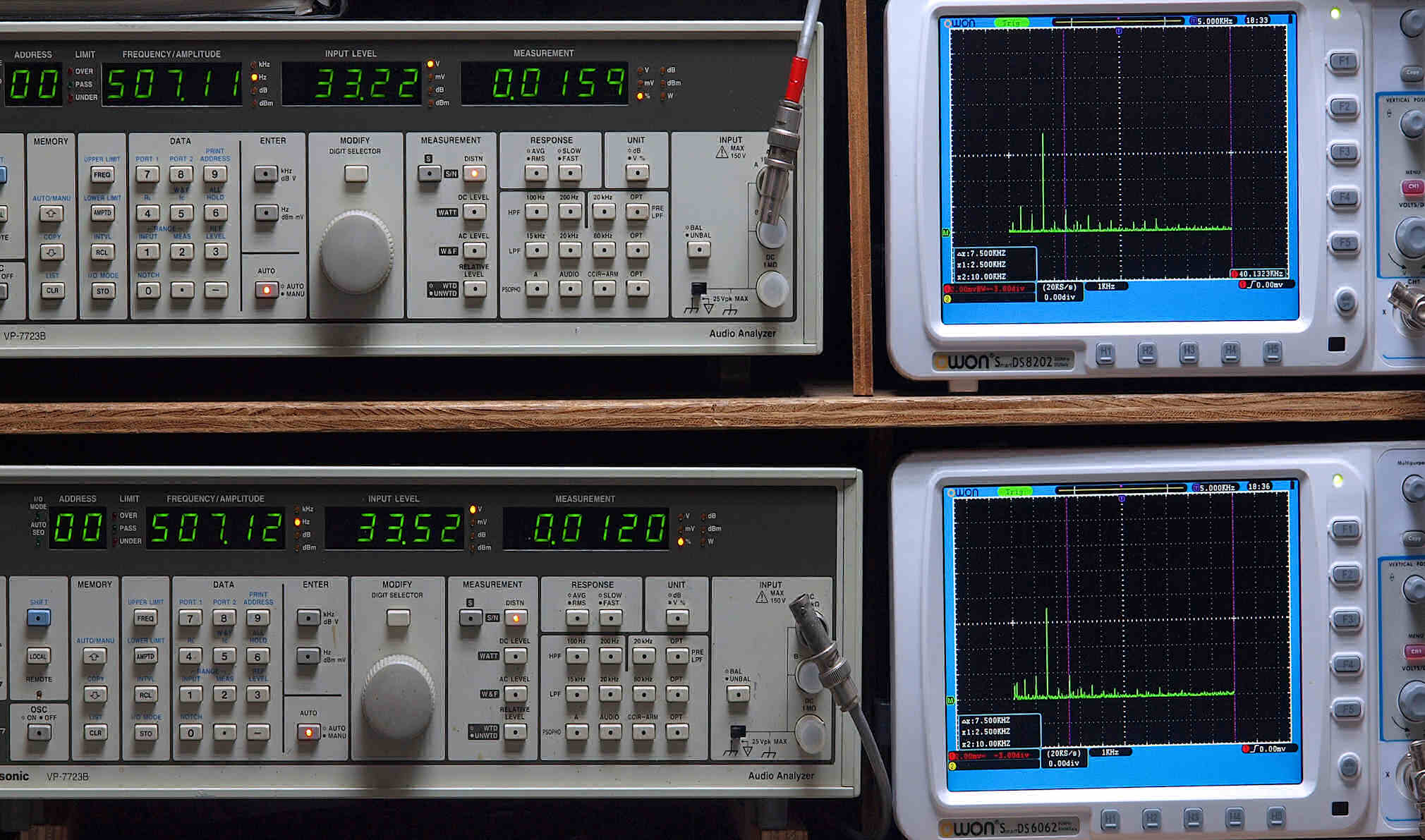 | E. 測定・調整。 画像をクリックすると、大きく(横幅2050ドット)表示されます。 E1. 出力・歪み率測定・調整 「見方」。 上段中 右側SP出力を「Audio Analyzer Panasonic VP−7723B」により測定。 表示LED、 左端=メモリーNo、 中左=周波数測定、 中右=出力電圧測定、 右端=歪み率測定。 上段右端 VP−7723Bの基本波除去出力を「owon SDS8202(200MHZ)」で「FFT分析」表示。 下段中 左側SP出力を「Audio Analyzer Panasonic VP−7723B」により測定。 表示LED、 左端=メモリーNo、 中左=周波数測定、 中右=出力電圧測定、 右端=歪み率測定。 下段右端 VP−7723Bの基本波除去出力を「owon SDS6062(200MHZ)」で「FFT分析」表示。 下段左端 オーディオ発振器 VP−7201A より50Hz〜100kHzの信号を出し(歪み率=約0.003%)、ATT+分配器を通し、AMPに入力。 よって、ダイアル設定出力レベルより低くなります。測定機器の仕様や整備の様子はこちら、「VP−7723B」「VP−7201A」。 FFT画面の見方はこちら。 |