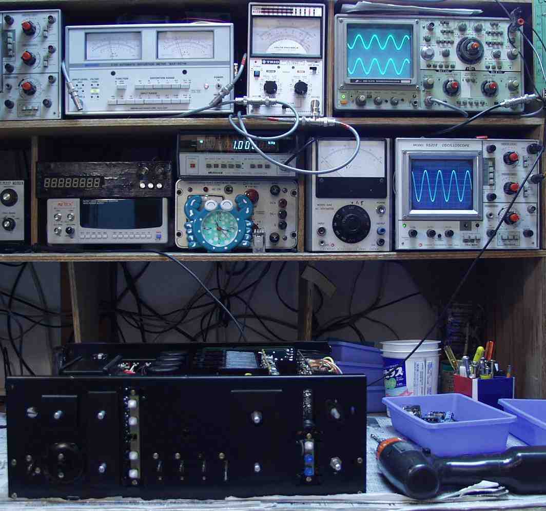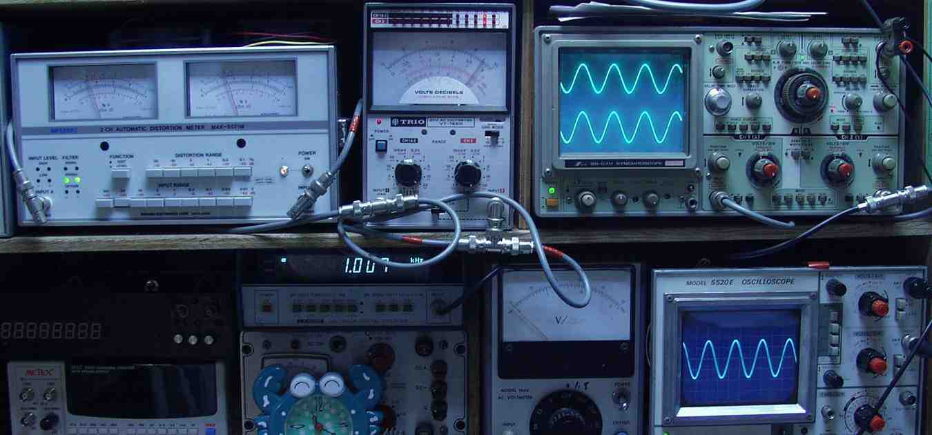 E−4B. 出力/歪み率測定・調整  出力=28V=98W 歪み率0.03% at=400HZ MC端子入力