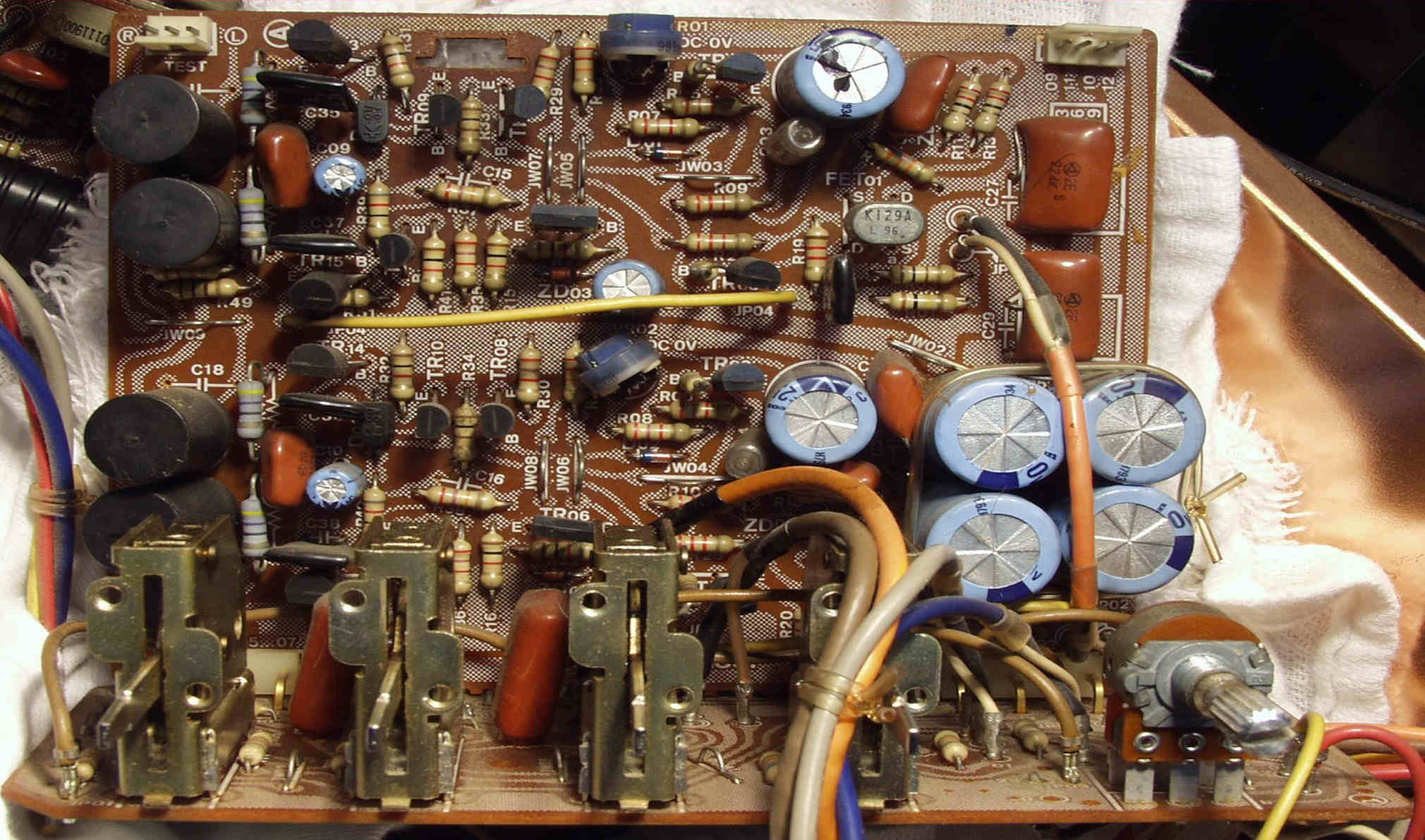 C−1B. 修理後 メイン・ドライブAMP基板 初段FET(電界効果トランジスター)2個、半固定VR4個、電解コンデンサー20個交換