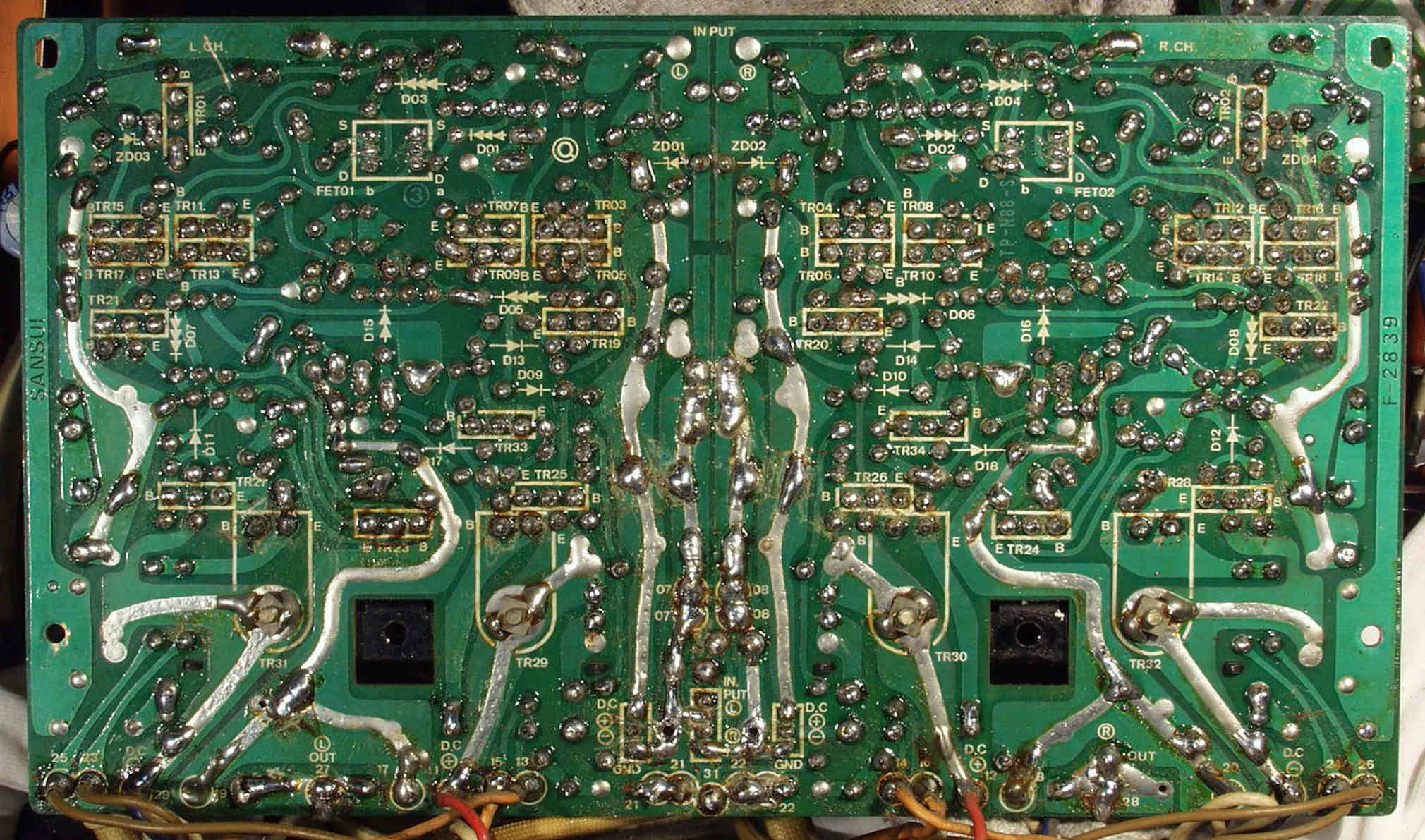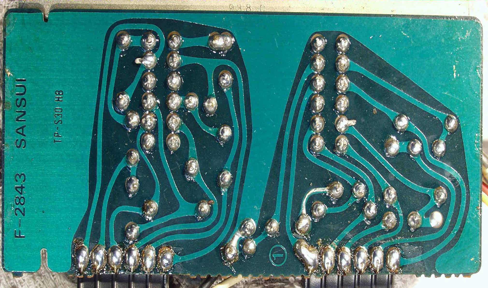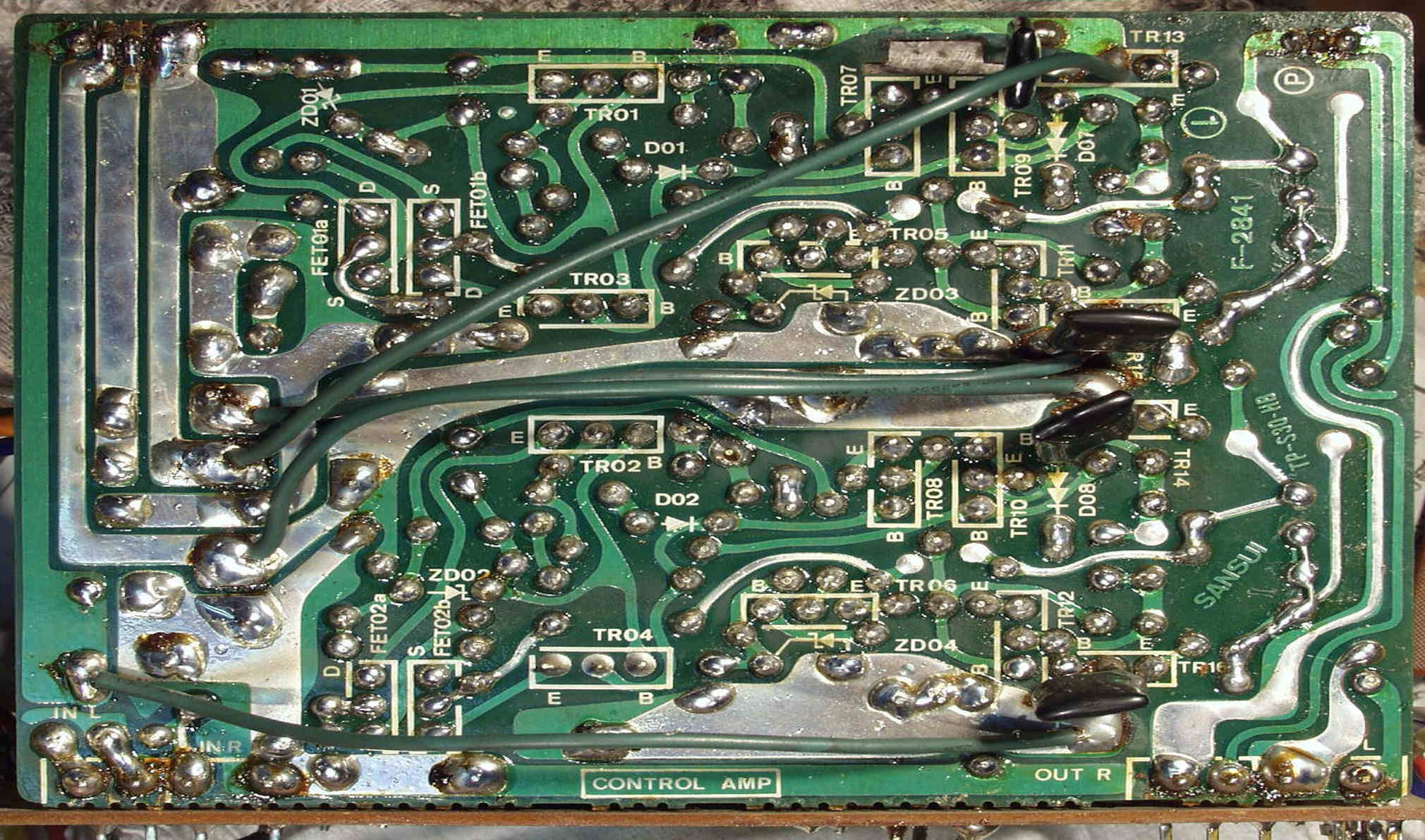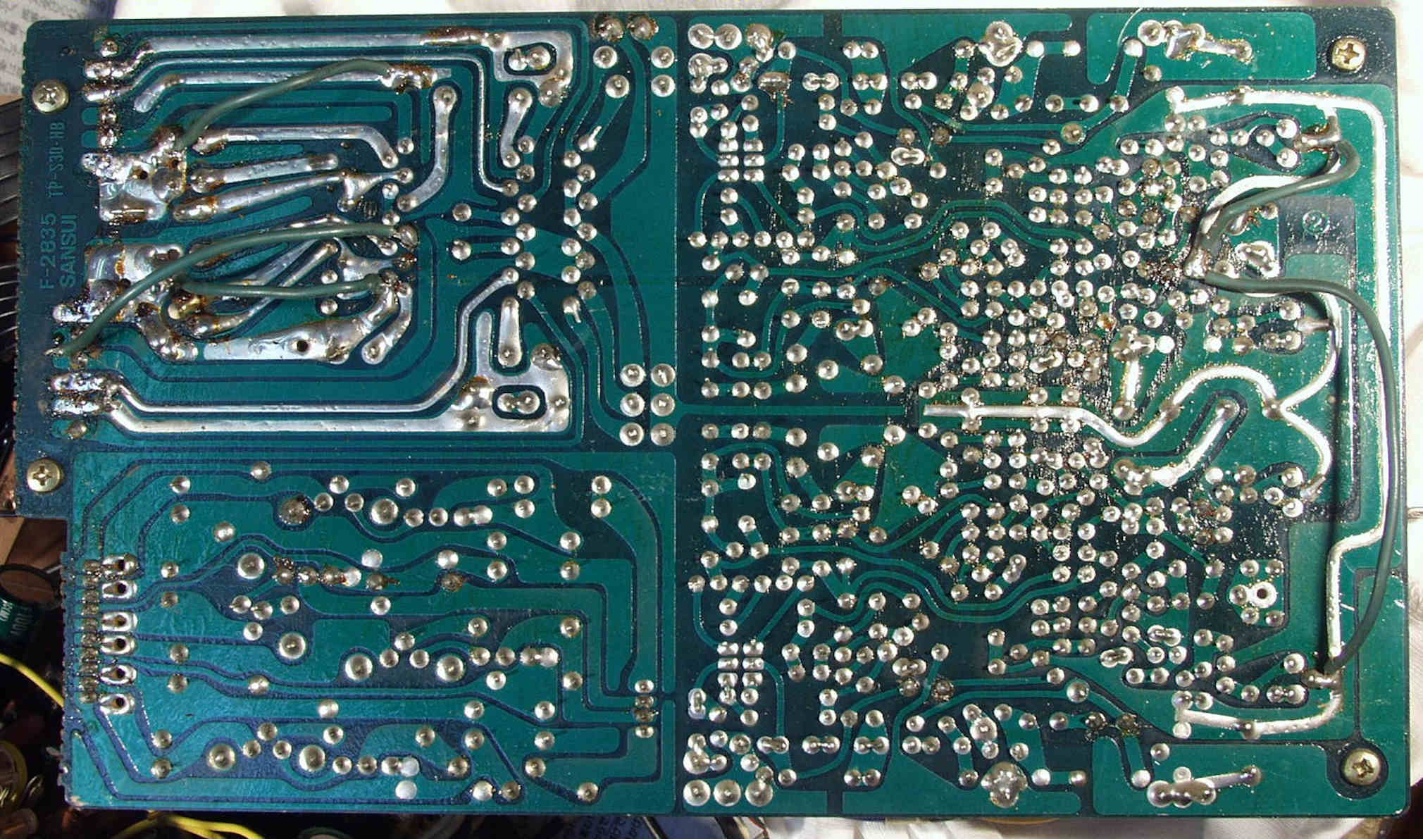 C−1C−2. 修理中 メイン・ドライブAMP基板裏 半田のりの悪いところ