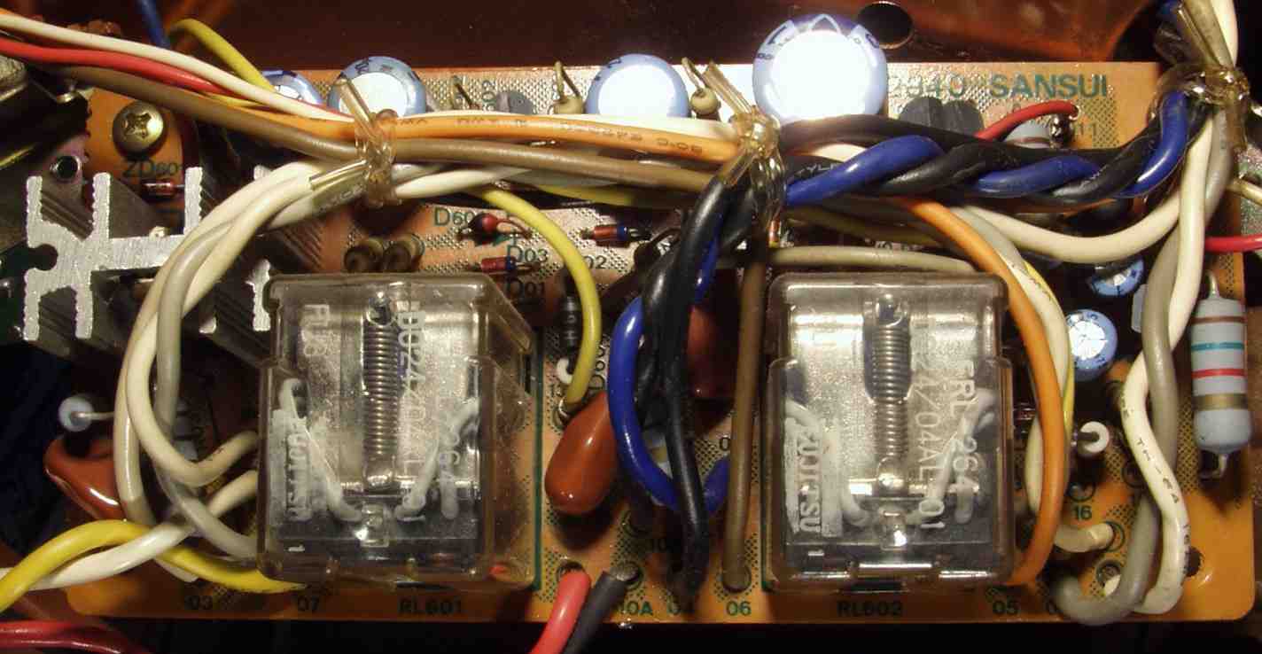 C−8B. 修理後 SP接続リレー・プロテクト基板 SP接続リレー2個、電解コンデンサー6個交換