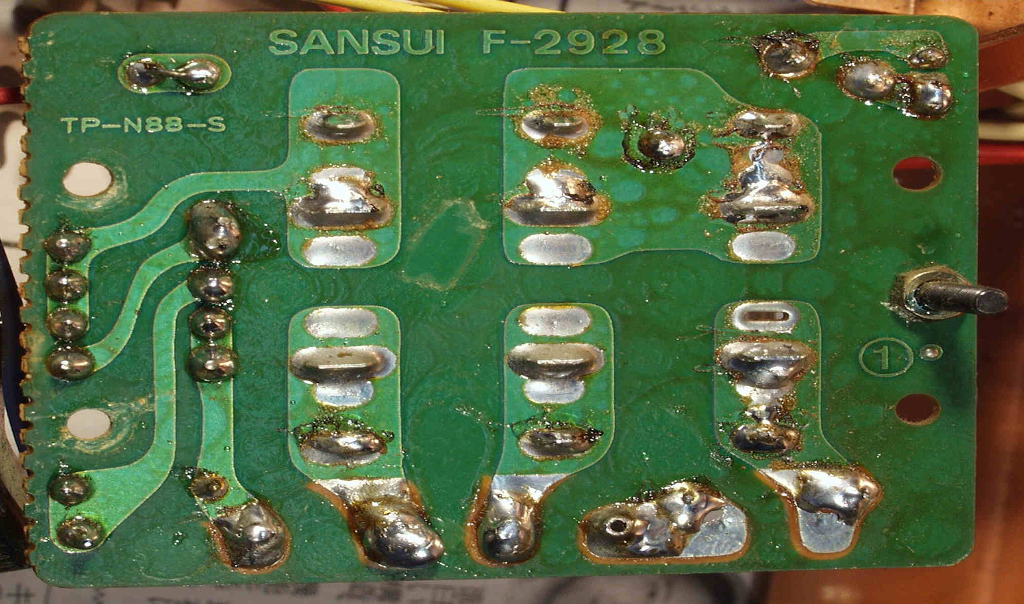 C−2H. 修理(半田補正)後  TapePlaySW基板 TapeCopySW基板裏 全ての半田をやり直す