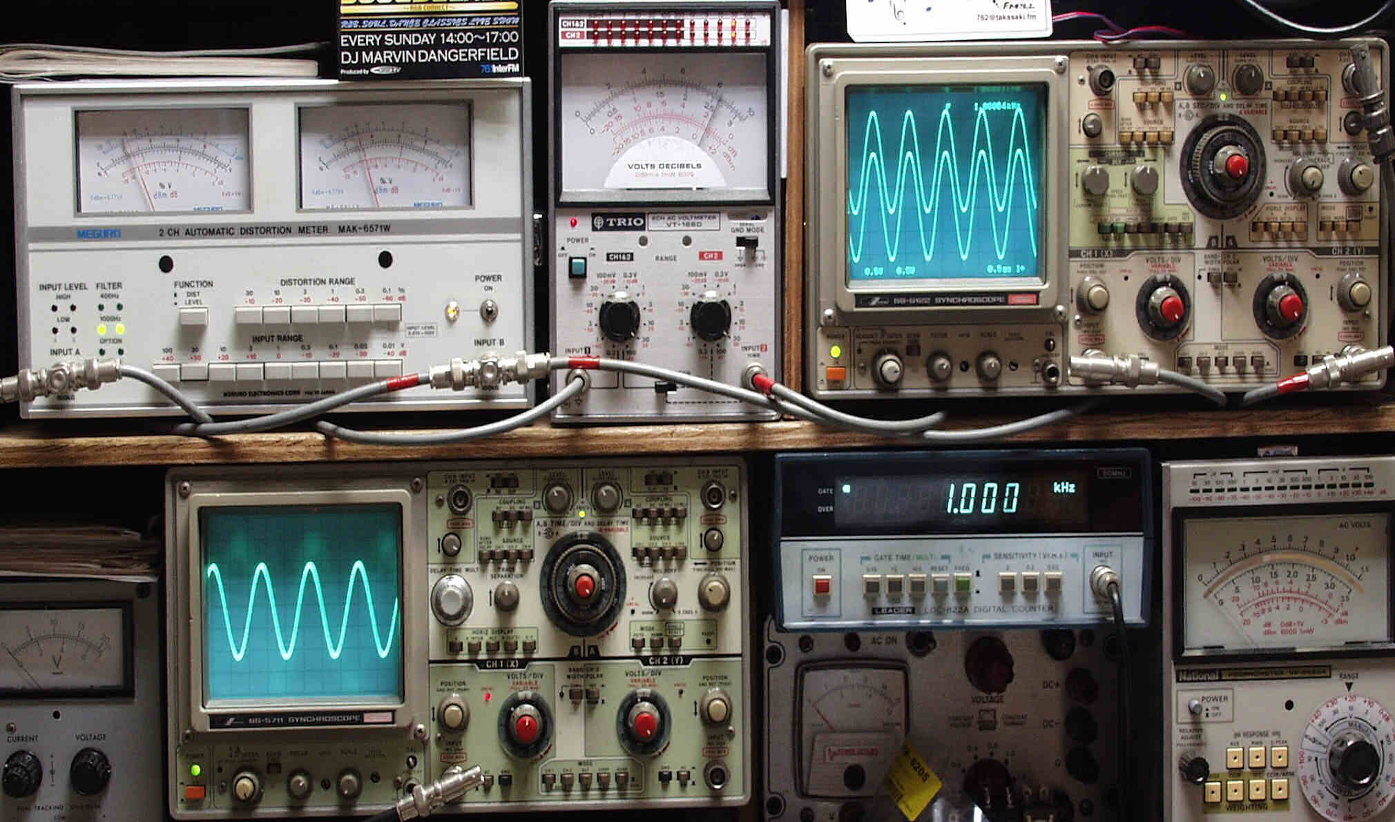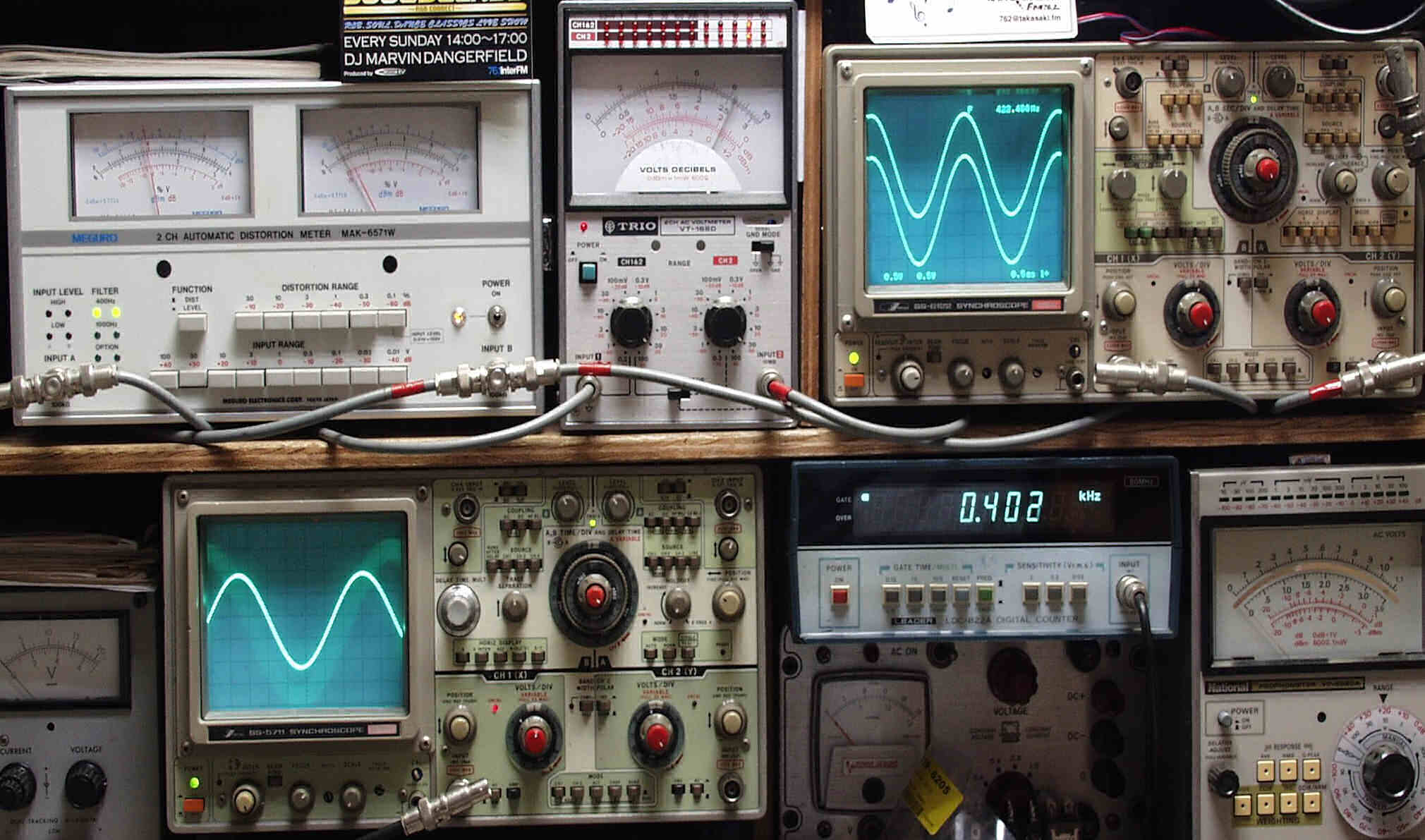 | E. 測定・調整 E1. 出力・歪み率測定・調整 <見方> 上左オーディオ発振器より400HZ・1KHZの信号を出す(歪み率=約0.003%) 下中=入力波形(オーディオ発振器のTTLレベル) 下右=周波数計 上左=SP出力の歪み率測定 左メータ=L出力、右メータ=R出力 上中=SP出力電圧測定器、赤針=R出力、黒針=L出力 上右=SP出力波形オシロ 上=R出力、下=L出力(出力電圧測定器の出力) |