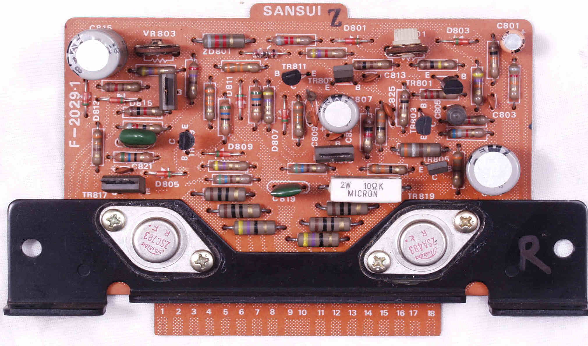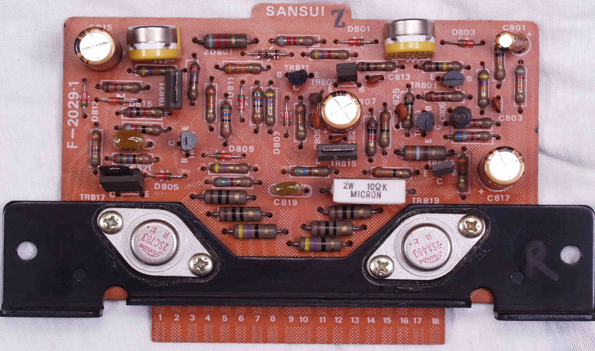 | C−2B. 修理後 R側終段基板 TR(トランジスター)2個 半固定VR2個 電解コンデンサー4個 フイルムコンデンサー2個交換 | ||||||||||||||||||||||||||||||||||||||||||