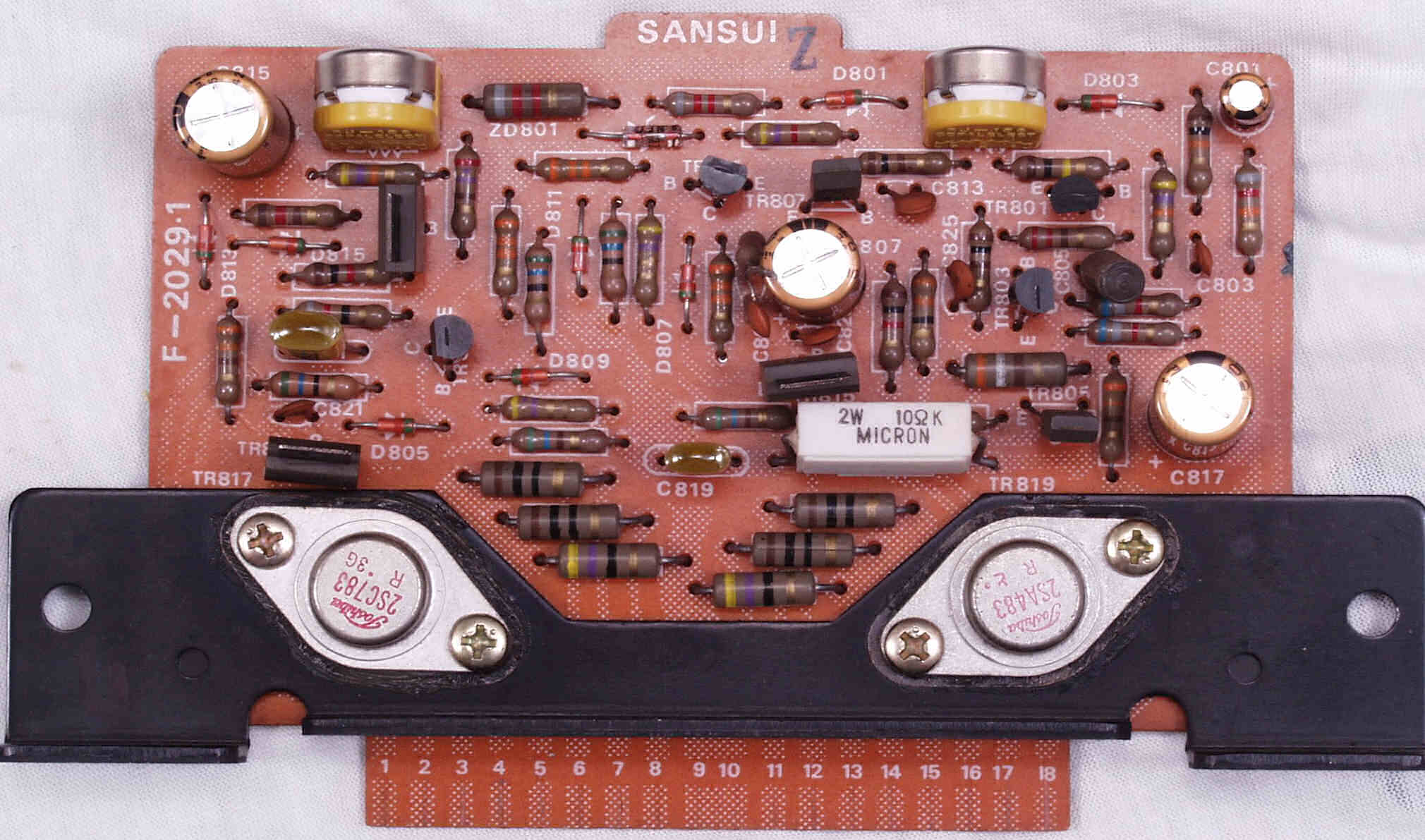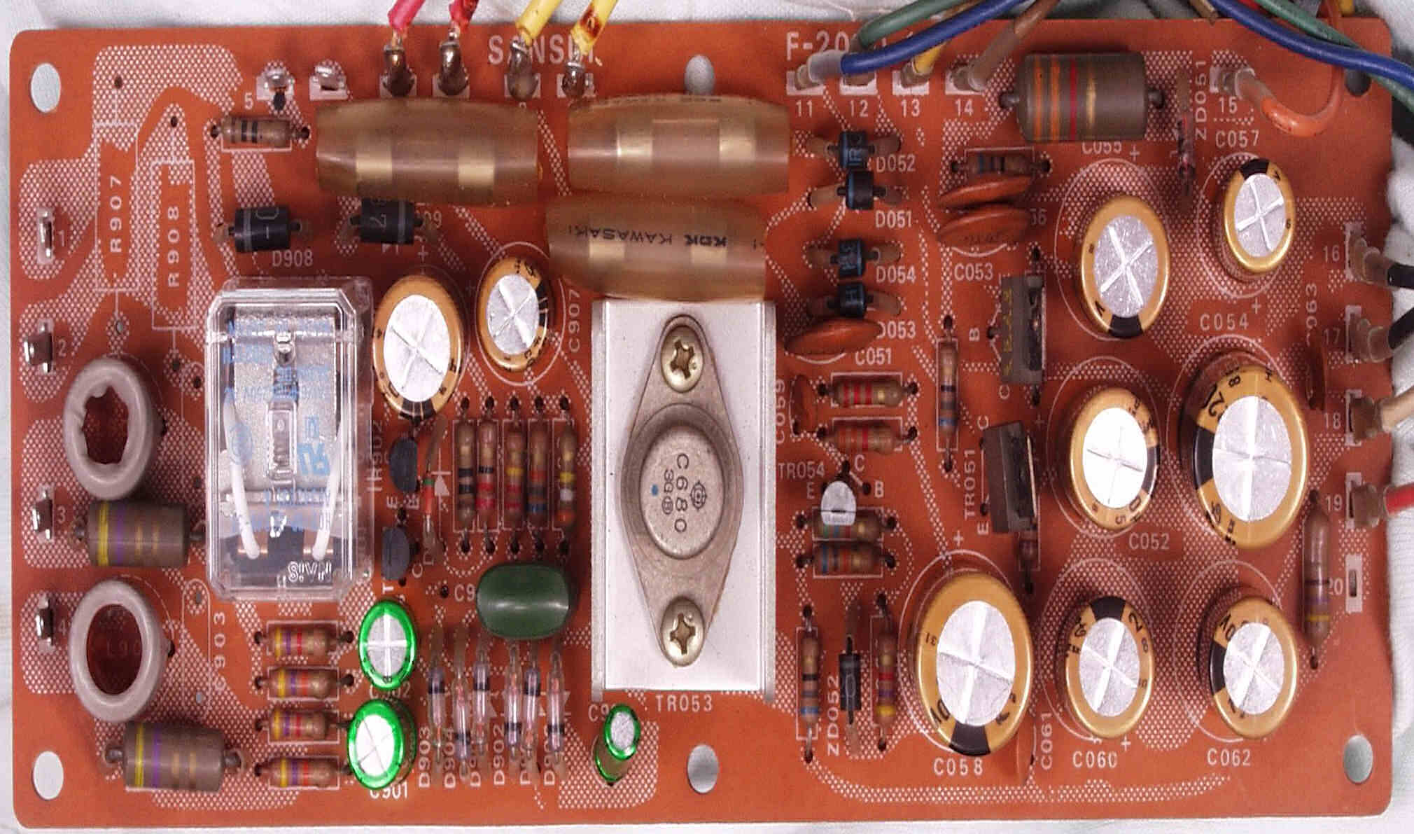 | C3B. 修理後 L側終段基板 TR(トランジスター)2個 半固定VR2個 電解コンデンサー4個 フイルムコンデンサー2個交換 | ||||||||||||||||||||||||||||||||||||||||||