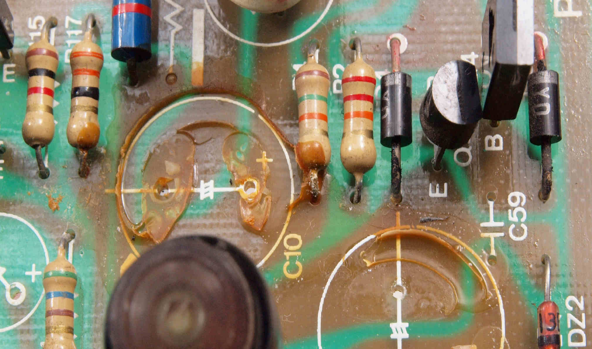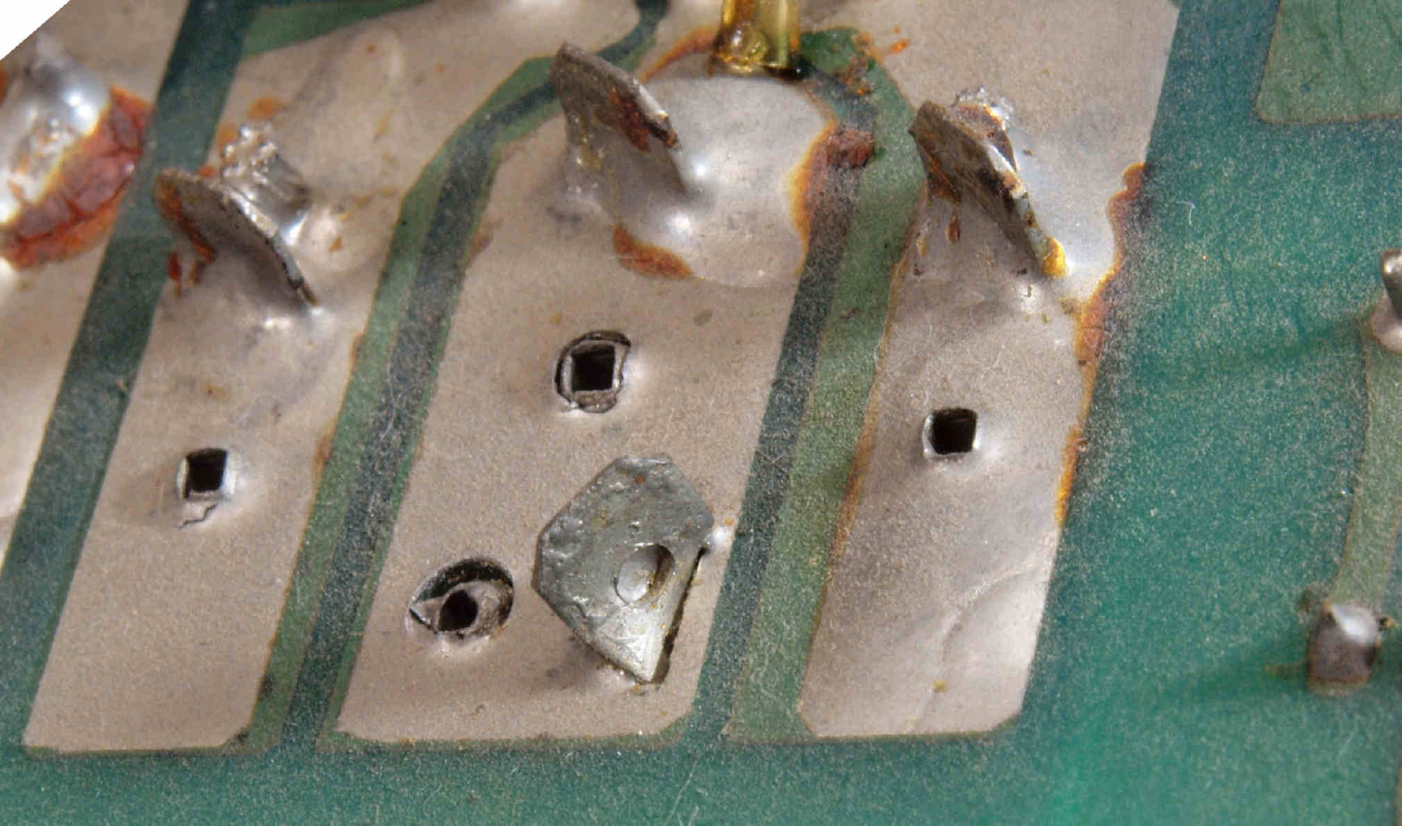 | C134. 修理中 R側AMP基板、電解コンデンサー固定用の接着材2、当時は溶媒にトルエンが使用されており、銅を腐食する。 | ||||||||||||||||||||||||||||||