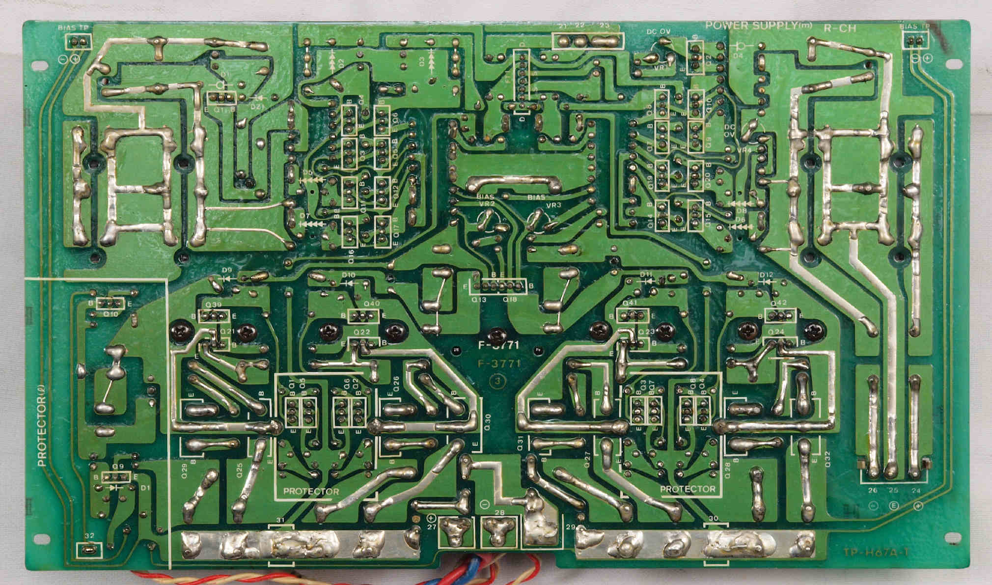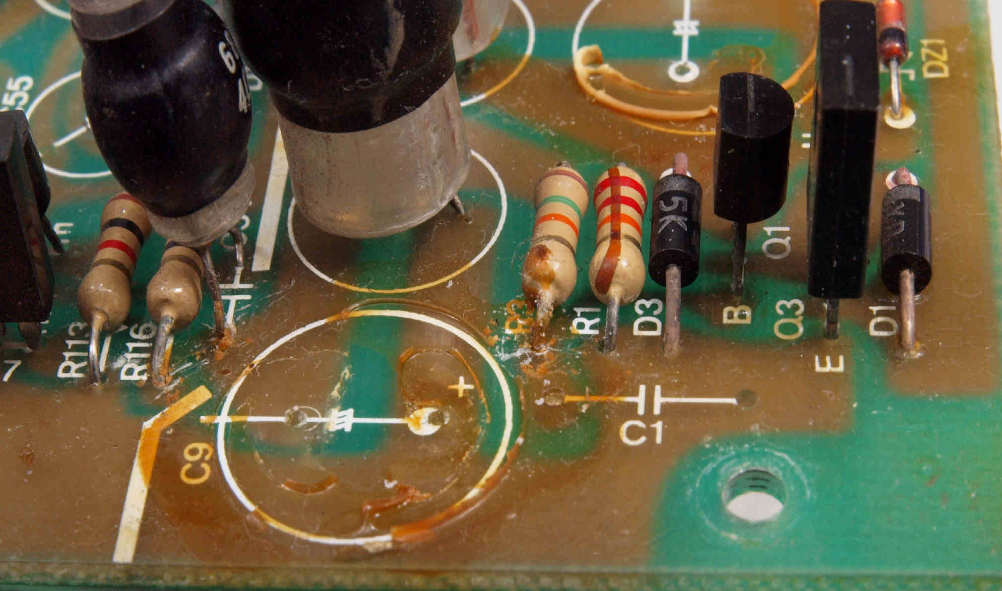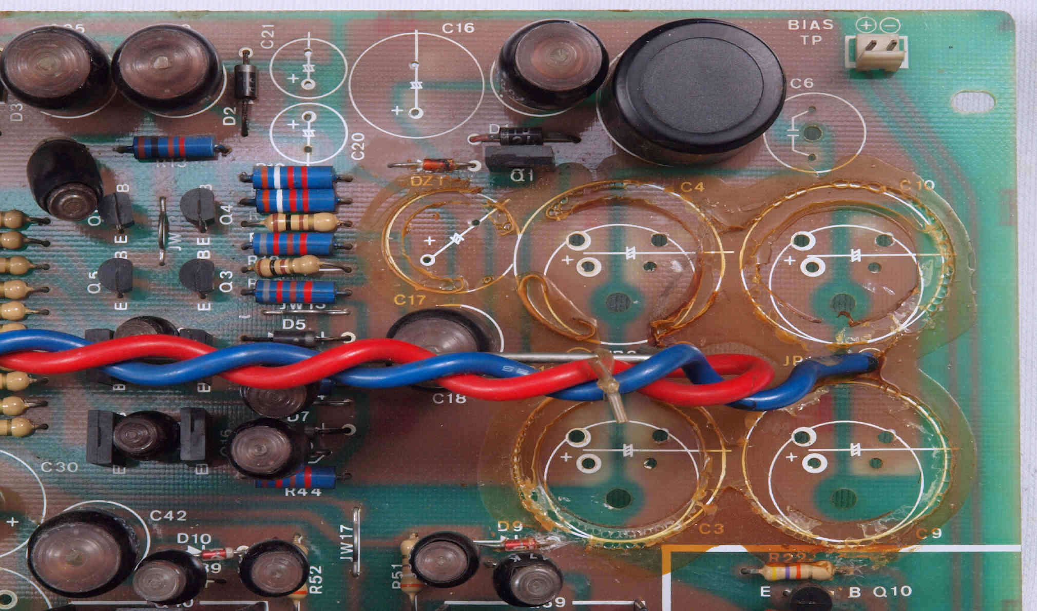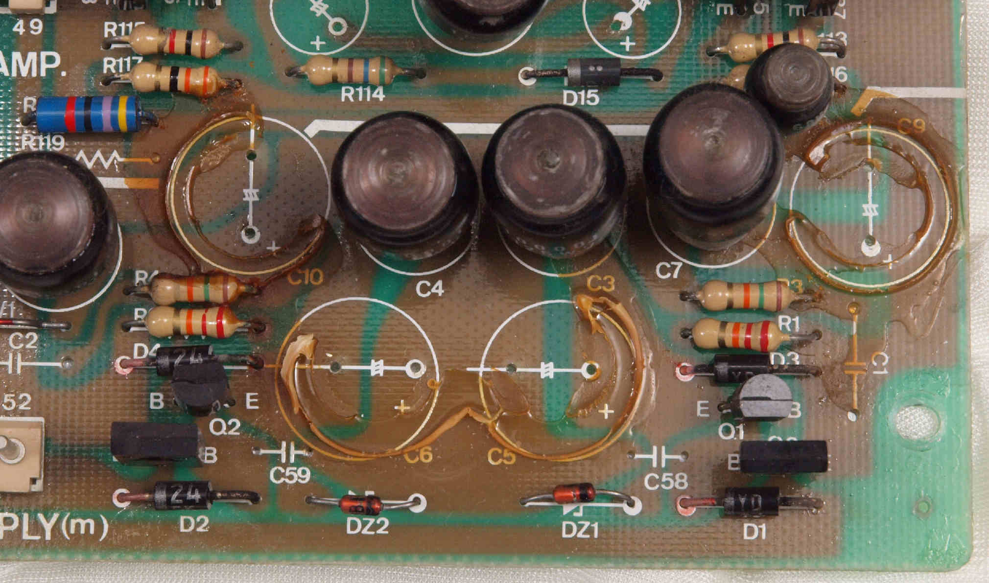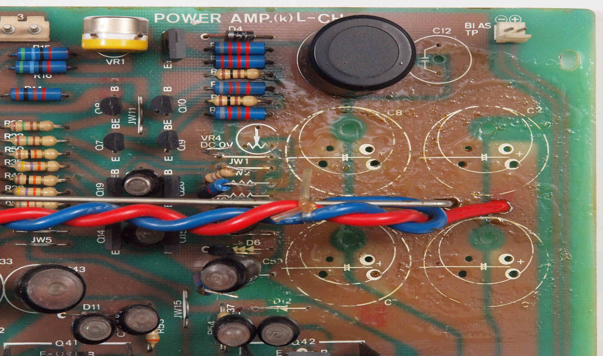 | C132. 修理中 R側AMP基板、電解コンデンサー固定用の接着材、当時は溶媒にトルエンが使用されており、銅を腐食する。 | ||||||||||||||||||||||||||||||