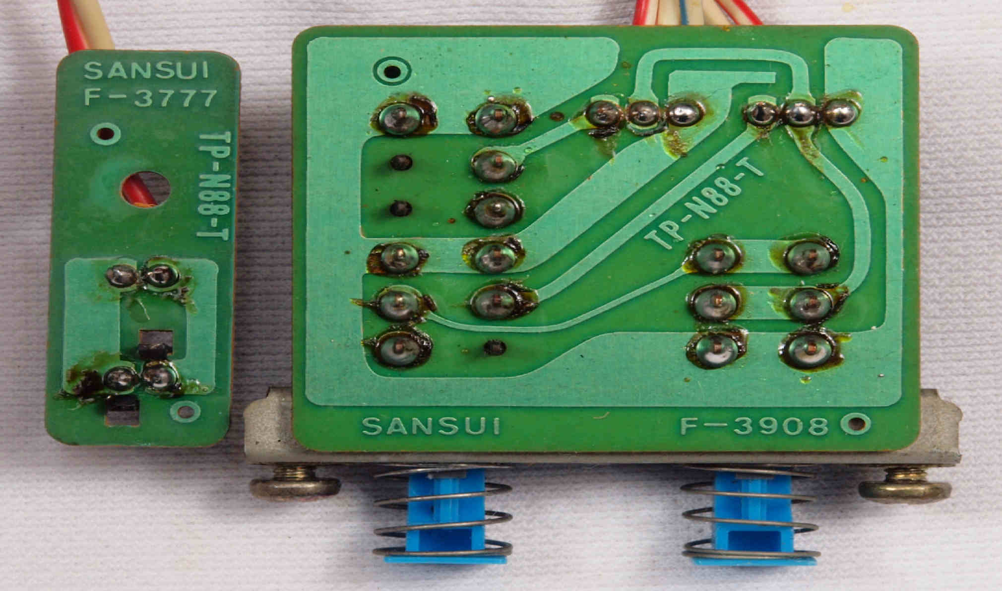 | C513. 修理中 入力VR基板、 SW3には接点復活剤が軸までも多量に注入されている。 これだけ使用されると、軸の潤滑剤のグリスが溶け出し、接点に皮膜を作り、接点不良になる。 |