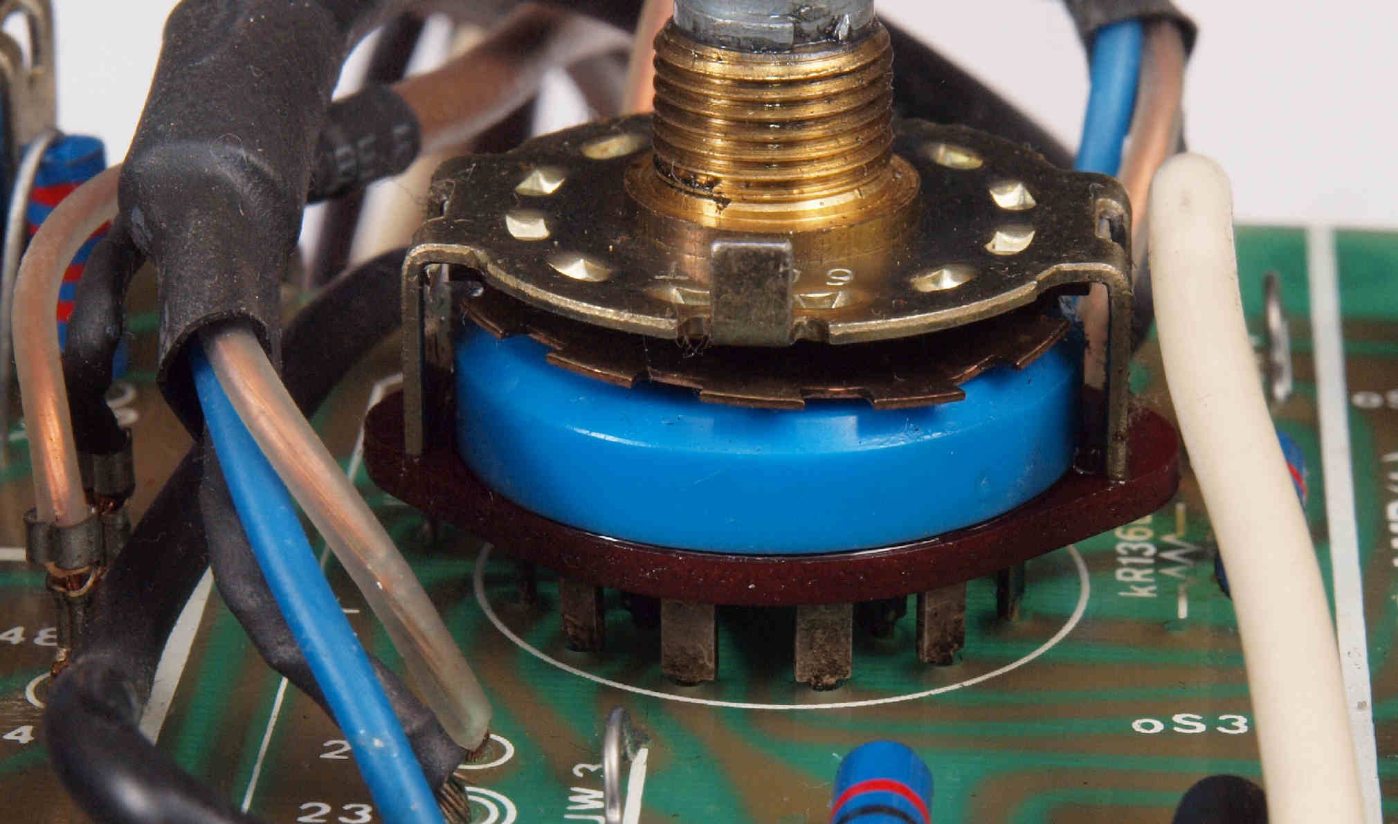 | C512. 修理中 入力VR基板、 SW2には接点復活剤が軸までも多量に注入されている。 これだけ使用されると、軸の潤滑剤のグリスが溶け出し、接点に皮膜を作り、接点不良になる。 |