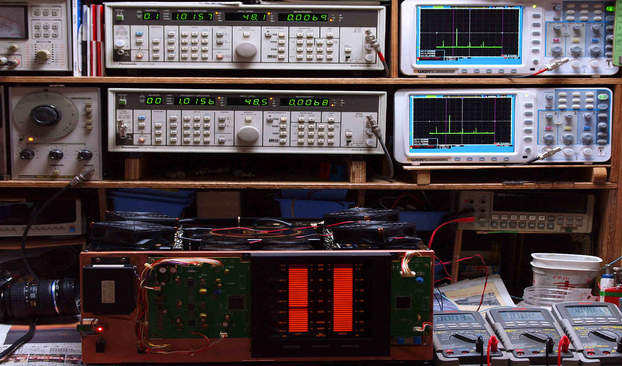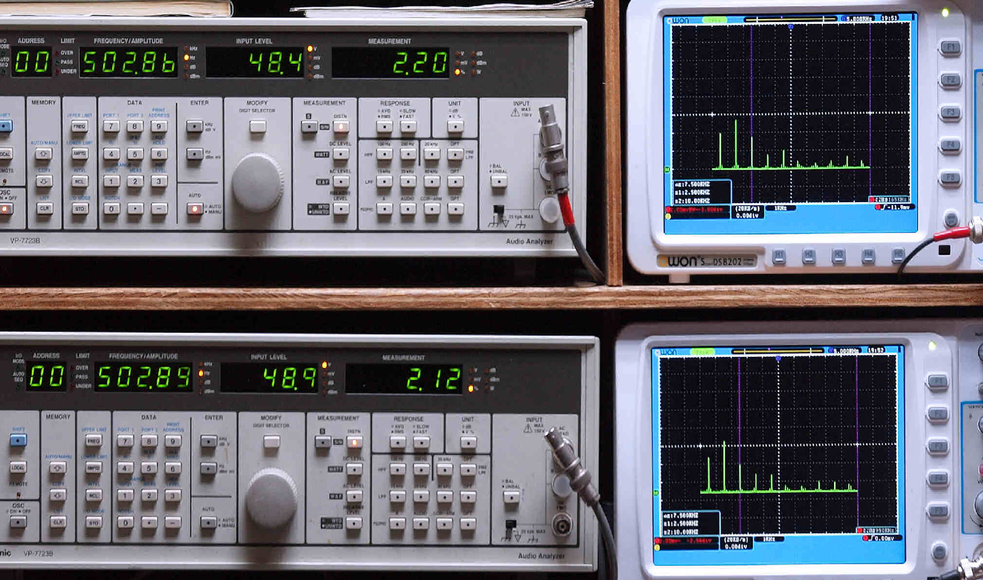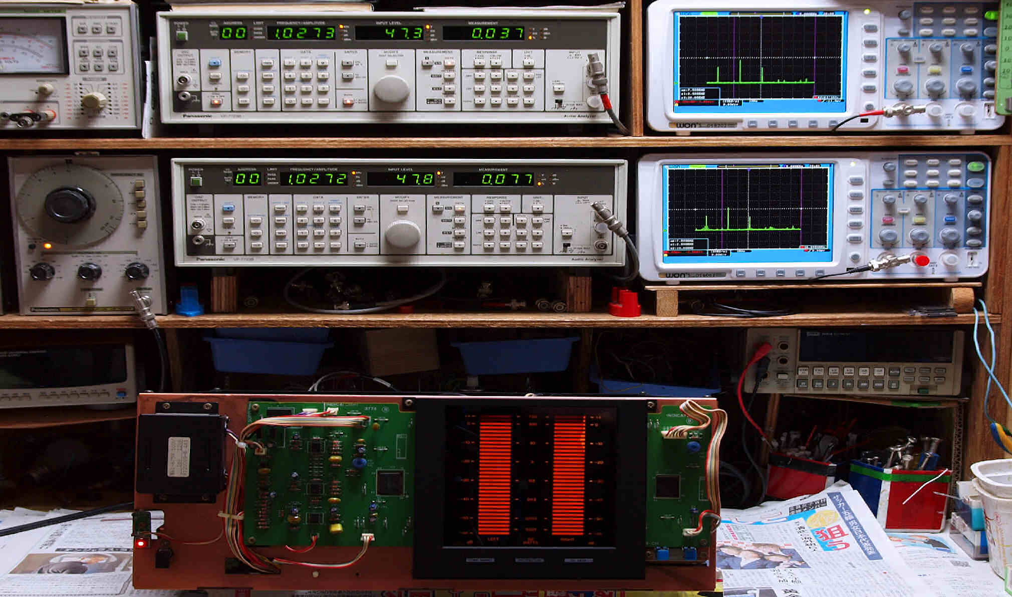 | E. 測定・調整。 画像をクリックすると、大きく(横幅2050ドット)表示されます E1. 出力・歪み率測定・調整 「見方」。 上段中 右側SP出力を「Audio Analyzer Panasonic VP−7723B」により測定。 表示LED、 左端=メモリーNo、 中左=周波数測定、 中右=出力電圧測定、 右端=歪み率測定。 上段右端 VP−7723Bの基本波除去出力を「owon SDS8202(200MHZ)」で「FFT分析」表示。 下段中 左側SP出力を「Audio Analyzer Panasonic VP−7723B」により測定。 表示LED、 左端=メモリーNo、 中左=周波数測定、 中右=出力電圧測定、 右端=歪み率測定。 下段右端 VP−7723Bの基本波除去出力を「owon SDS6062(200MHZ)」で「FFT分析」表示。 下段左端 オーディオ発振器 VP−7201A より50Hz〜100kHzの信号を出し(歪み率=約0.003%)、ATT+分配器を通し、AMPに入力。 よって、ダイアル設定出力レベルより低くなります。測定機器の仕様や整備の様子はこちら、「VP−7723B」「VP−7201A」。 FFT画面の見方はこちら。 |