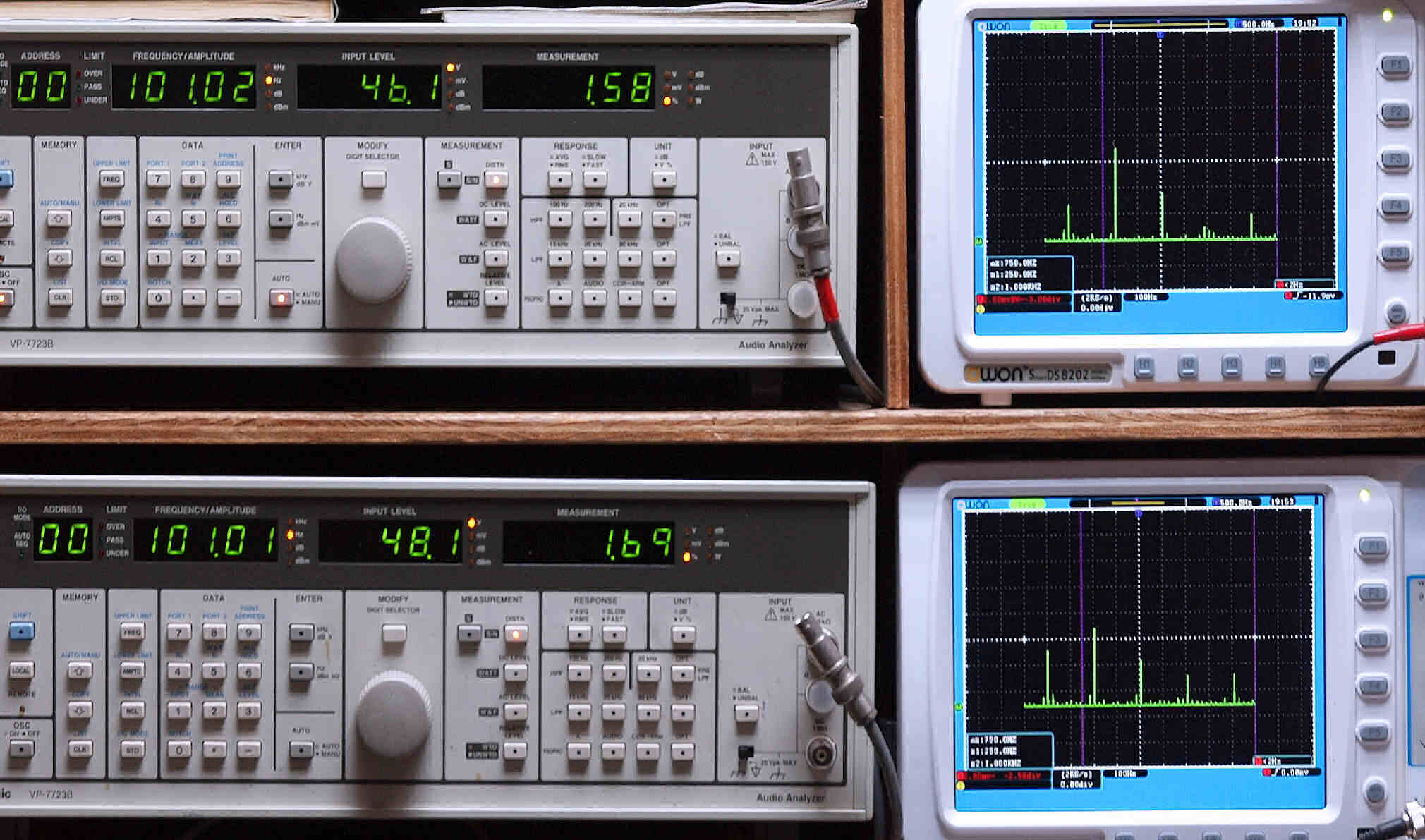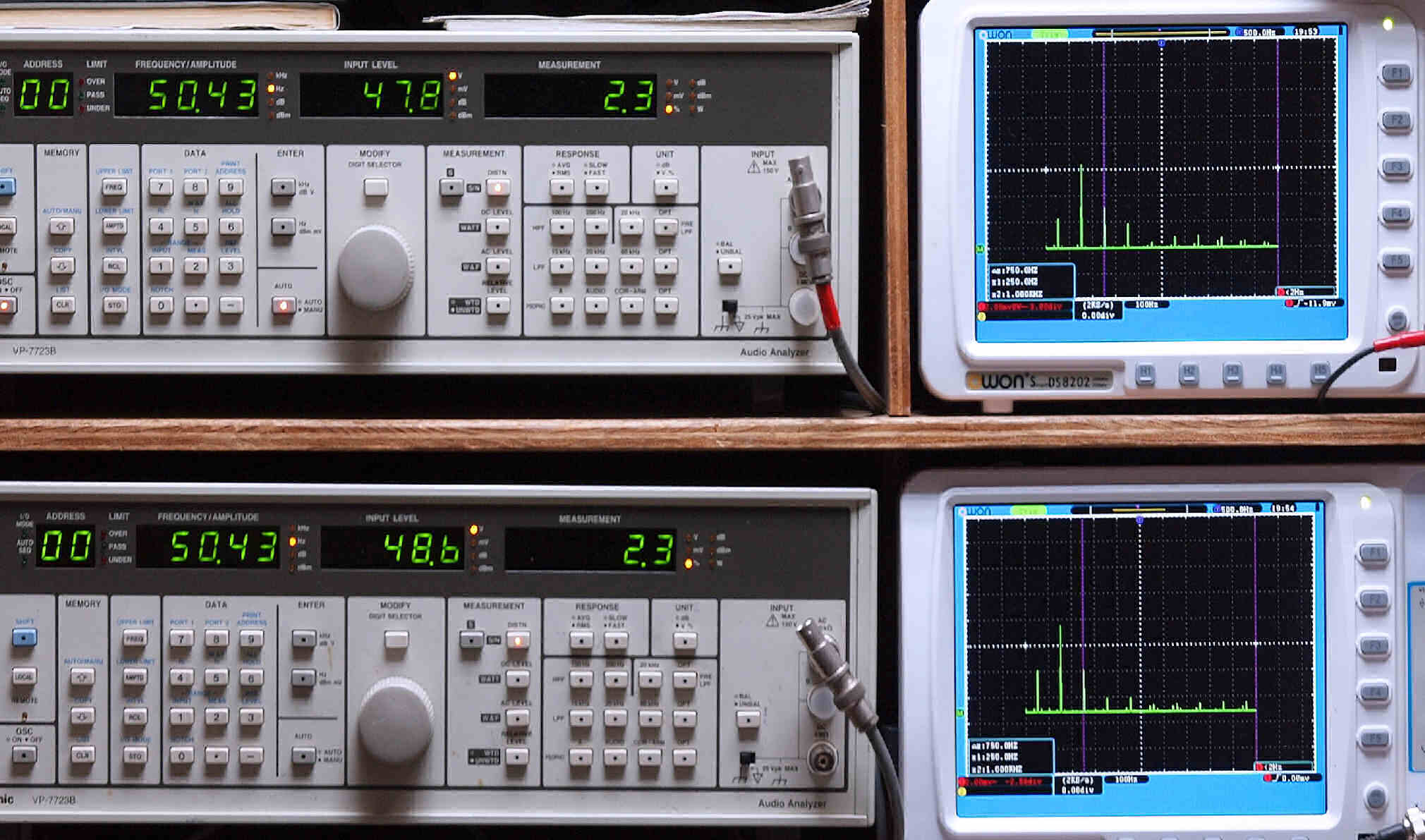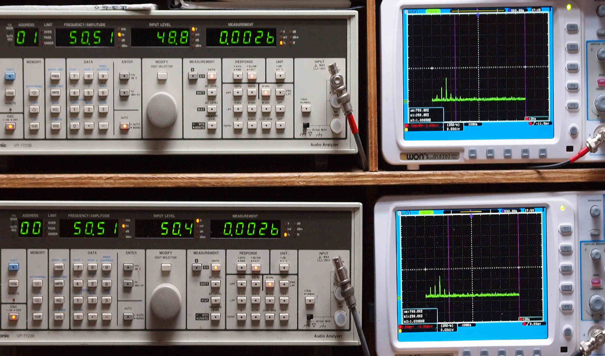| E. 測定・調整。 画像をクリックすると、大きく(横幅2050ドット)表示されます E1. 出力・歪み率測定・調整 「見方」。 上段中 右側SP出力を「Audio Analyzer Panasonic VP−7723B」により測定。 表示LED、 左端=メモリーNo、 中左=周波数測定、 中右=出力電圧測定、 右端=歪み率測定。 上段右端 VP−7723Bの基本波除去出力を「owon SDS8202(200MHZ)」で「FFT分析」表示。 下段中 左側SP出力を「Audio Analyzer Panasonic VP−7723B」により測定。 表示LED、 左端=メモリーNo、 中左=周波数測定、 中右=出力電圧測定、 右端=歪み率測定。 下段右端 VP−7723Bの基本波除去出力を「owon SDS6062(200MHZ)」で「FFT分析」表示。 下段左端 オーディオ発振器 VP−7201A より50Hz〜100kHzの信号を出し(歪み率=約0.003%)、ATT+分配器を通し、AMPに入力。 よって、ダイアル設定出力レベルより低くなります。測定機器の仕様や整備の様子はこちら、「VP−7723B」「VP−7201A」。 FFT画面の見方はこちら。 |