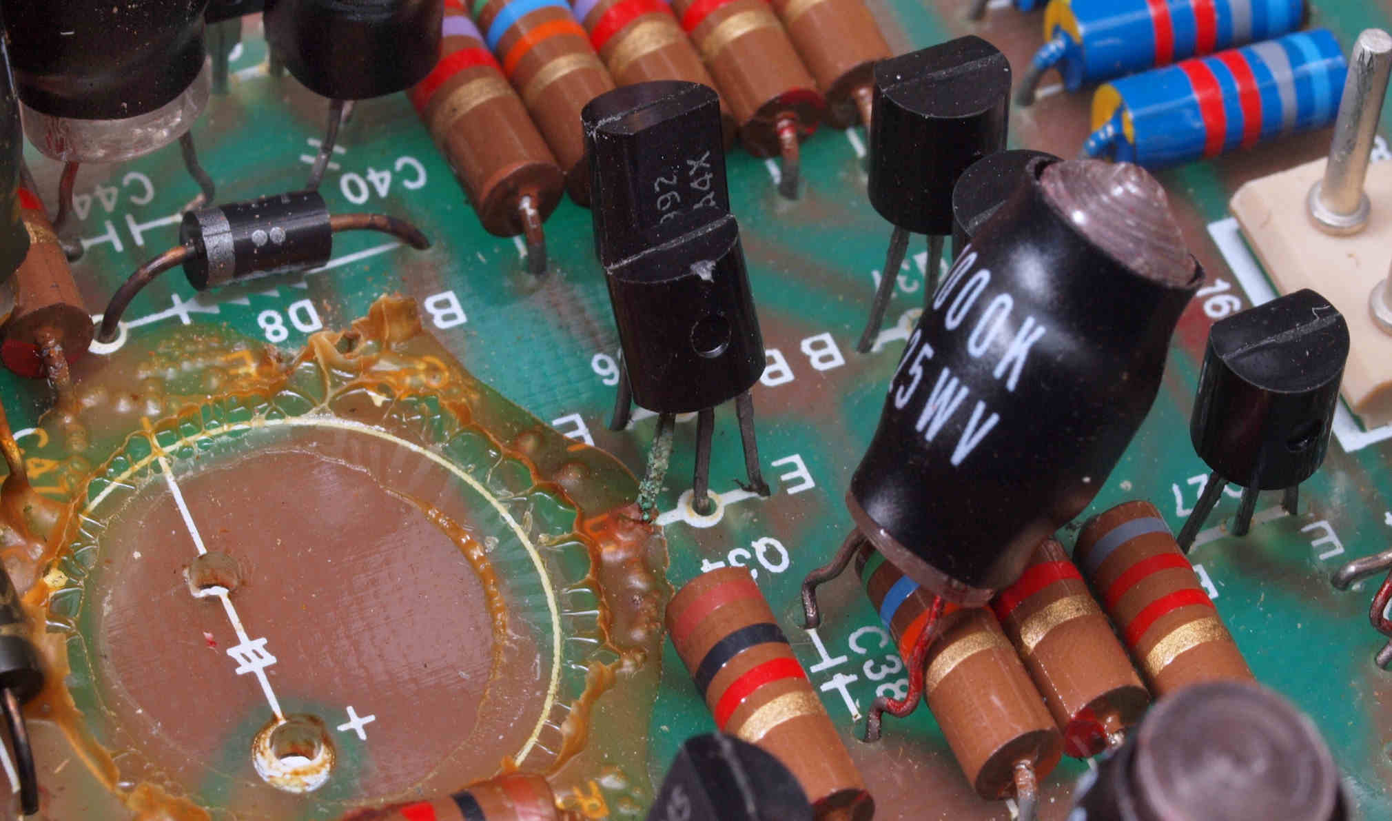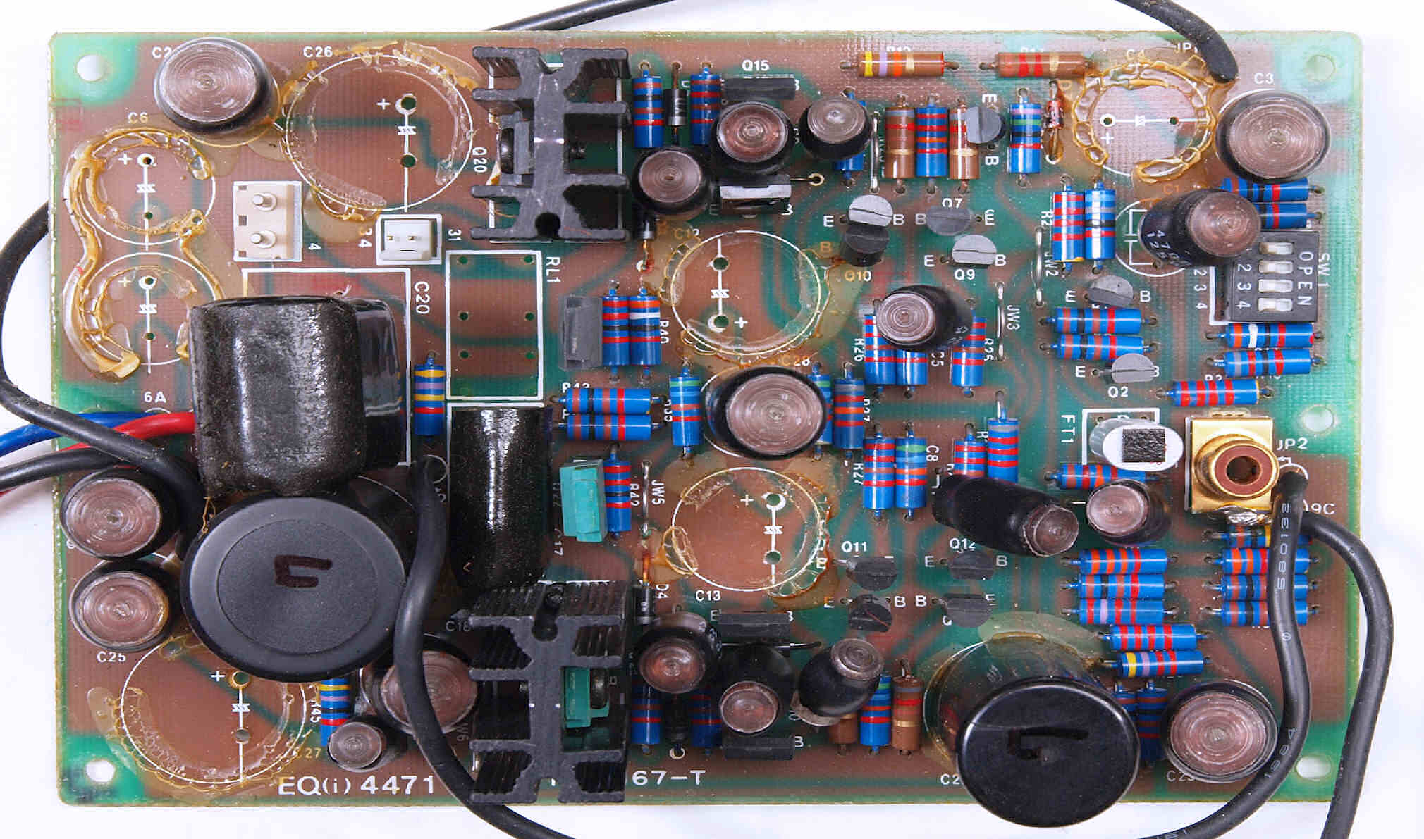C512. 修理中 R側EQ−AMP、 電解コンデンサー固定用の接着材、当時は溶媒にトルエンが使用されており、銅を腐食する。