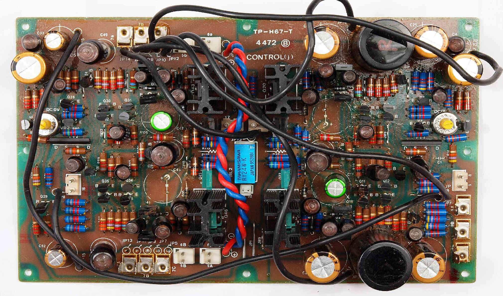 C42. 修理後 L側AMP基板 初段FET(電界効果トランジスター)2個、半固定VR2個、電解コンデンサー13個、リレー1個交換