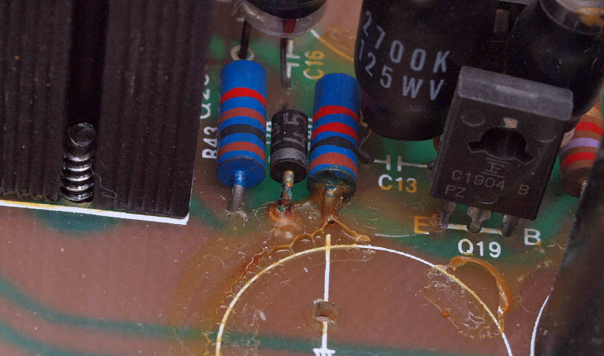 C212. 修理中 L側電源基板、 電解コンデンサー固定用の接着材、当時は溶媒にトルエンが使用されており、銅を腐食する。