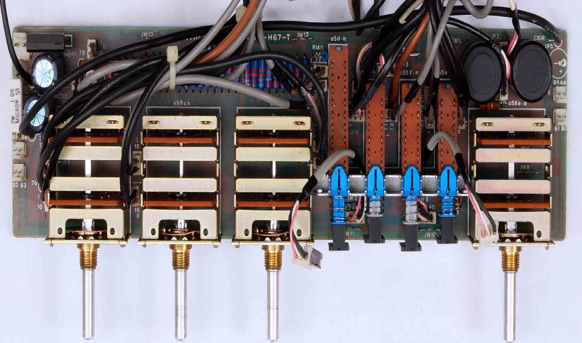 CC41. 修理前 SW基板、 左=REC、 中=入力、 右=テープ。