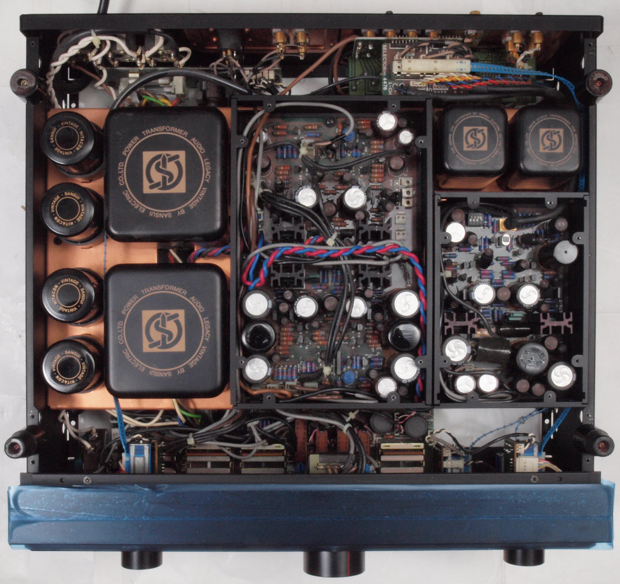 | CD1. 修理前 表示LED基板、 左=PowerAmp、 中=Adaptor・Muting・SourceDirect・SUBsonic、 右=テープREC。 | ||||||||||||||||||