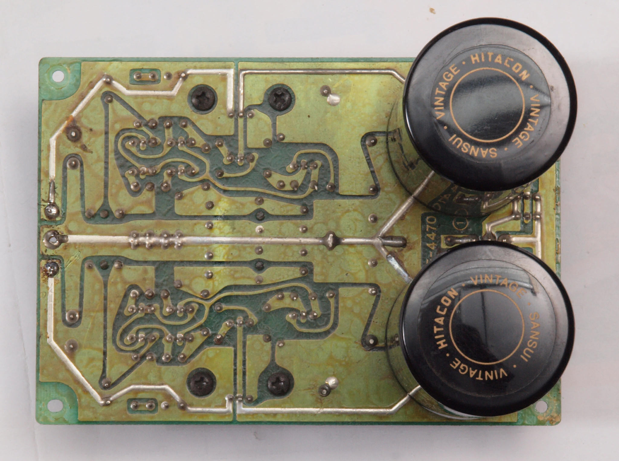 | C412. 修理中 R側AMP基板、 電解コンデンサー固定用の接着材、当時は溶媒にトルエンが使用されており、銅を腐食する。 | ||||||||||||||||||