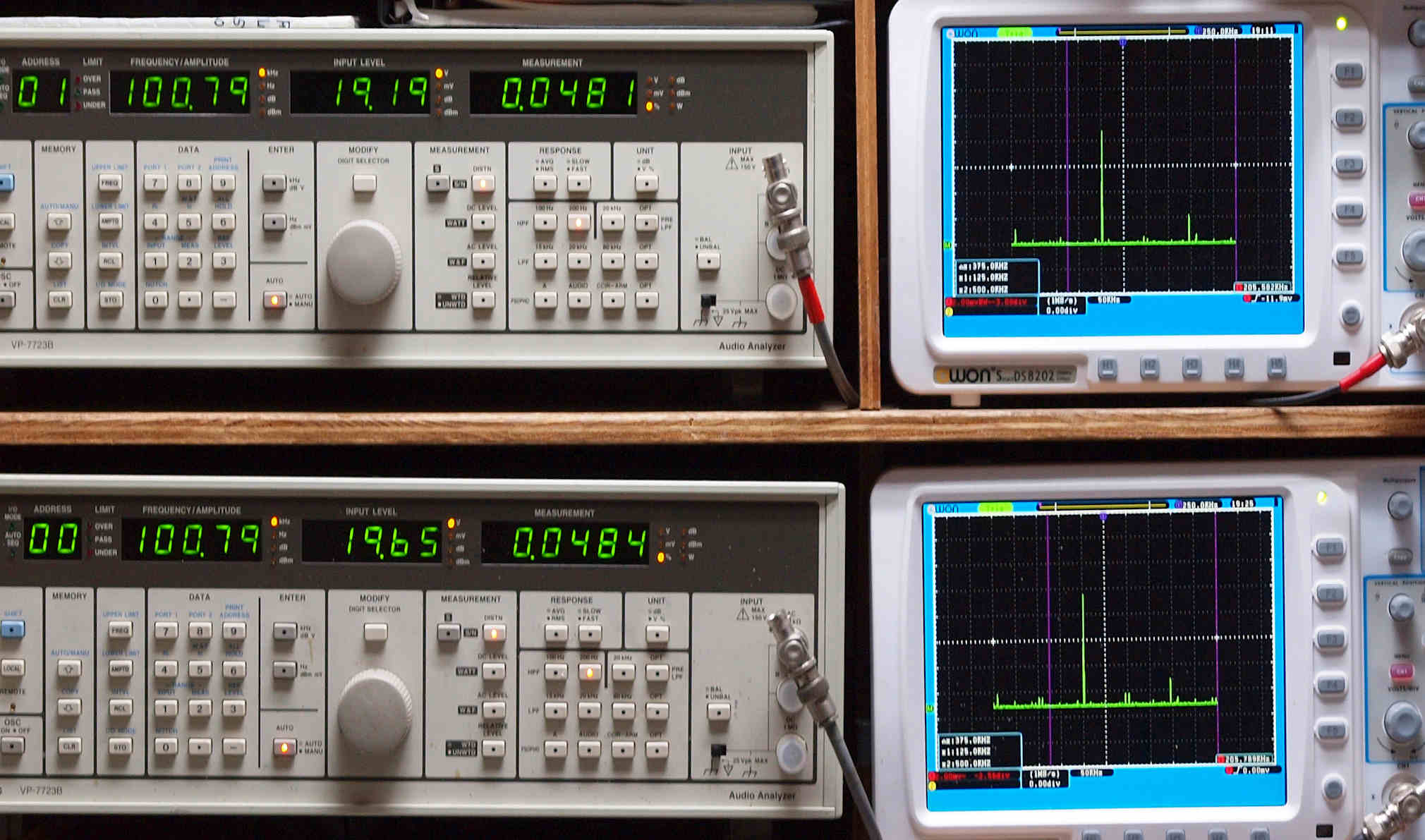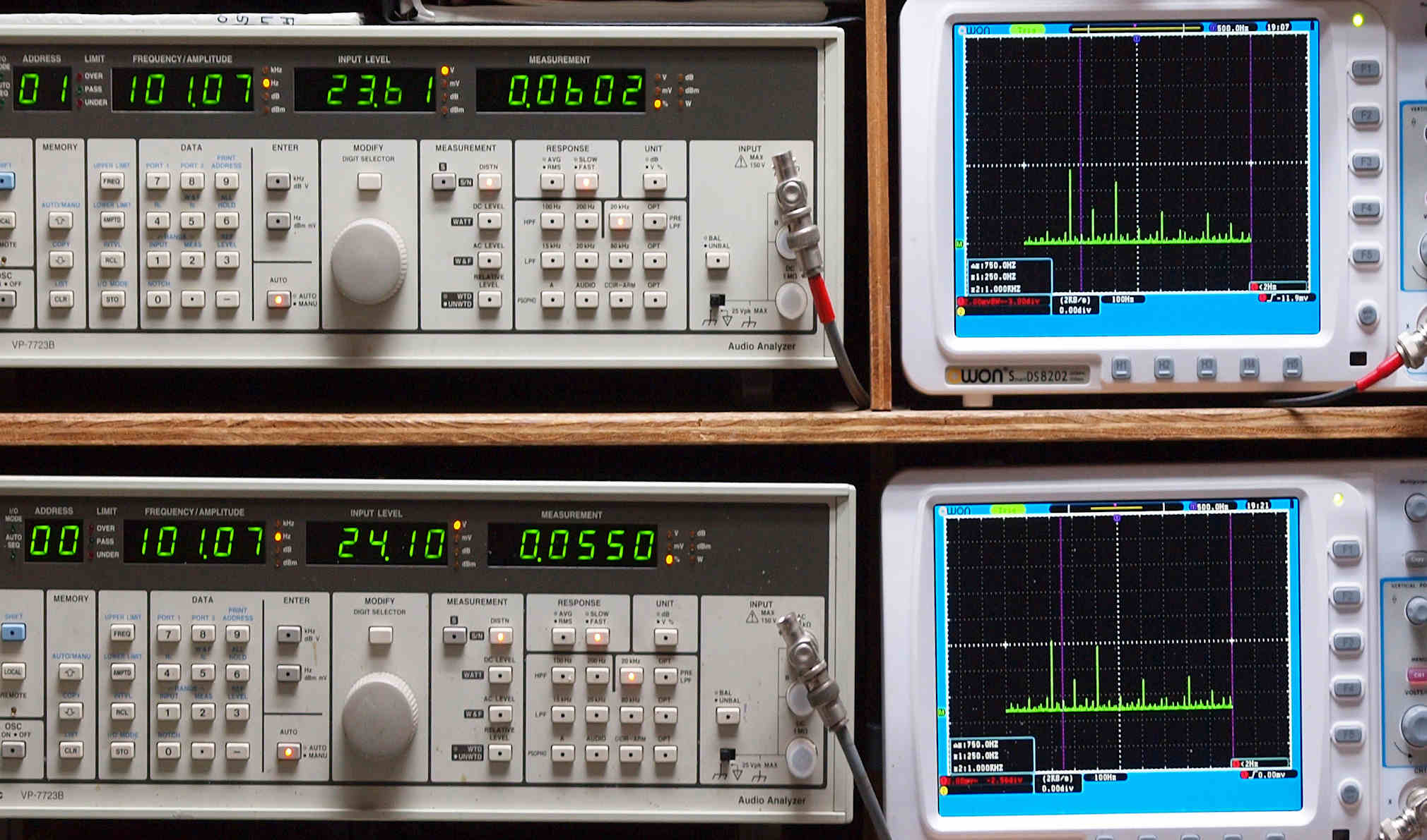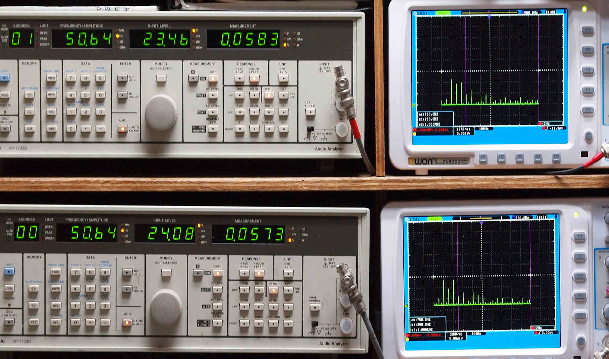 | E. 測定・調整 E1. 出力・歪み率測定・調整 「見方」。 上段中 右側SP出力を「Audio Analyzer Panasonic VP−7723B」により測定。 表示LED、 左端=メモリーNo、 中左=周波数測定、 中右=出力電圧測定、 右端=歪み率測定。 上段右端 VP−7723Bの基本波除去出力を「owon SDS8202(200MHZ)」で「FFT分析」表示。 下段中 左側SP出力を「Audio Analyzer Panasonic VP−7723B」により測定。 表示LED、 左端=メモリーNo、 中左=周波数測定、 中右=出力電圧測定、 右端=歪み率測定。 下段右端 VP−7723Bの基本波除去出力を「owon SDS6062(200MHZ)」で「FFT分析」表示。 下段左端 オーディオ発振器 VP−7201A より50Hz〜100kHzの信号を出し(歪み率=約0.003%)、ATT+分配器を通し、AMPに入力。 よって、ダイアル設定出力レベルより低くなります。測定機器の仕様や整備の様子はこちら、「VP−7723B」「VP−7201A」。 FFT画面の見方はこちら。 |